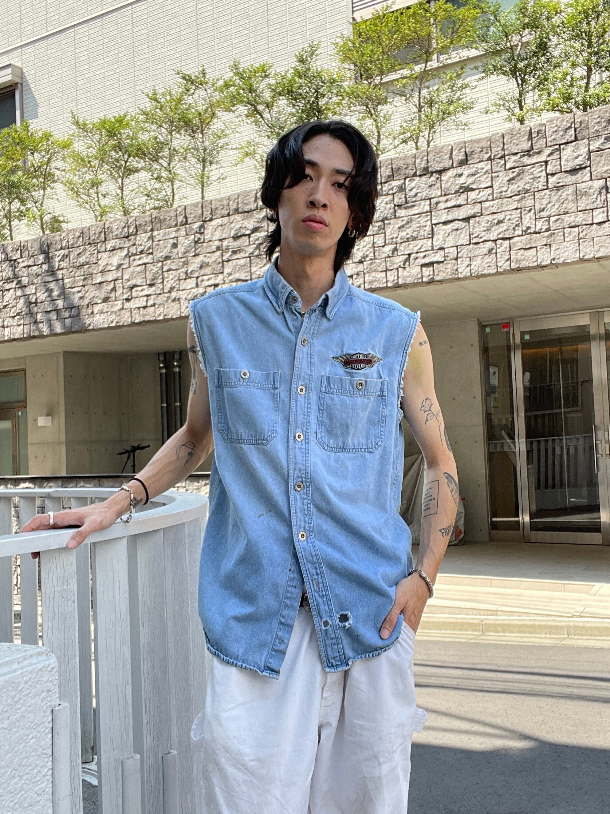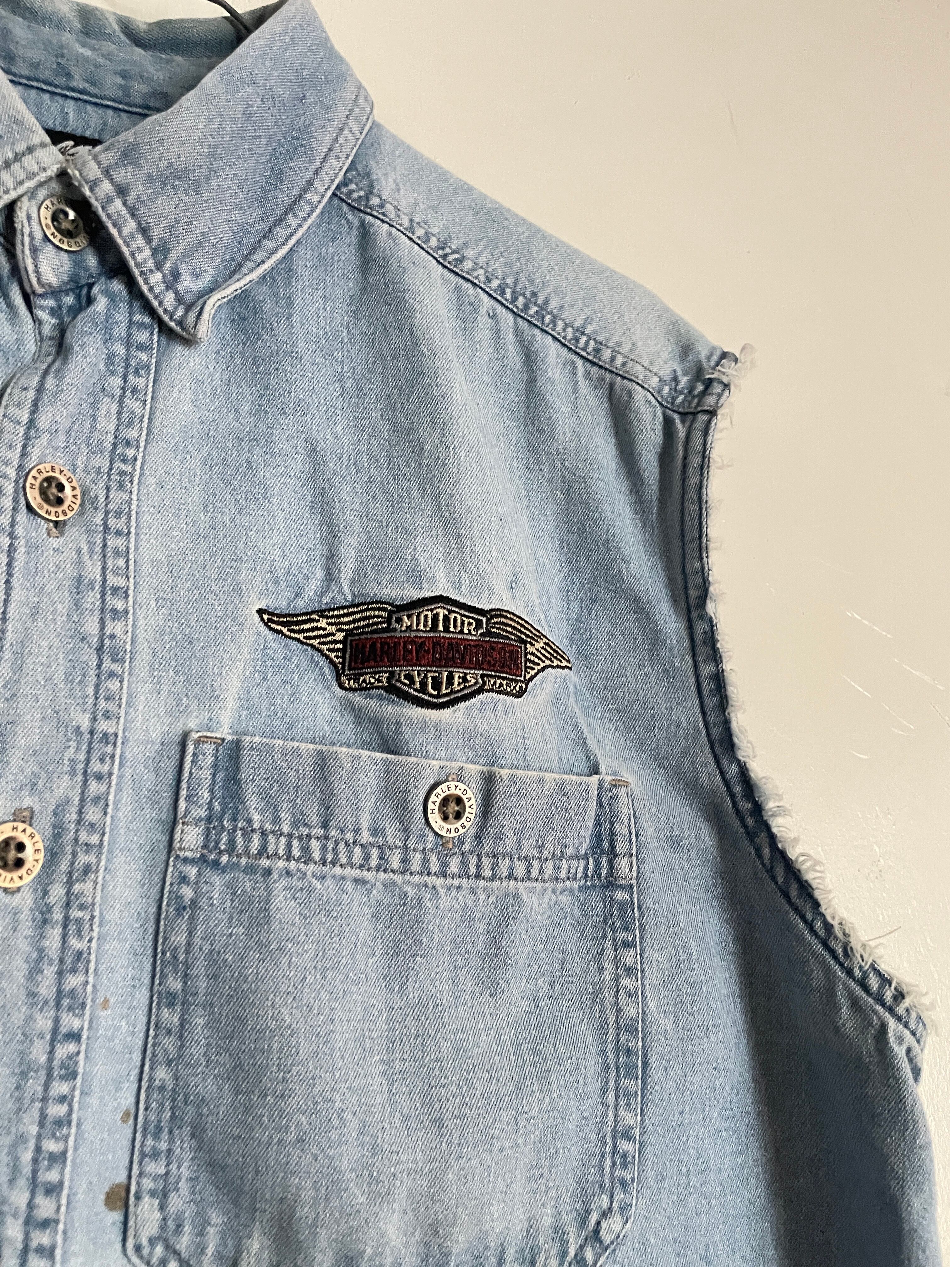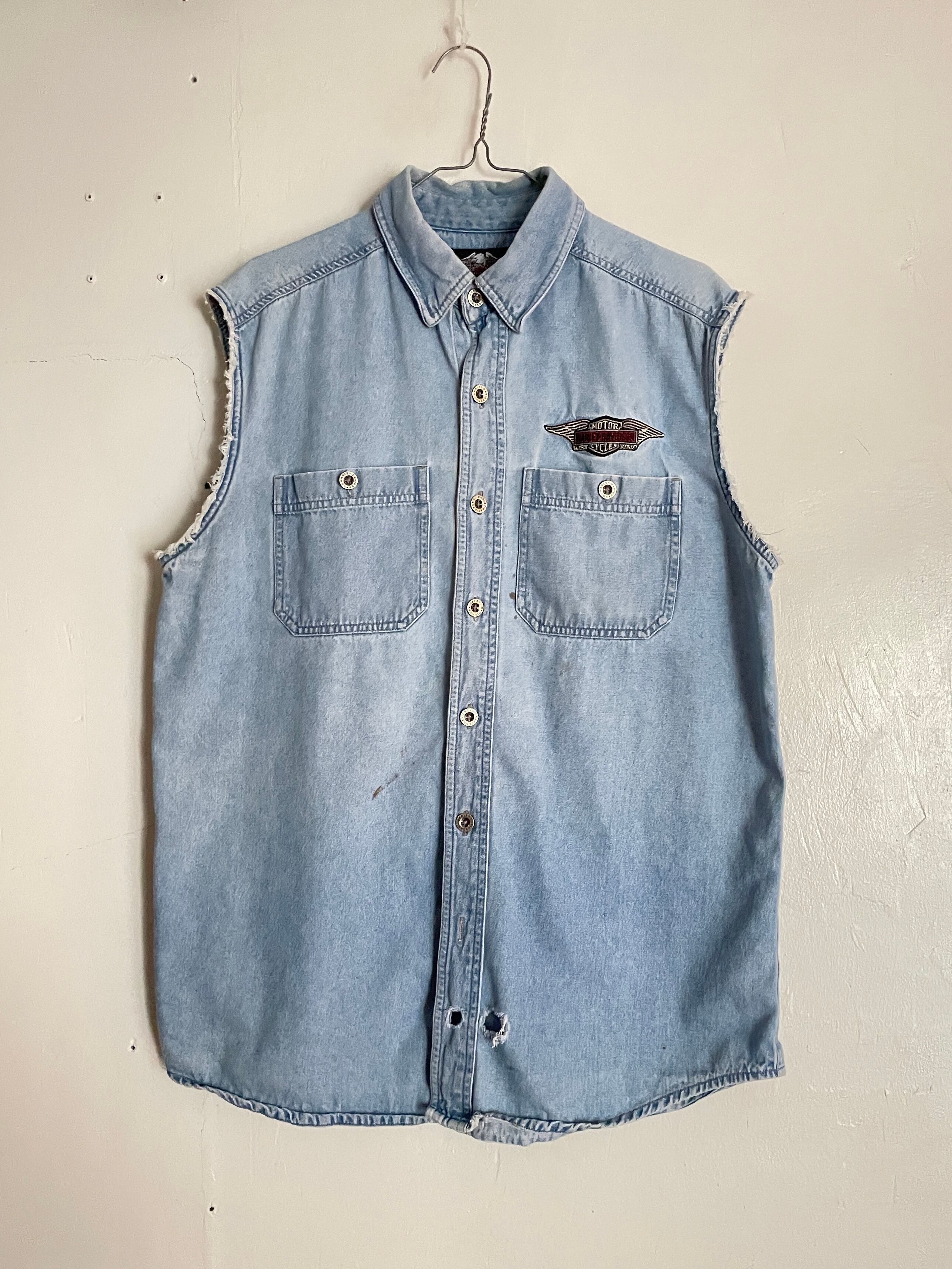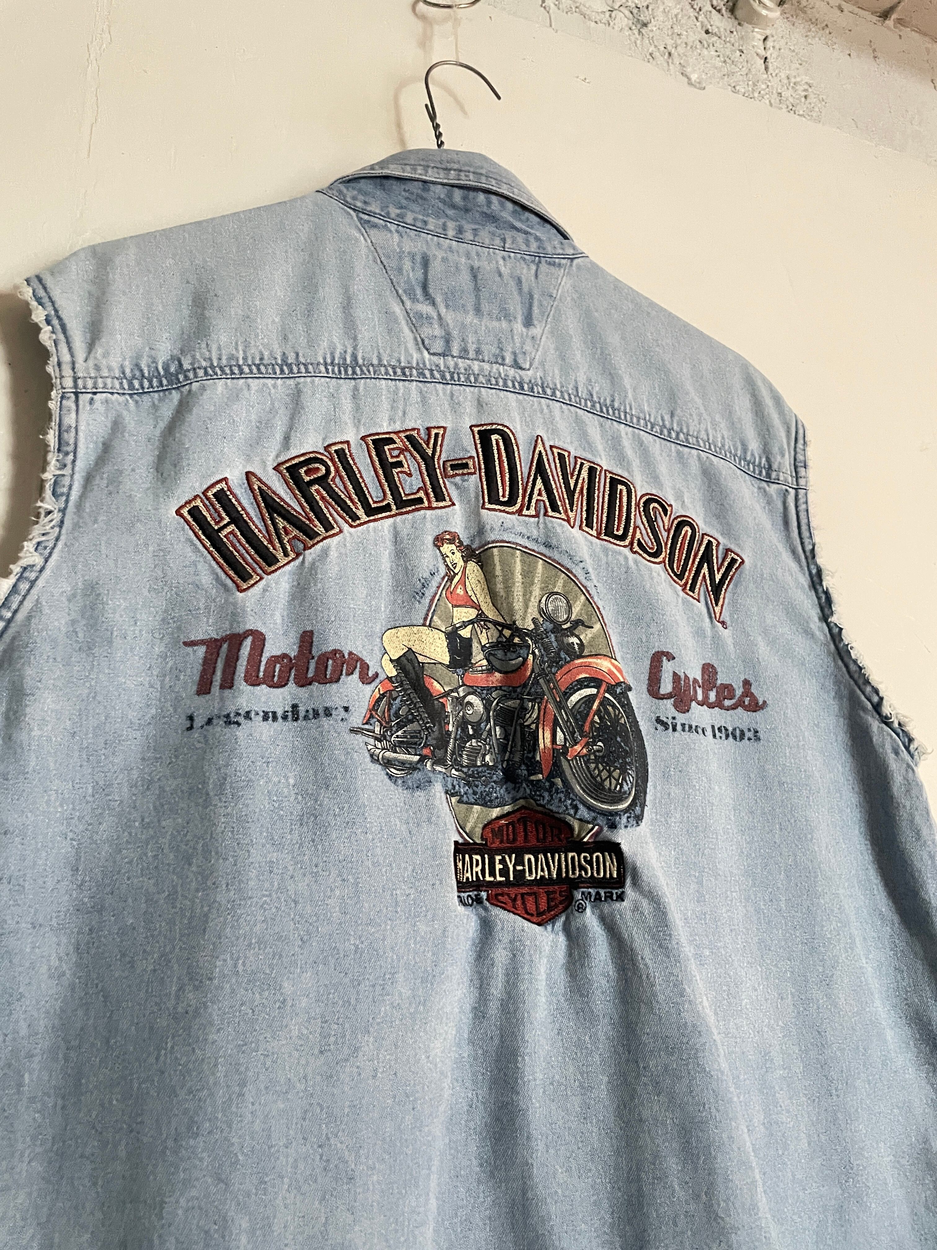 Old HARLEY-DAVIDSON Embroidery Printed Design No Sleeve Denim Shirt