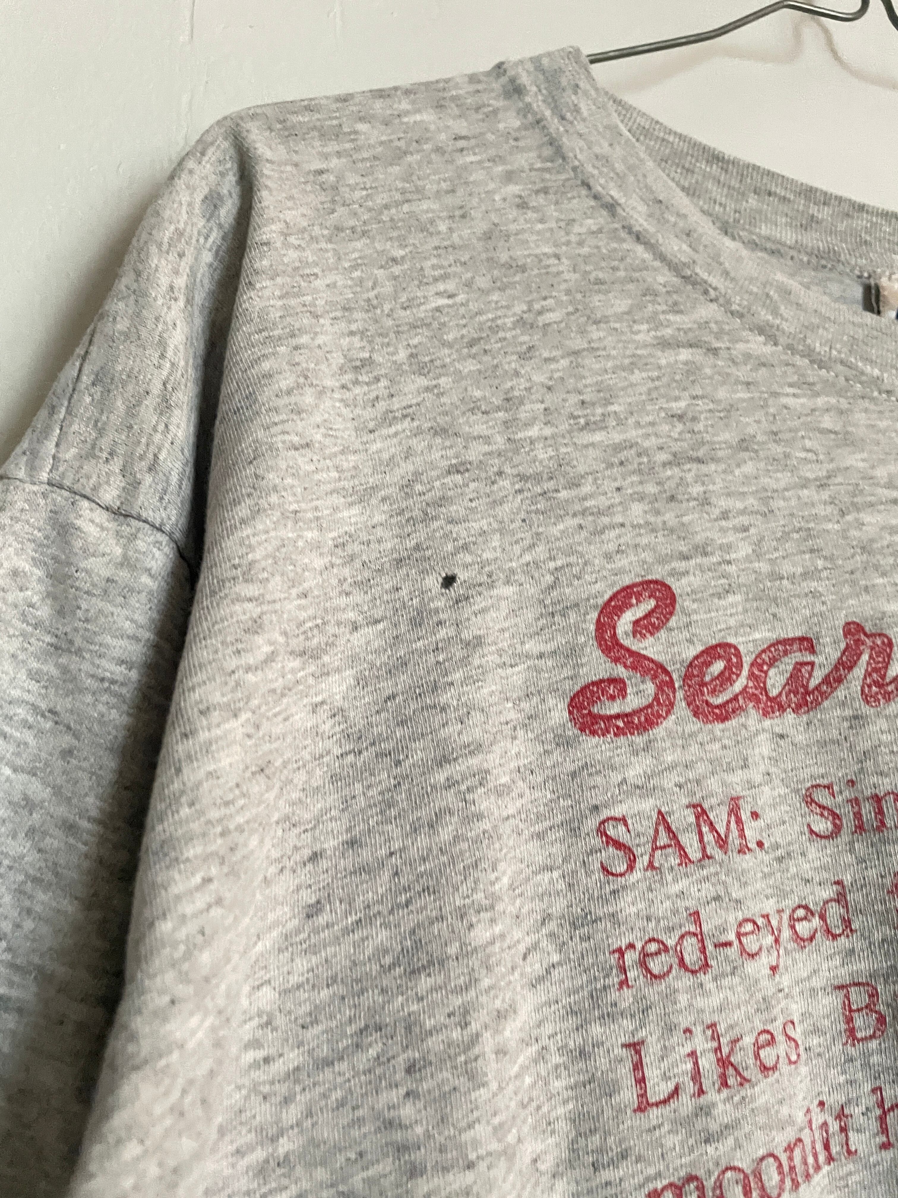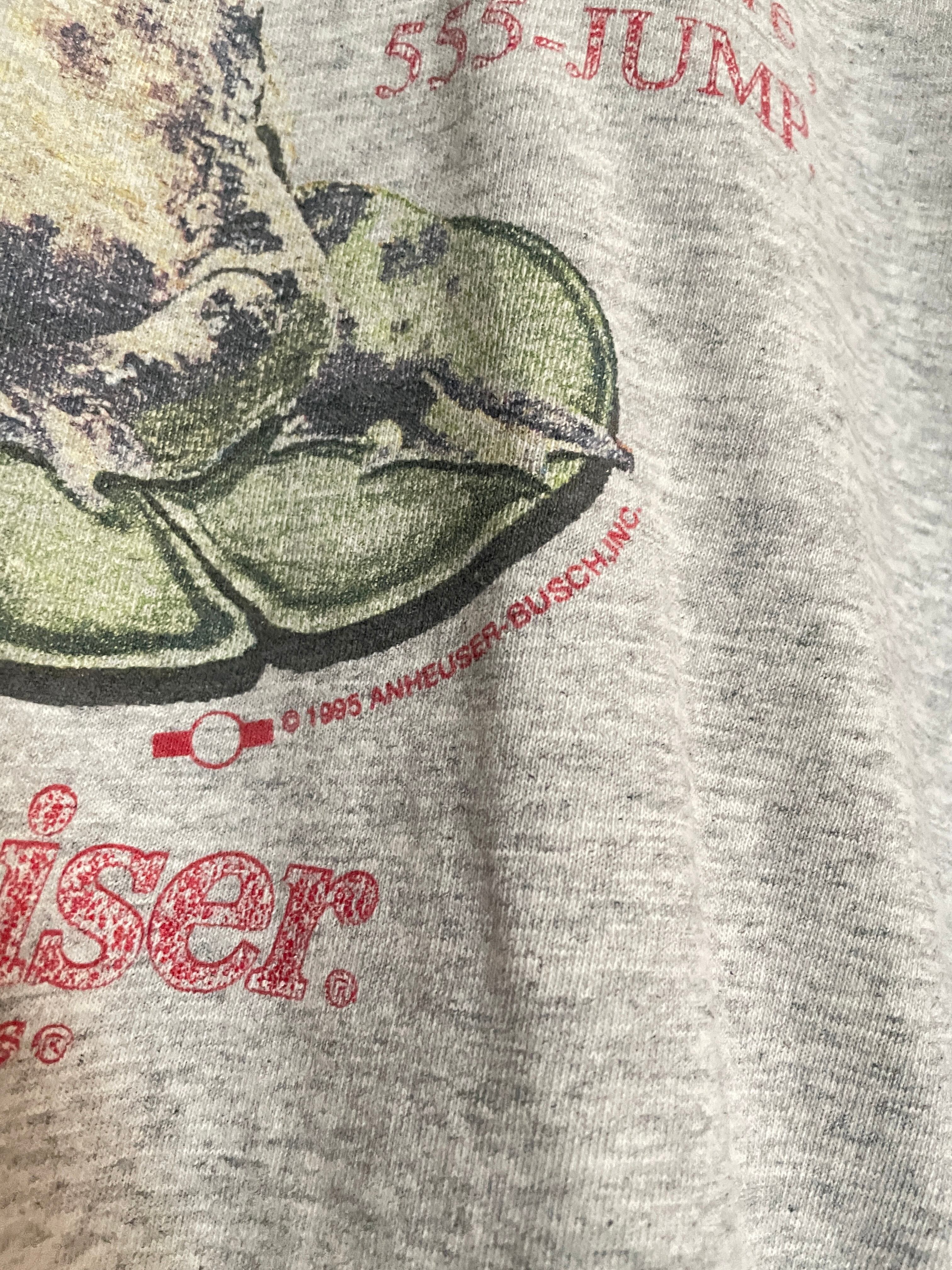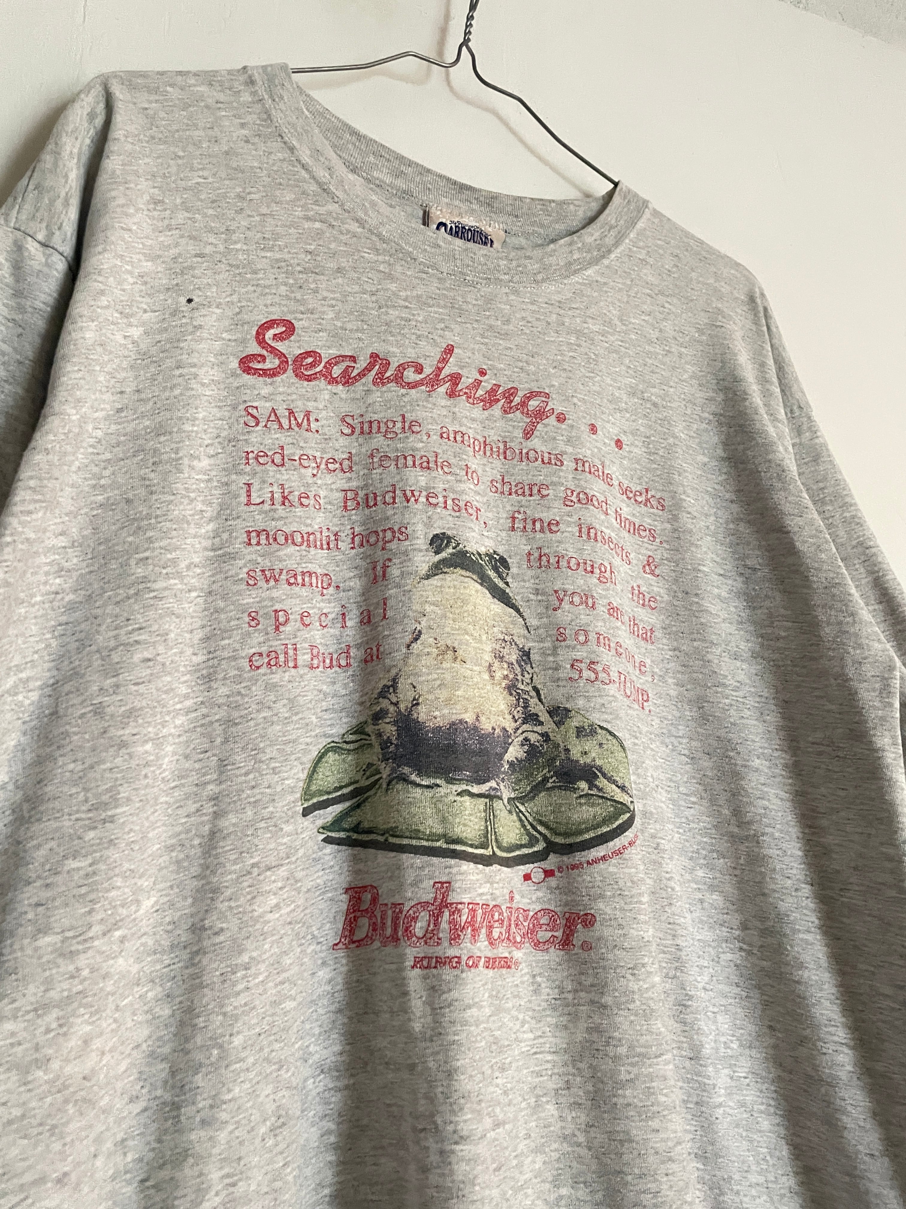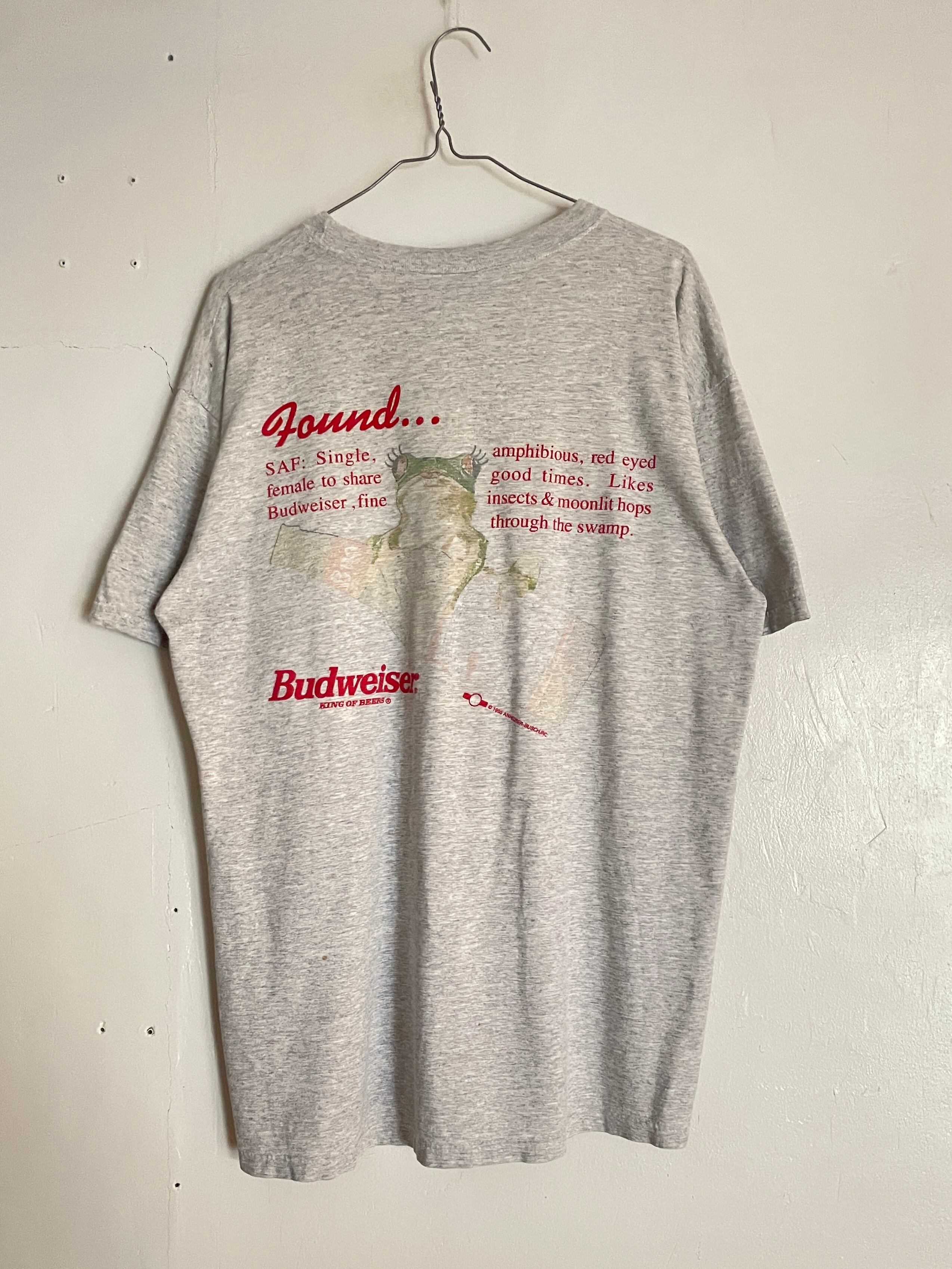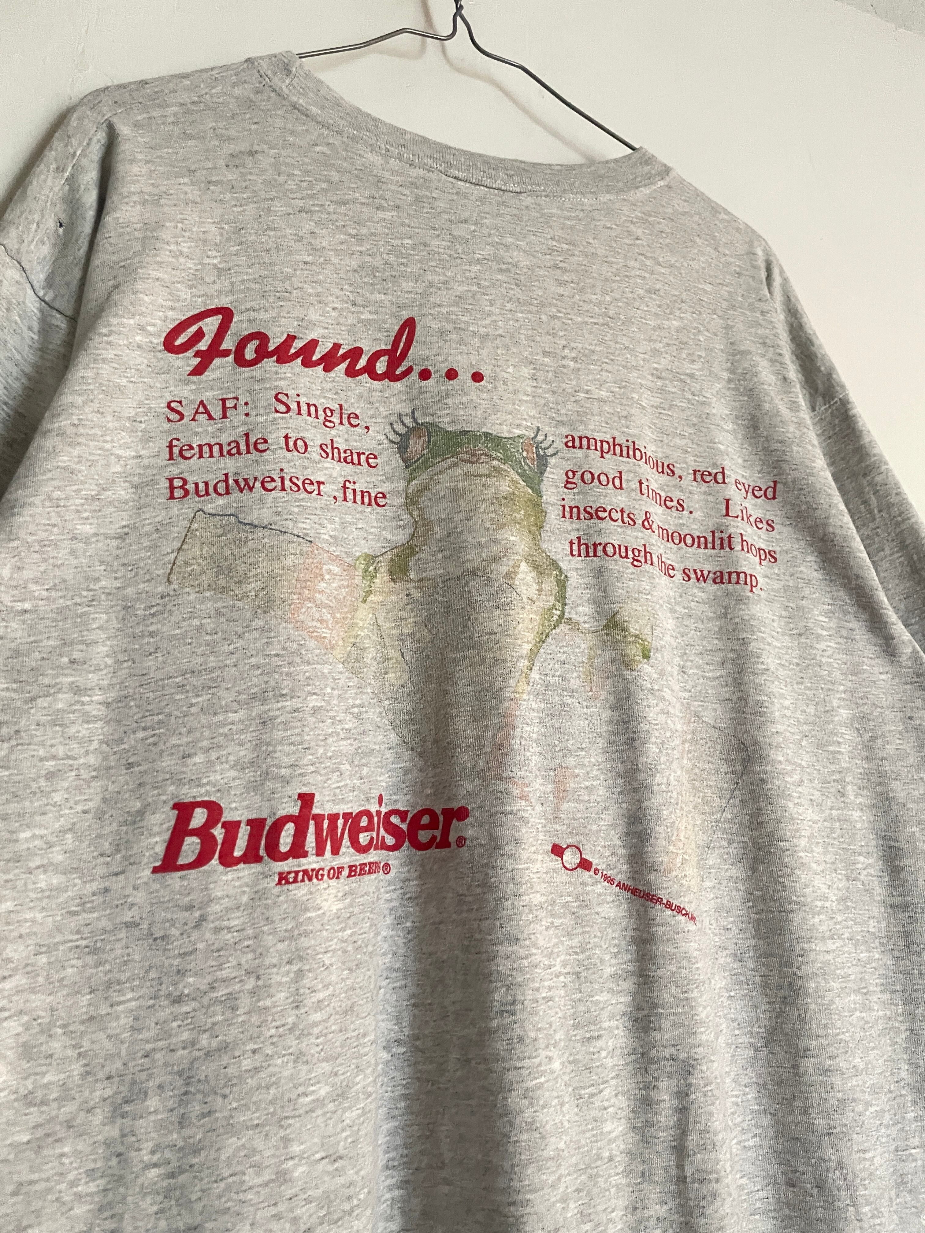 グレーボディに、リアルな蛙とメッセージプリントが両面に施されたTシャツ。ビールで有名なバドワイザーのネームロゴも入っています。やや掠れたプリントデザインがかなりクールです。両面でまた違った蛙、メッセージなのも面白いです。ゆったりとしたサイズ感で、今の時期にはラフに一枚で決まってくれるTシャツかと思います。USA製なのも魅力的です。