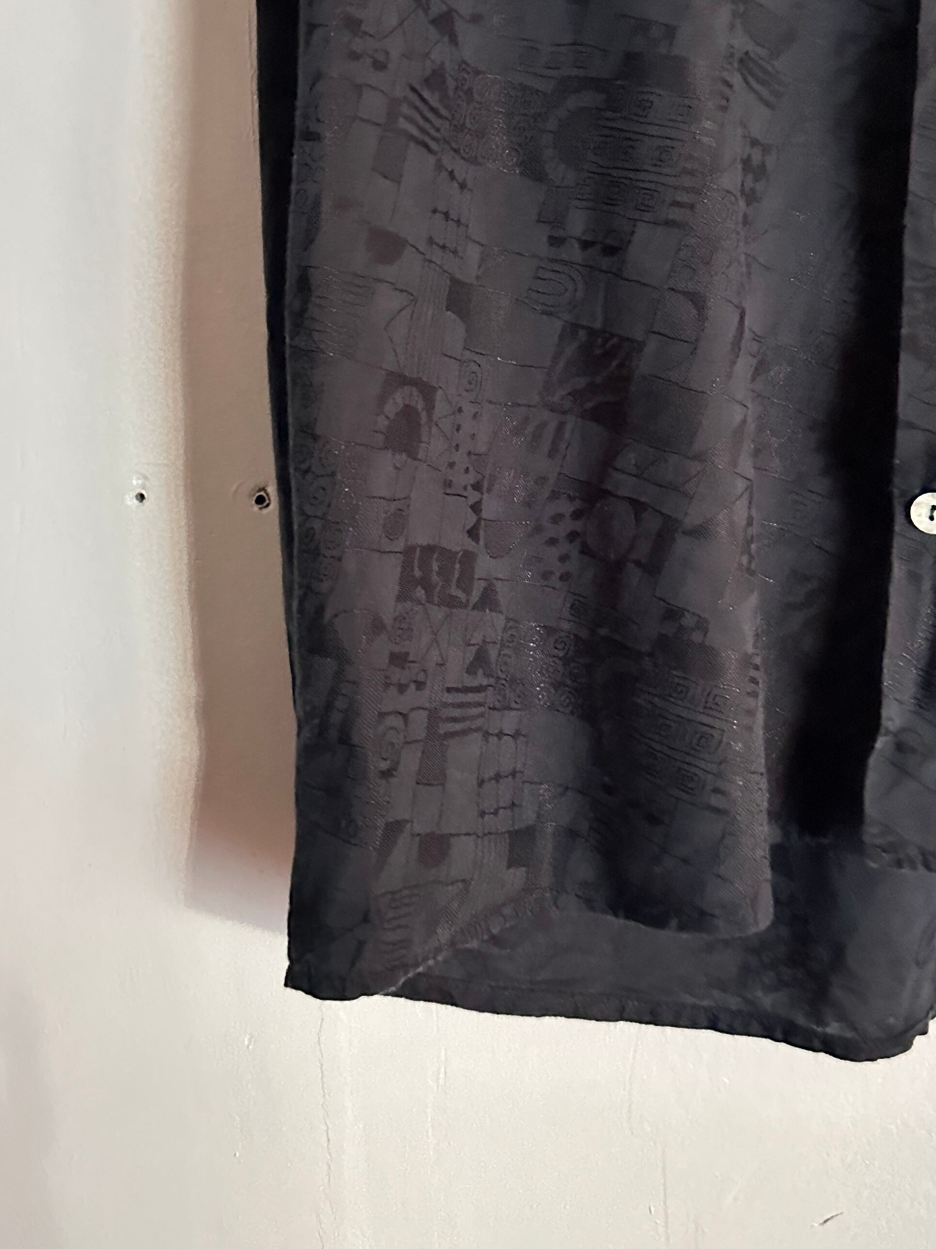 黒地のシャツに光沢のある刺繍糸で細かいデザインが入った長袖シャツ。サイズ感は少しゆったりめで、太いスラックスやデニムとの相性抜群です。またブラックシャツベースなので、カジュアルシーンはもちろんドレスシーンでも存在感を発揮してくれる1枚です。