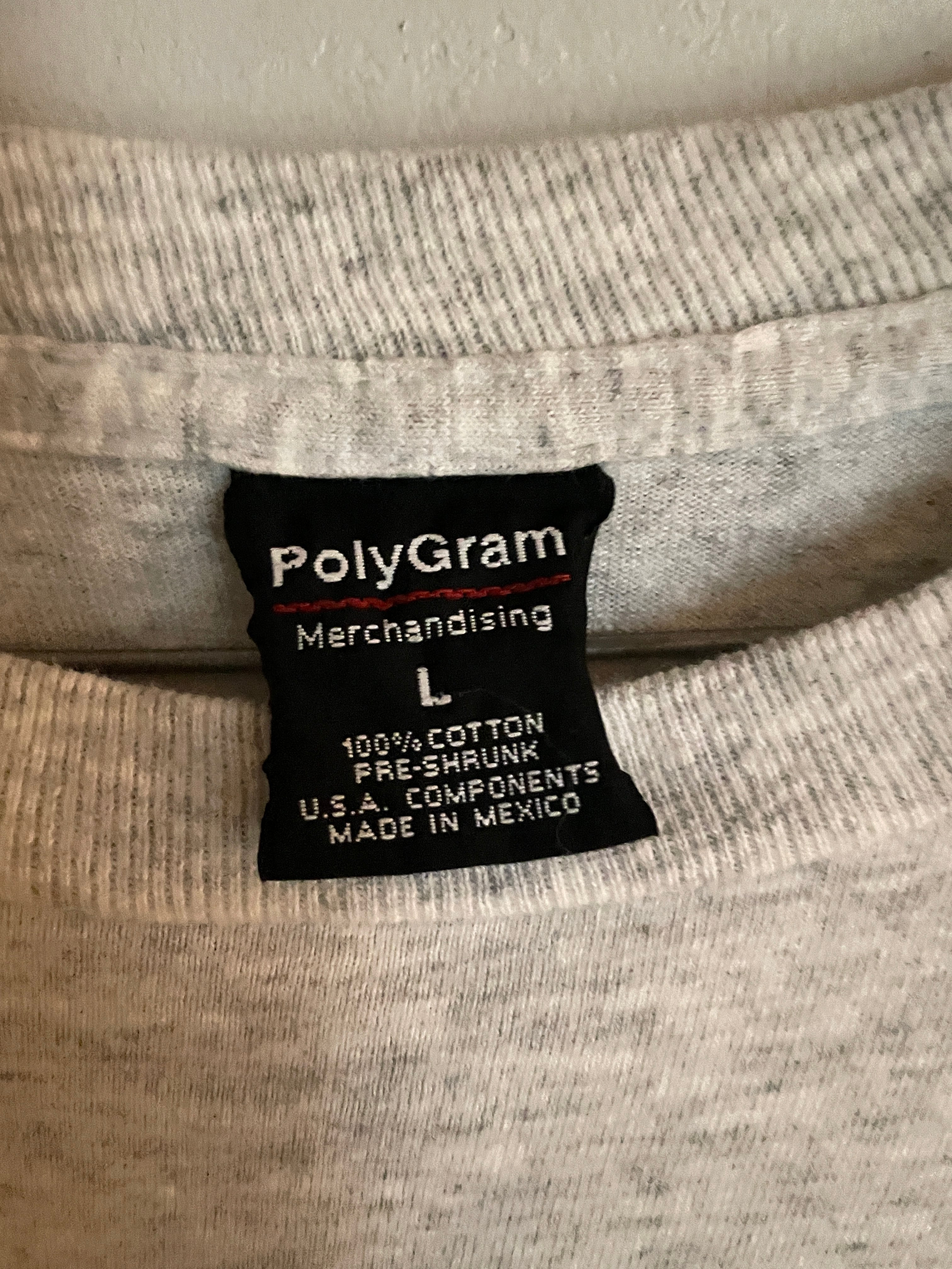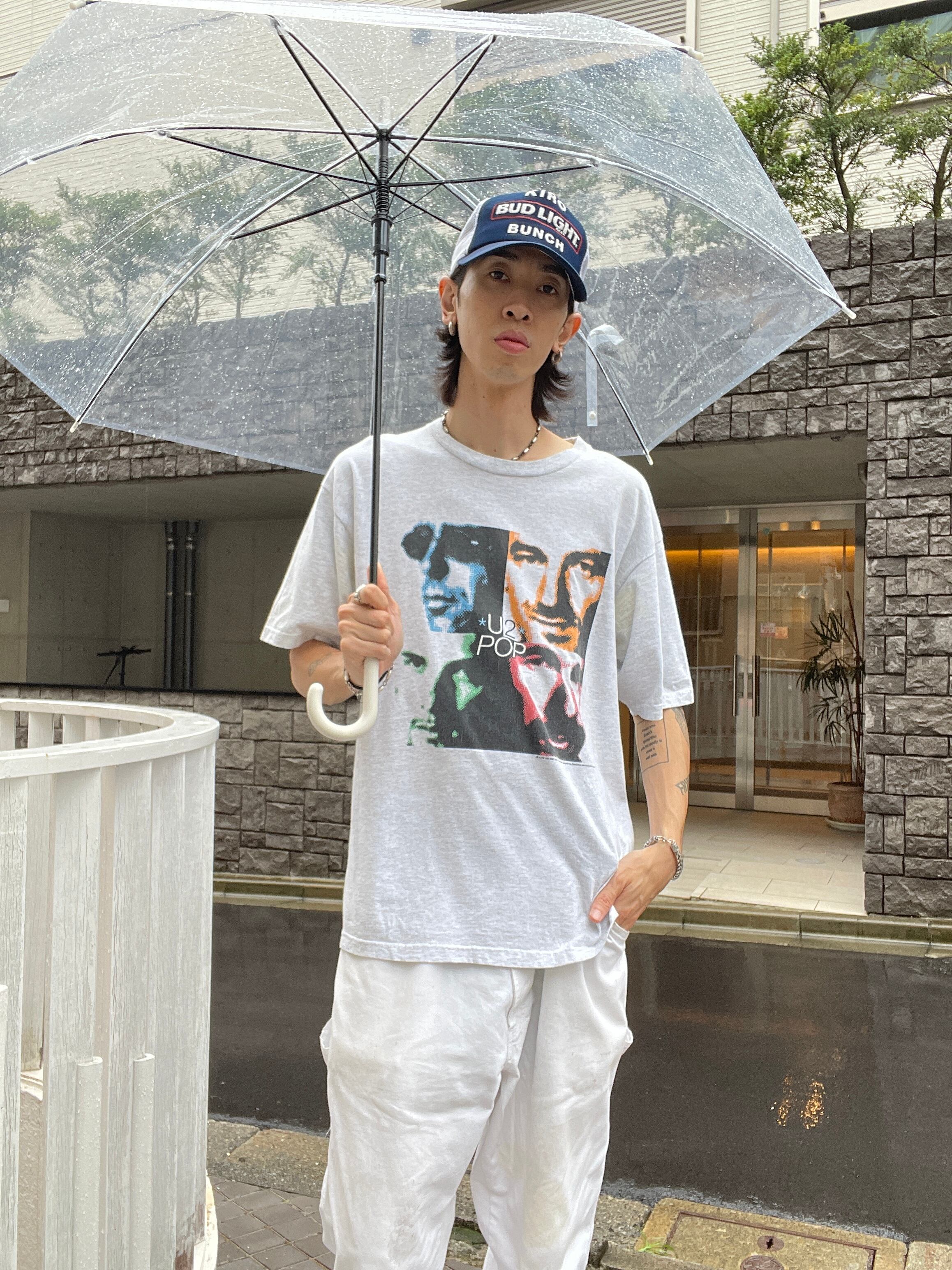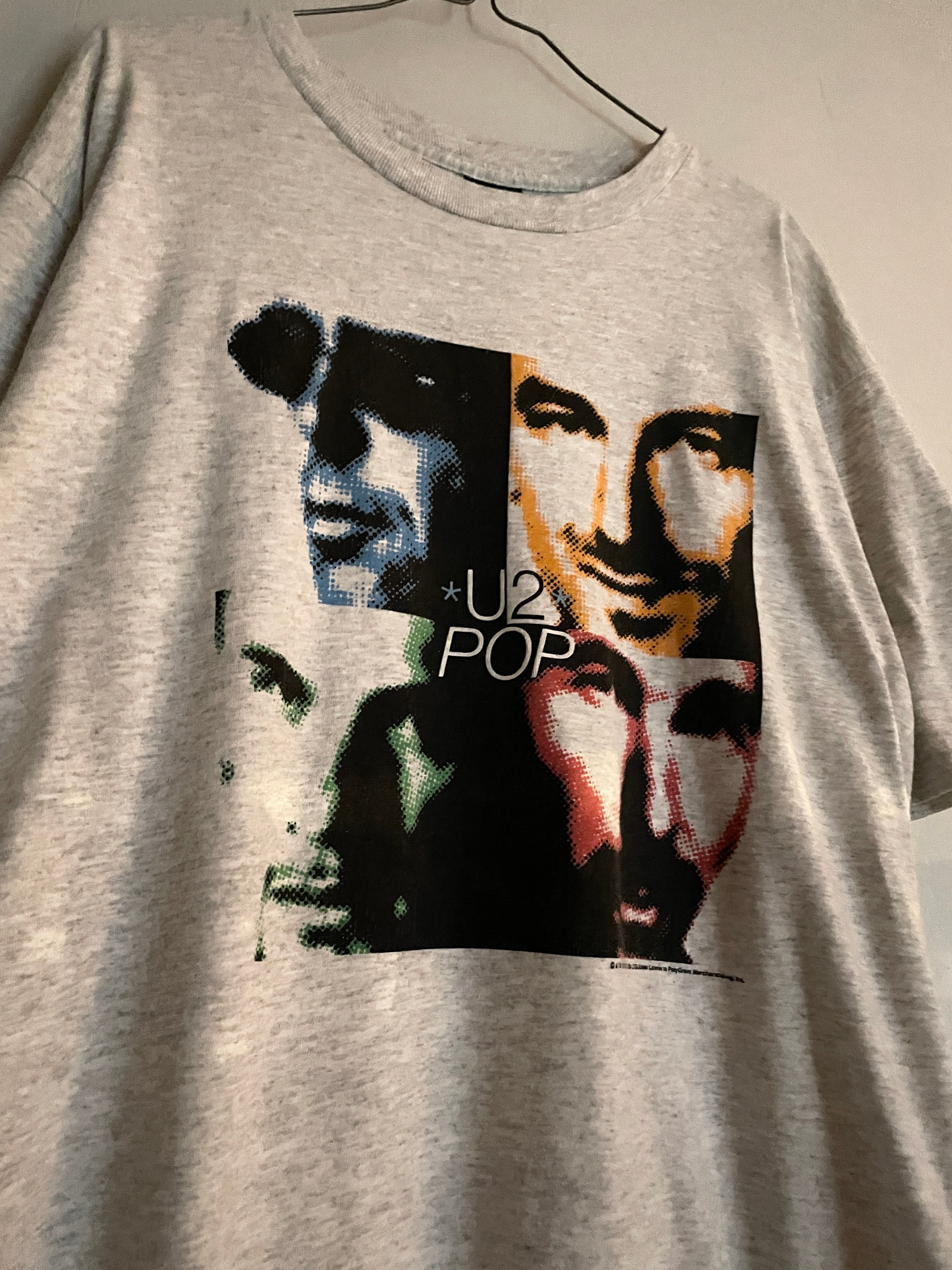 杢グレーボディに、アイルランドの人気ロックバンド”U2"のアルバム”POP"のジャケットプリントが施されたTシャツ。97年に行われたPop Martワールドツアーの時のプリントデザインです。前は色で分かれたお洒落なメンバープリント。バックには真ん中を囲うようにして、ツアーで回った国名がぐるっとプリントされています。バンドTならではの魅力が詰まったかっこいい一着です。