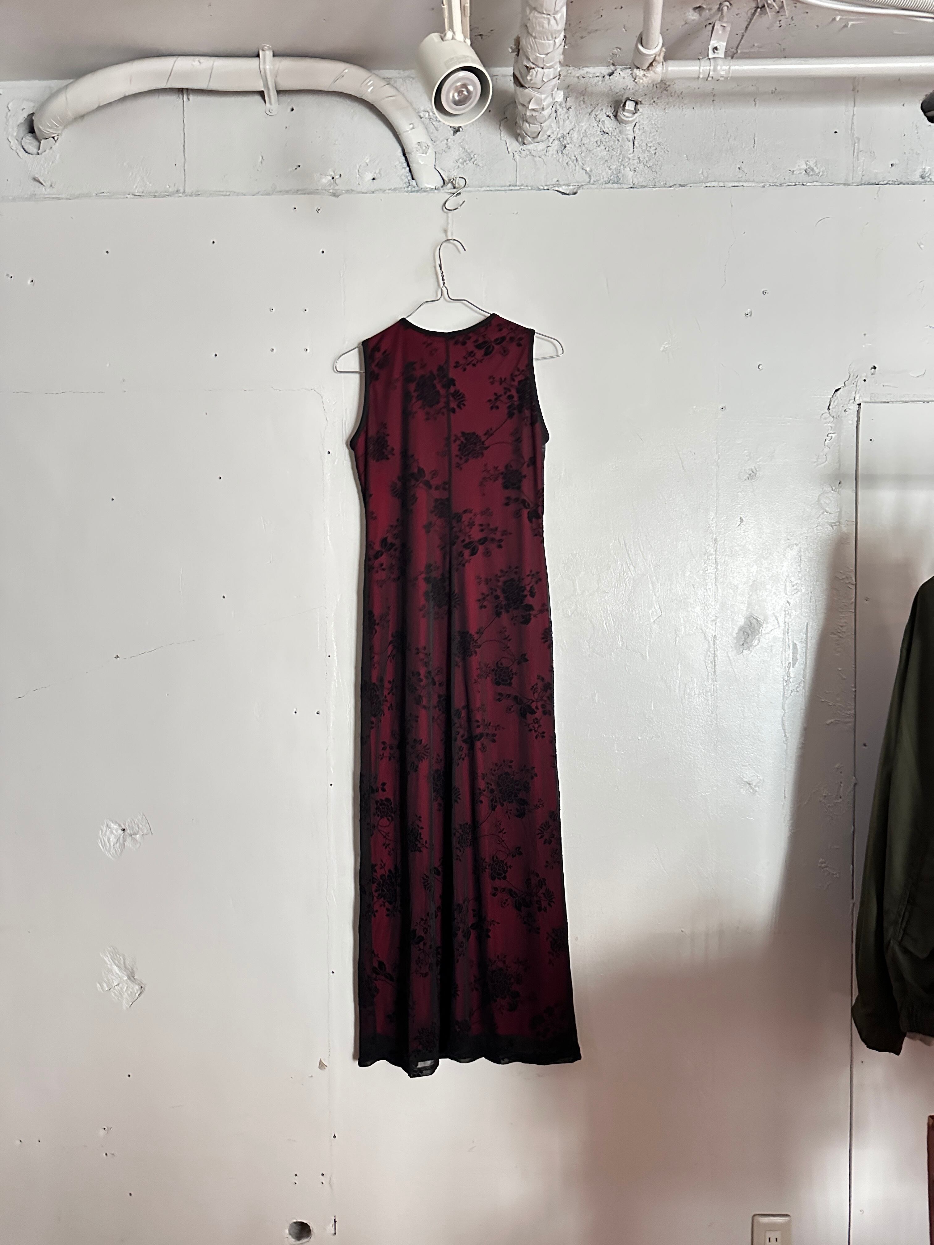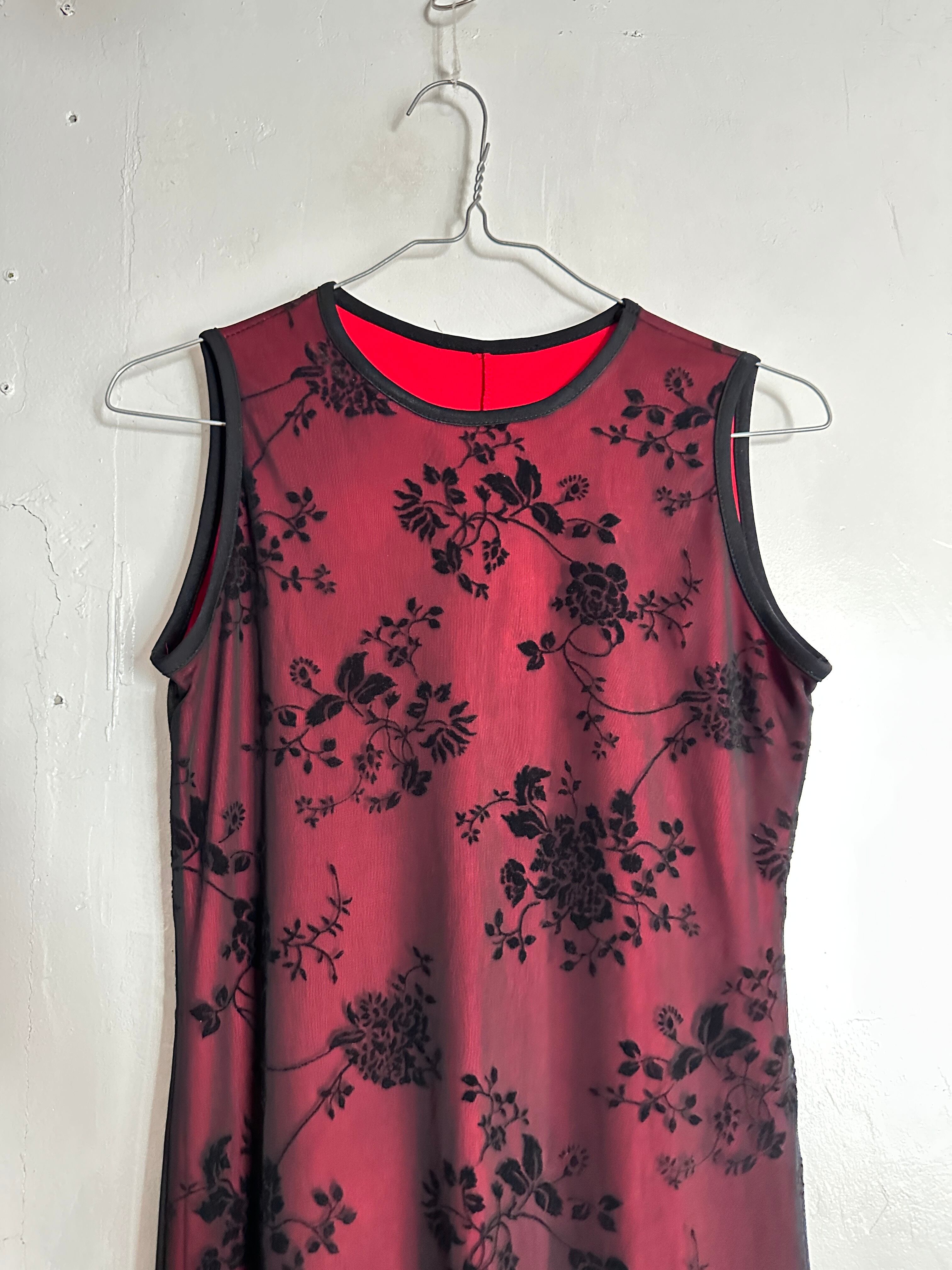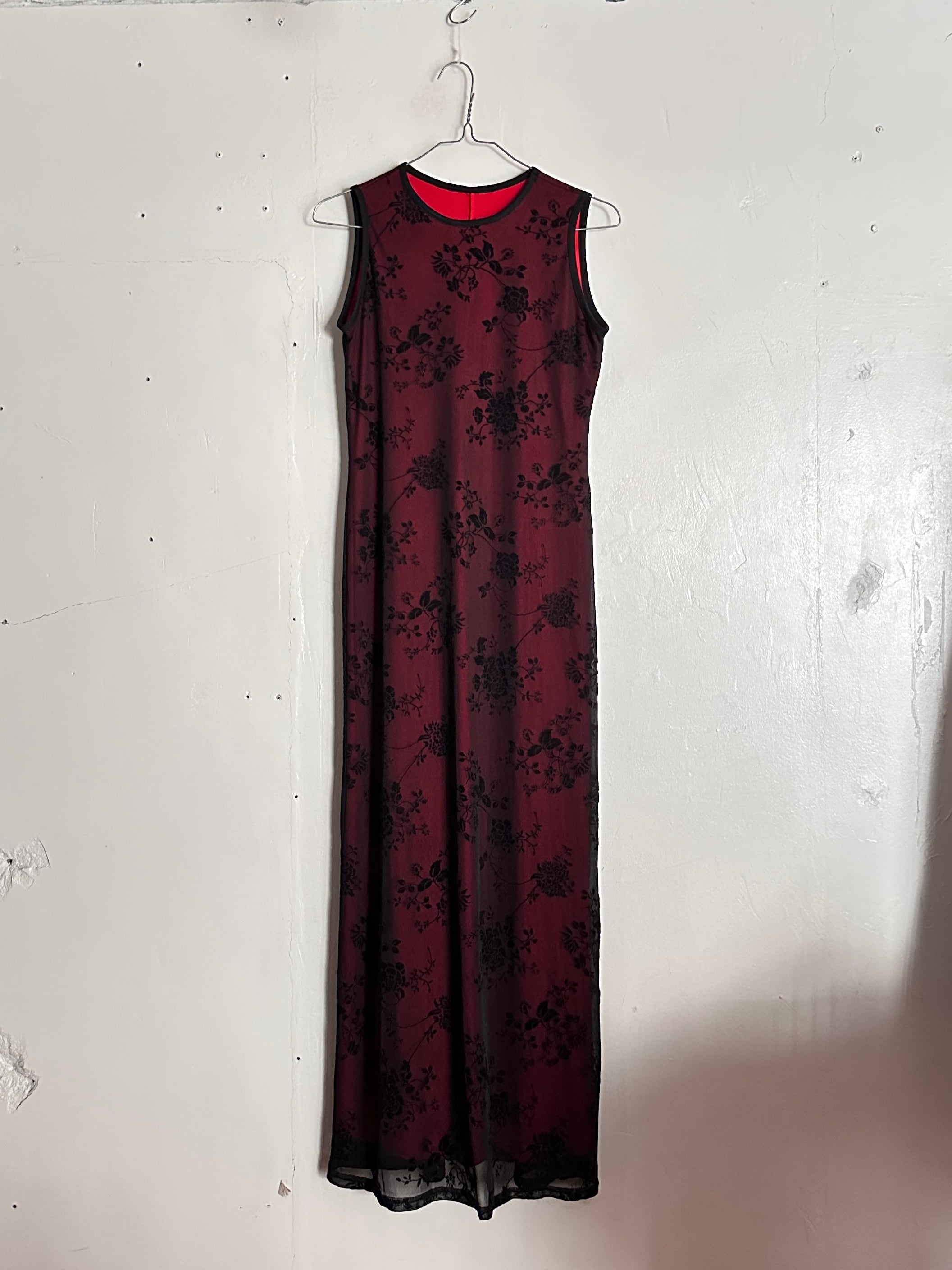 女性らしいカラーリングのドレス。赤地にシアーを重ねたフェイクレイヤードになっていて、よく見ると全体に花柄の刺繍が施されています。ドレスというだけあって着丈が非常に長く程良いドレープ感もあるため、1枚で着るのはもちろんテーラードジャケットなどを使った綺麗めなスタイリングにも相性抜群です。