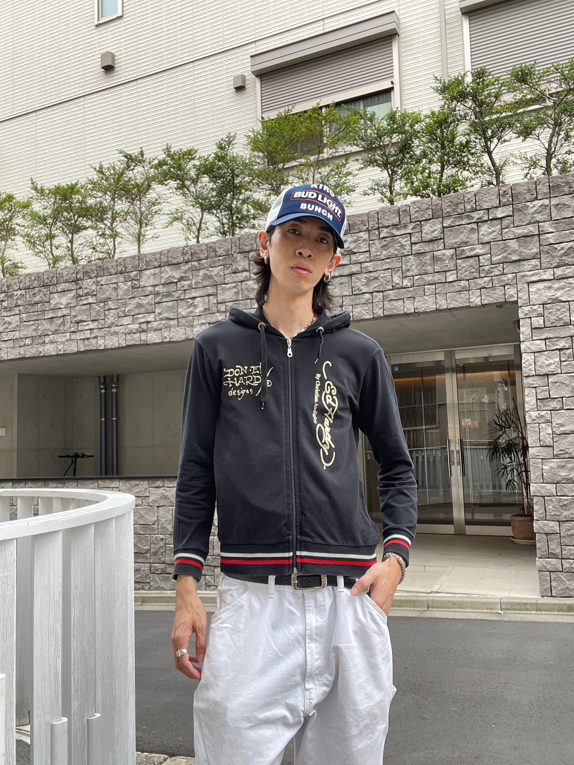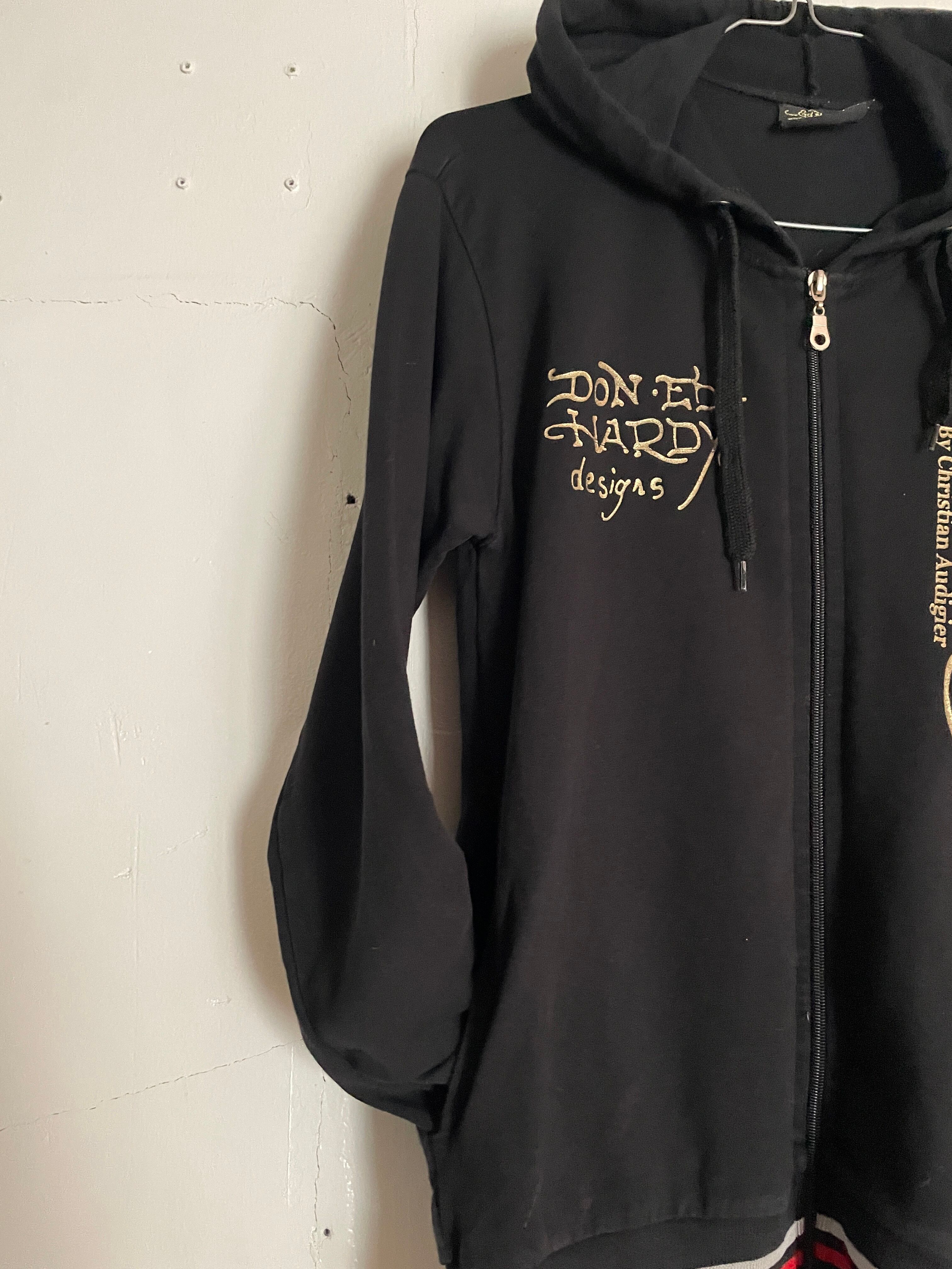 ブラックボディに、Y2Kな雰囲気のあるプリントが両面に施された、エドハーディーのジップパーカー。前はゴールドプリントで、ブロンドネームロゴ。バックにはキラッとしたビーズと、鮮やかな配色のプリントで、虎と薔薇が表現されています。ブランドらしさががっつりと感じられる、インパクト大のデザインになっています。大き過ぎず、小さ過ぎないサイズ感なので、男女共におすすめしたいお洒落アイテムです。