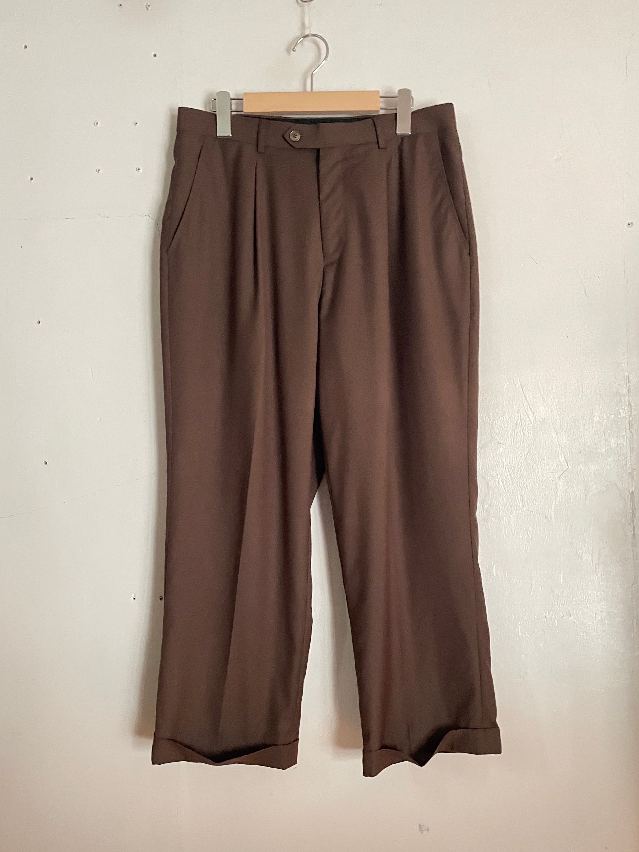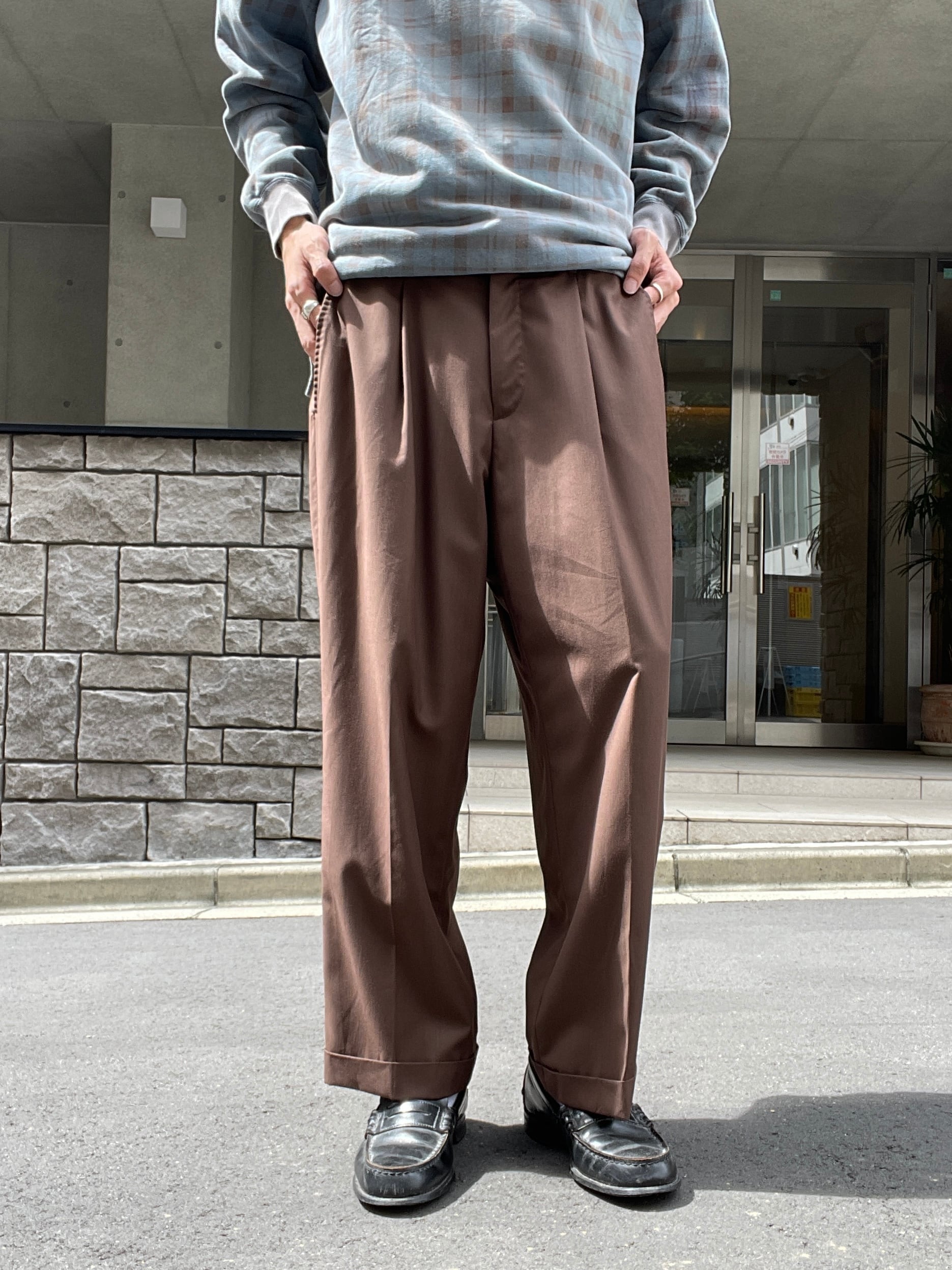 渋さのあるブラウンカラーで、1タック入った綺麗なワイドシルエットが魅力的なスラックス。サラッとした質の良いレーヨン、ポリ素材。軽くて履きやすさ抜群の一本。様々なファッションに取り入れやすいスラックスかと思います。季節問わず履ける、一本持っておいて損はしないアイテムです。