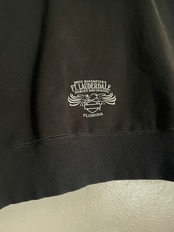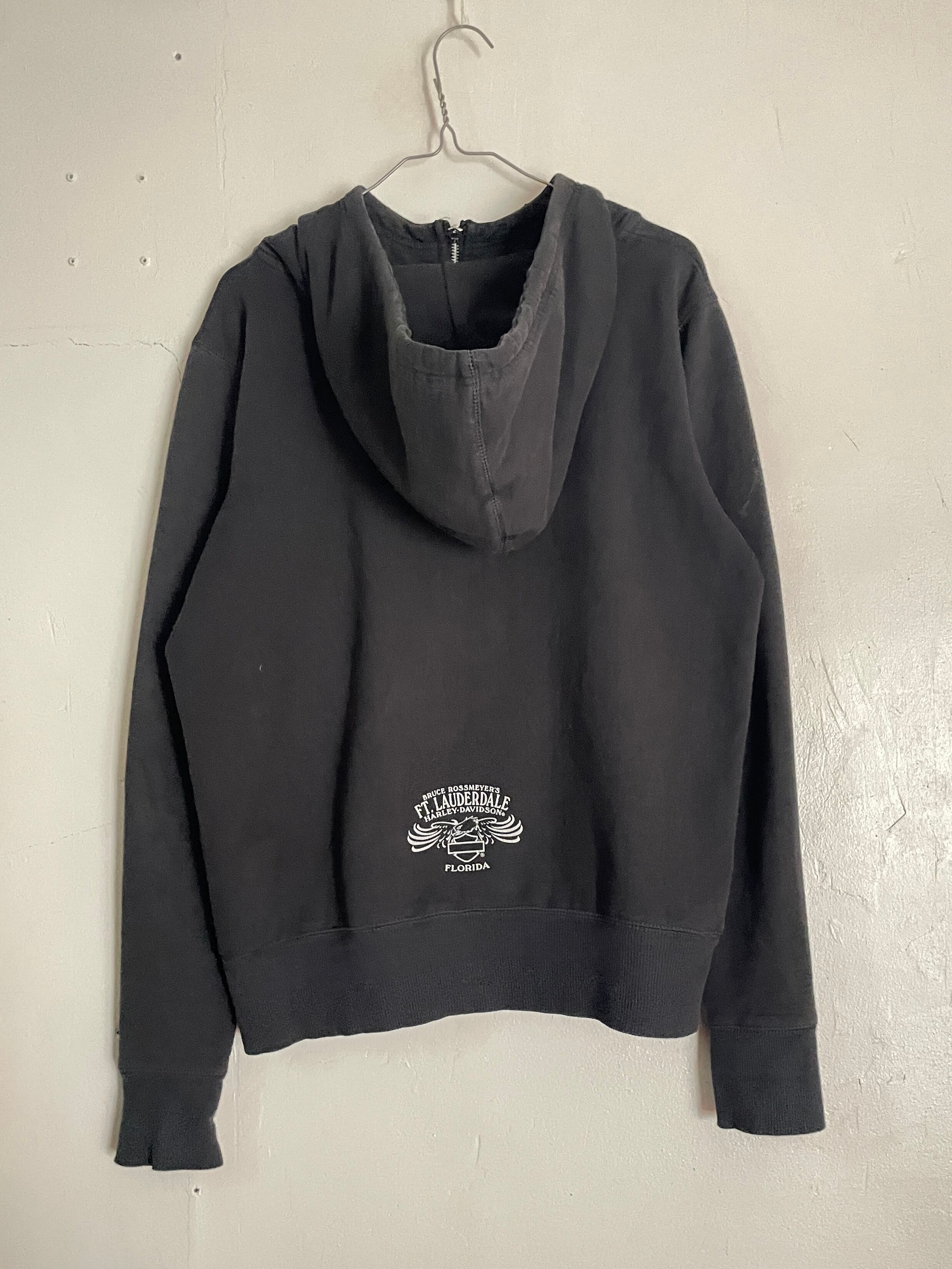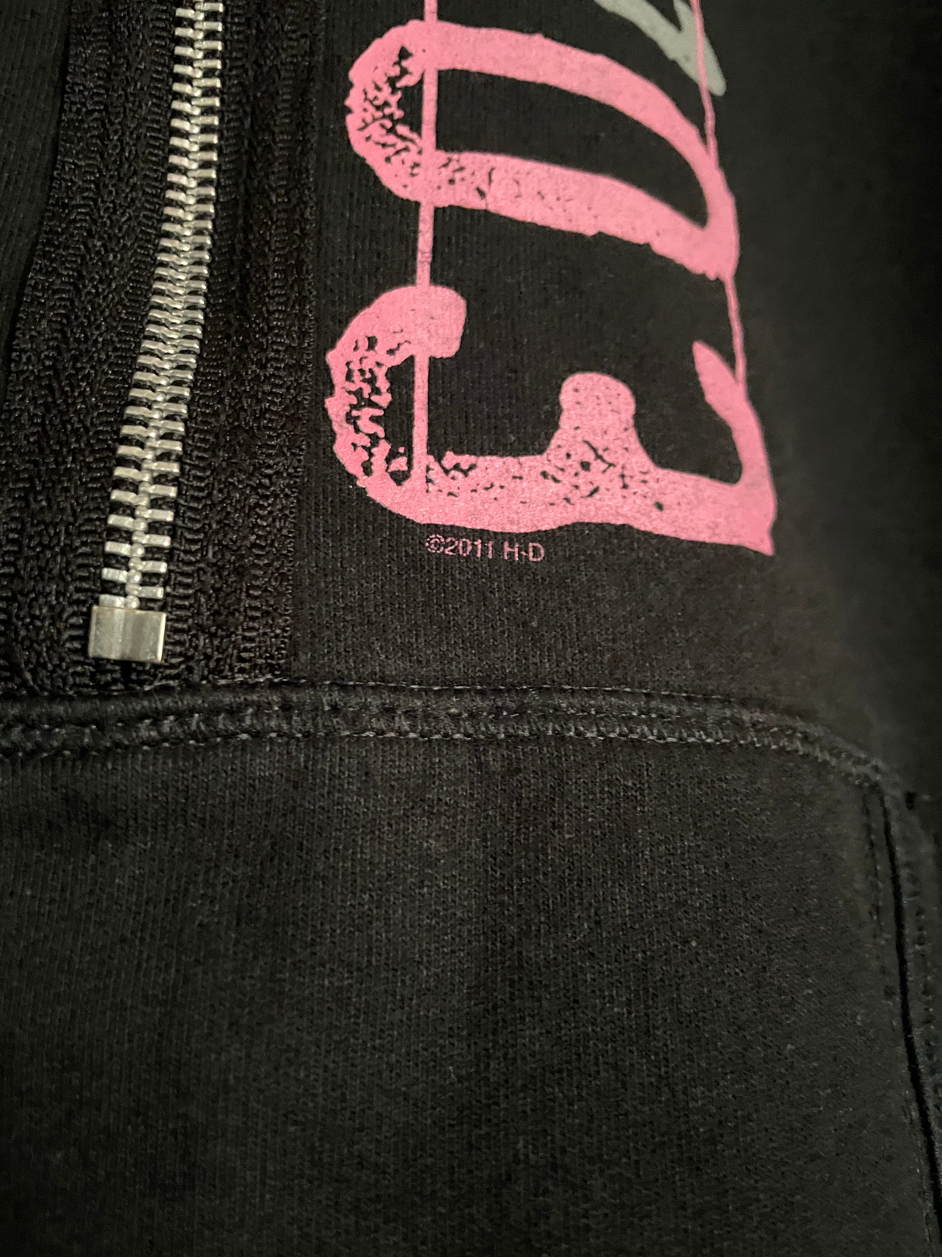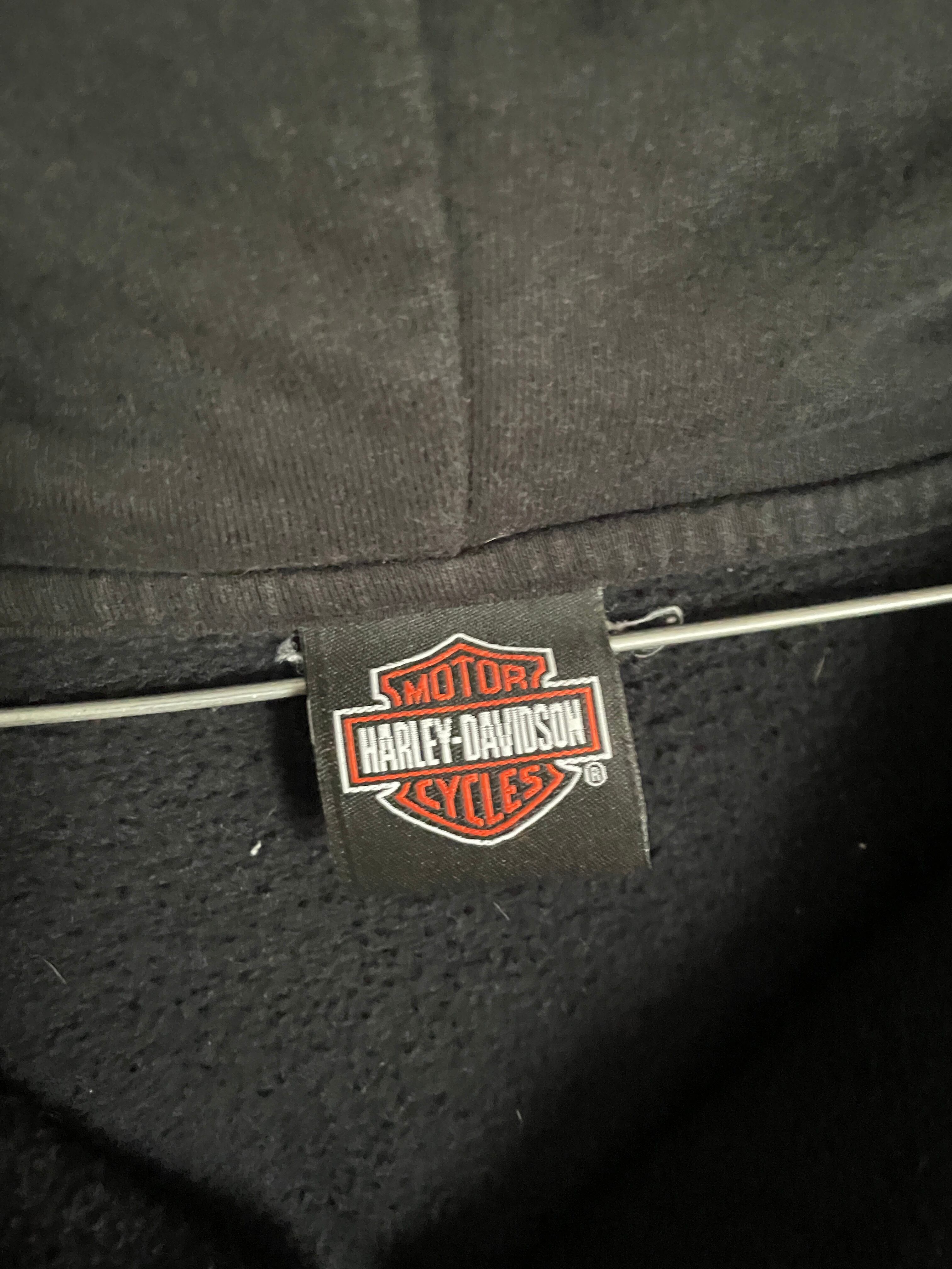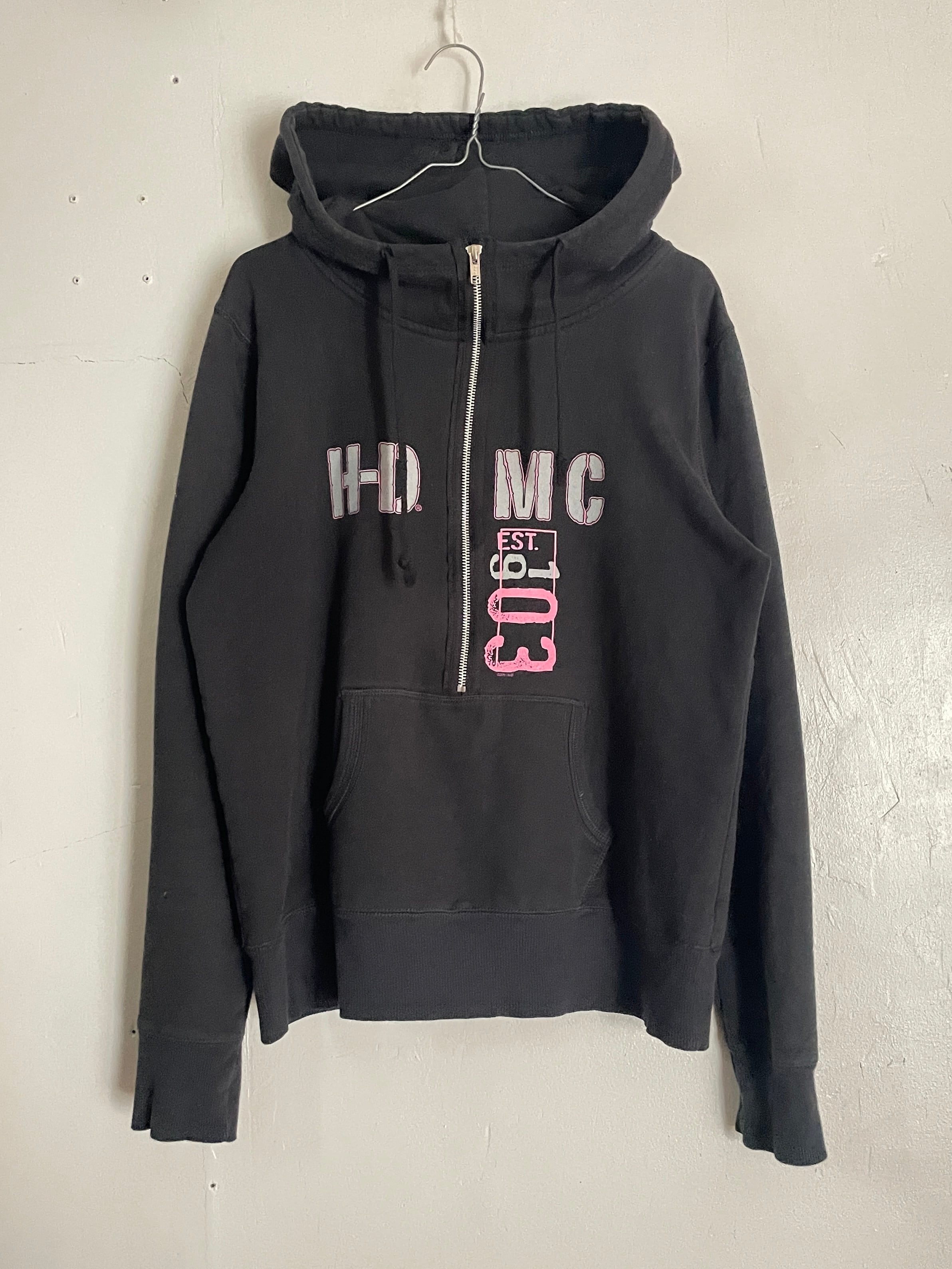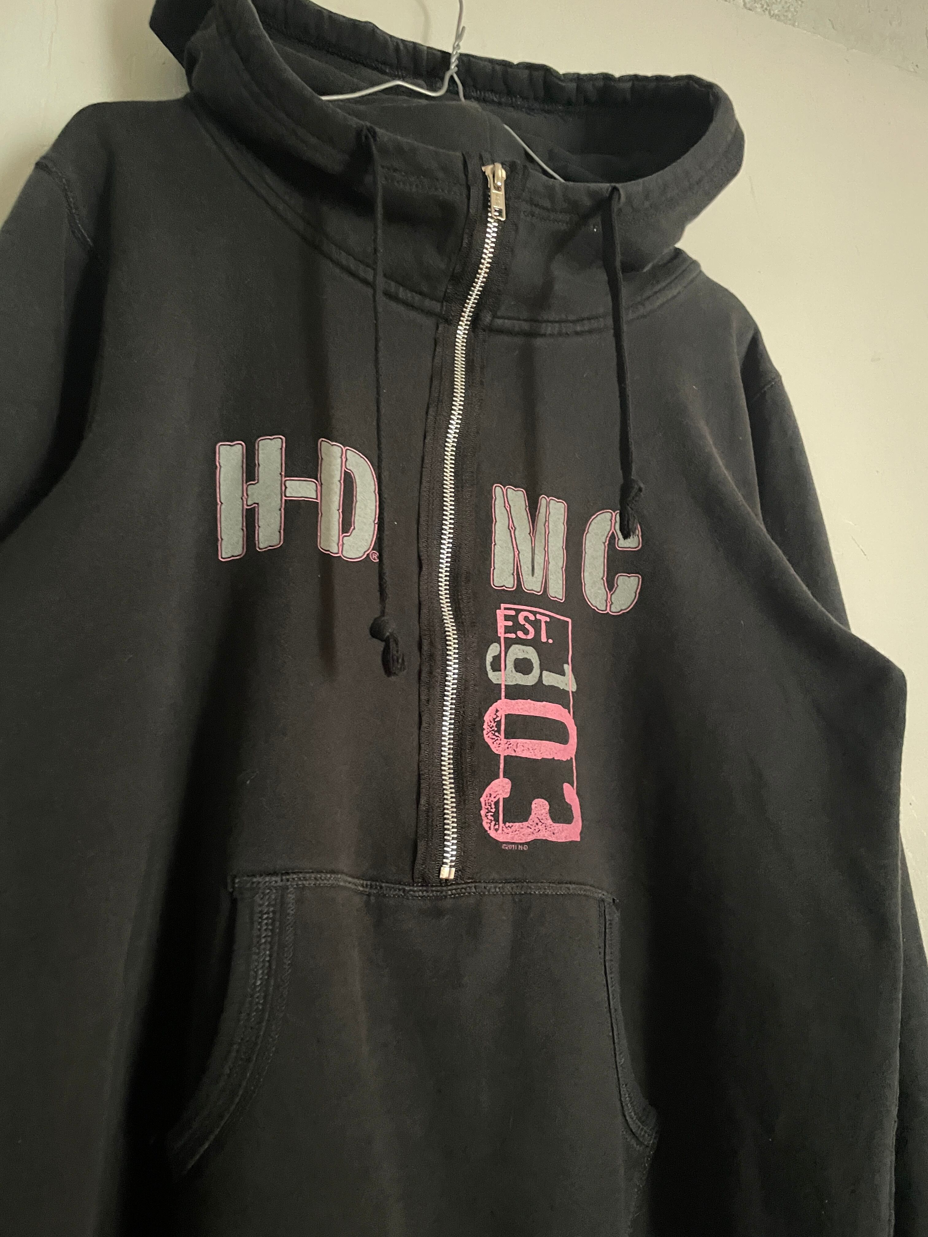 ブラックボディに、グレーとピンクのプリントが施された、ハーレーダビッドソンのハーフジップパーカー。ハーレーにしては落ち着いたデザインで、渋さのあり、可愛らしさも感じられるディテールになっています。深めのハーフジップで、インナーで遊べるのも魅力的です。大き過ぎず、小さ過ぎないサイズ感で、男女共におすすめできる一着です。Y2Kな雰囲気が漂うお洒落なパーカーです。