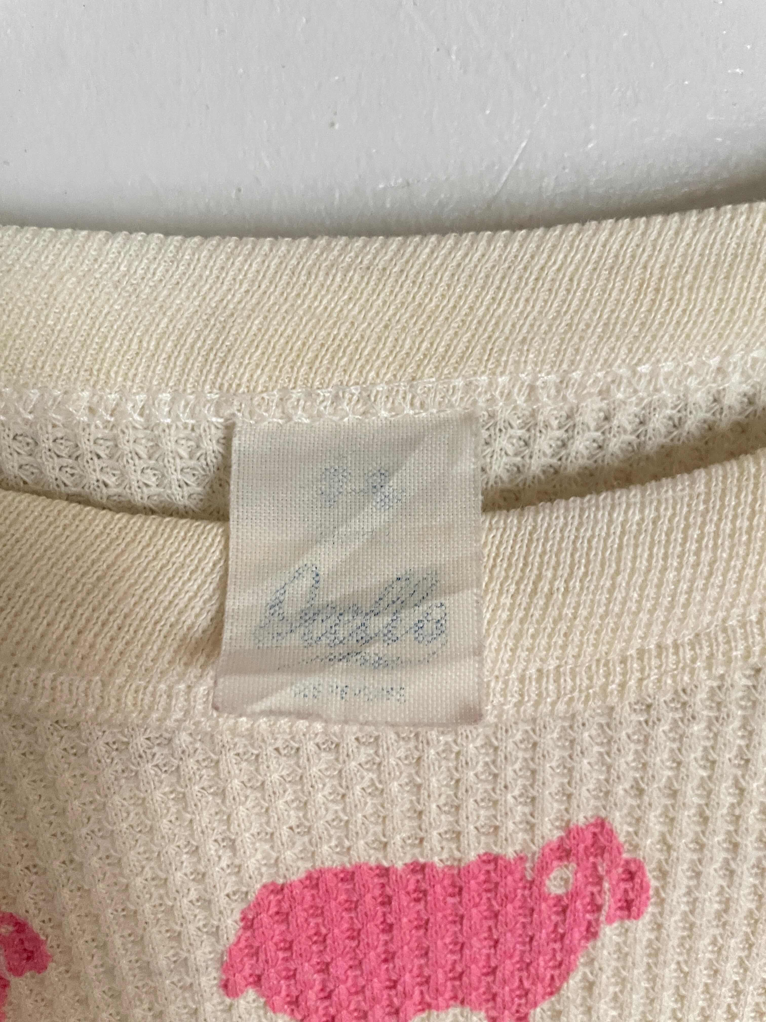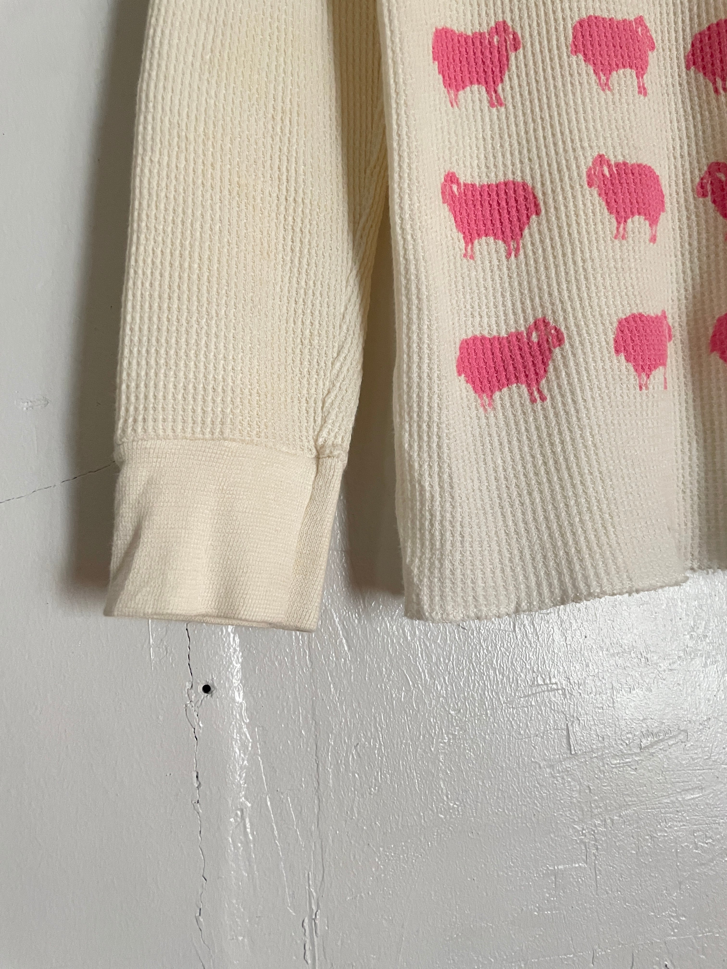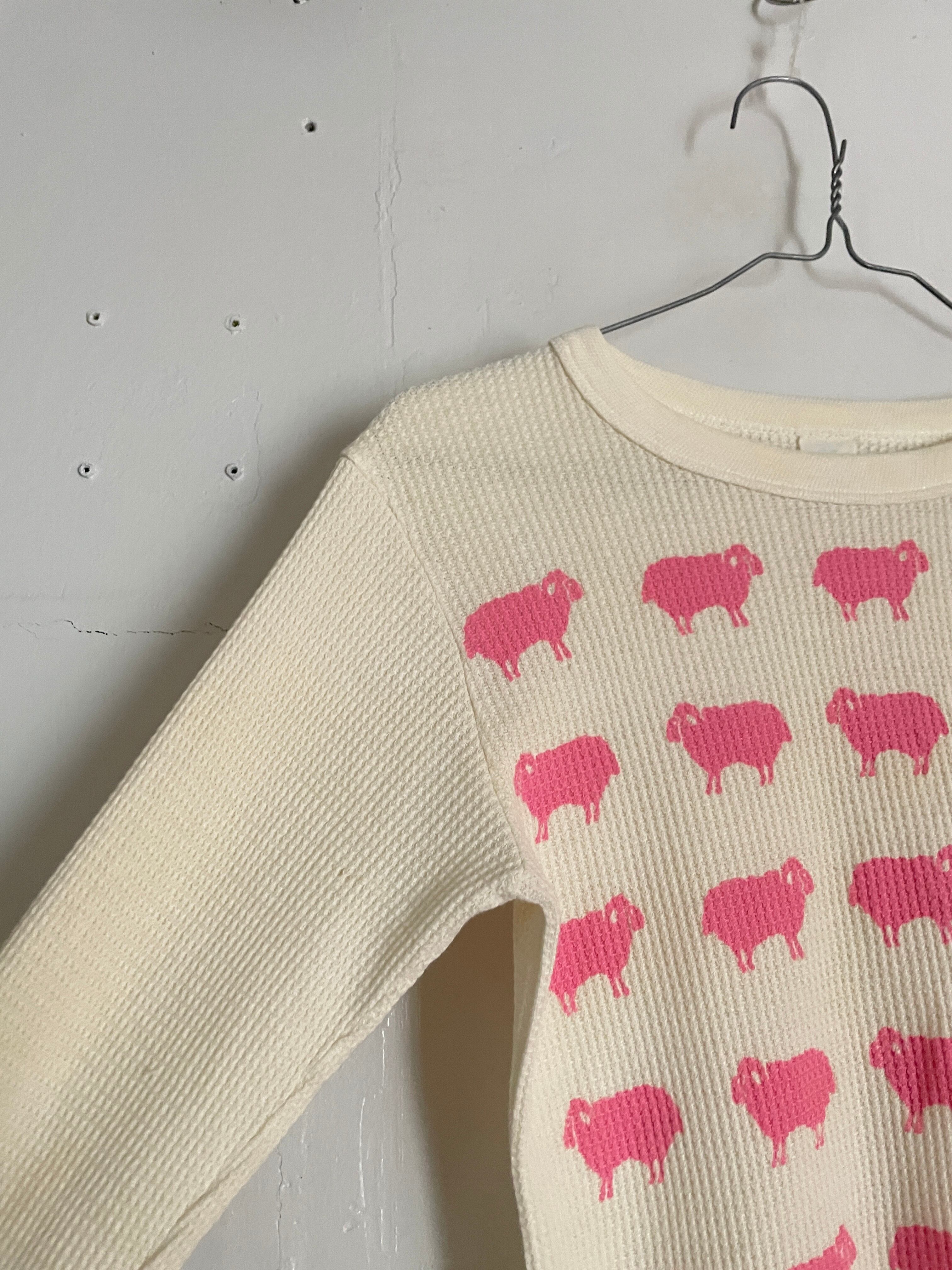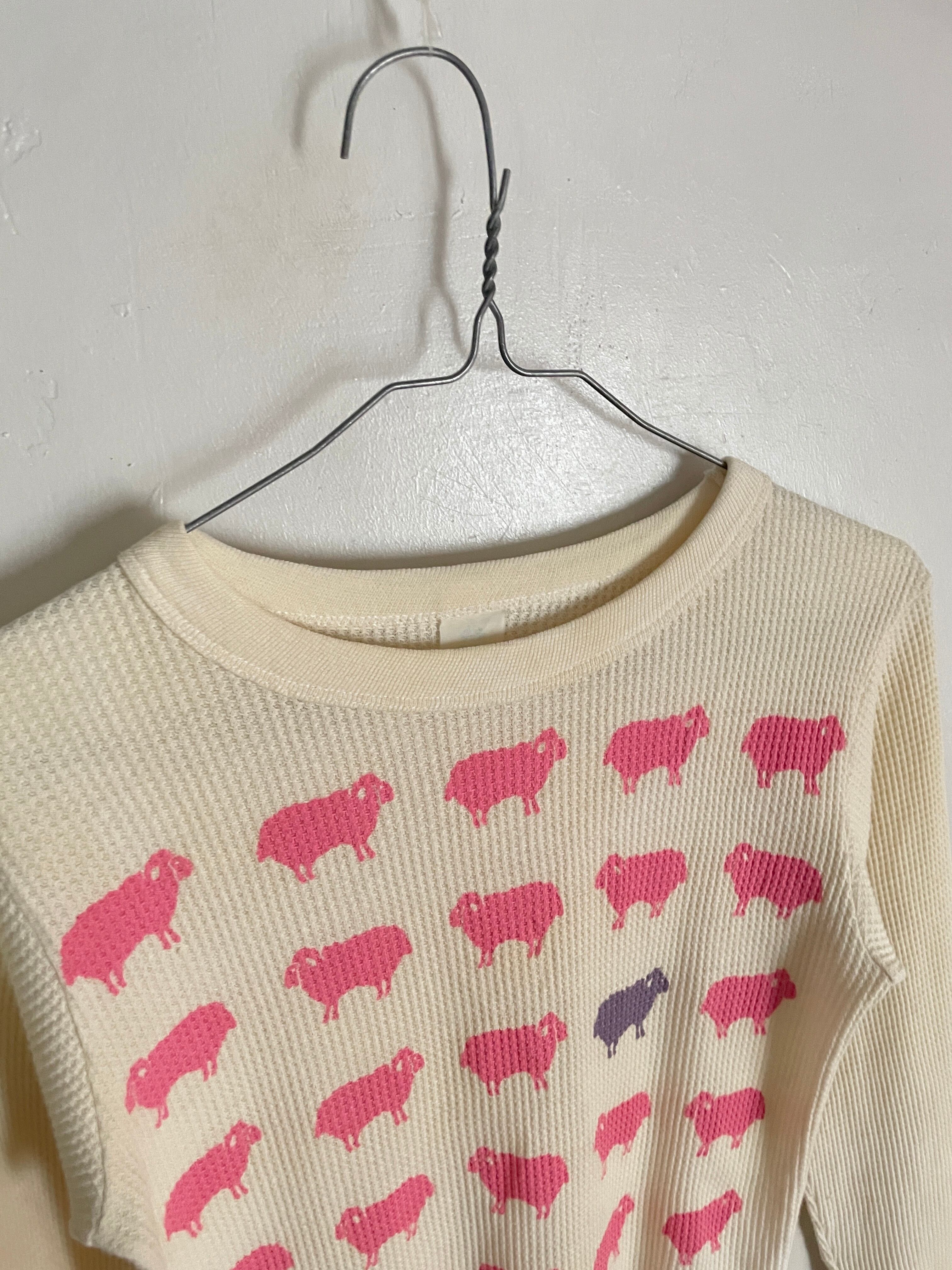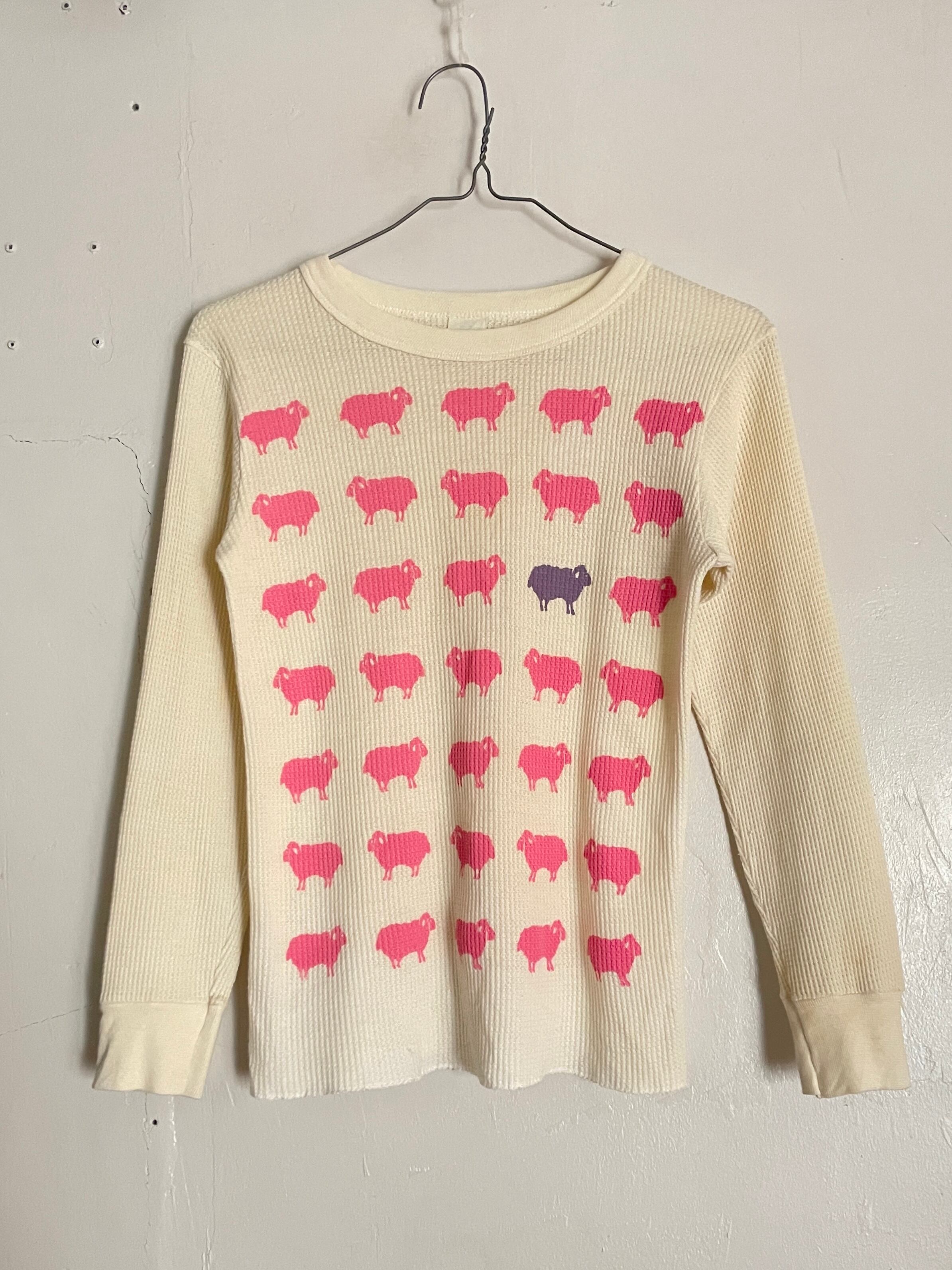 ホワイトボディに、可愛らしい羊がズラッとプリントされた、サーマルロンT。1匹だけパープルだったり、向きが違うのも面白いです。ピタッとしたタイトめなサイズ感で、体のラインを綺麗に出してくれます。一枚ではもちろんですが、インナーとしても活躍してくれるアイテムです。