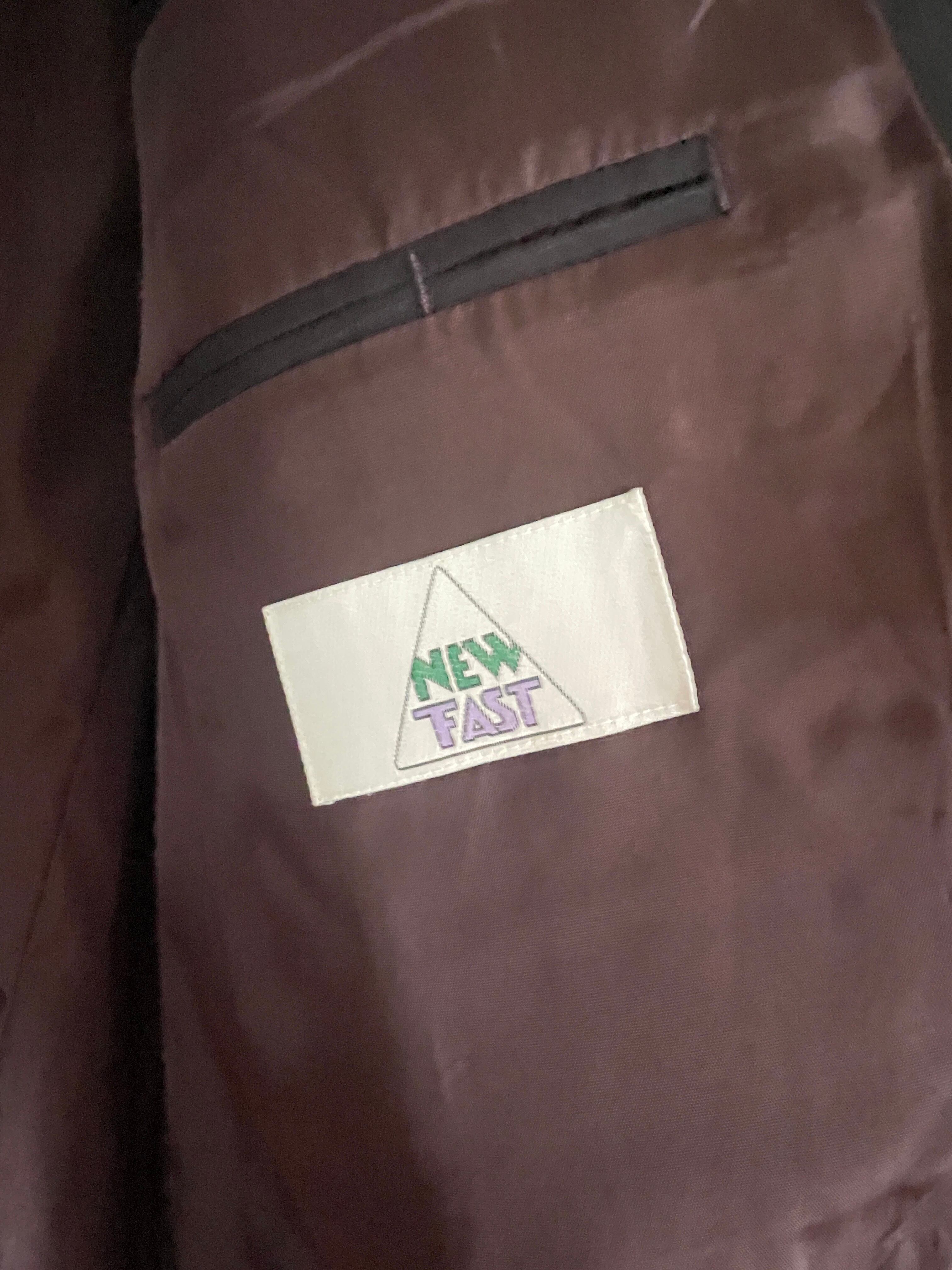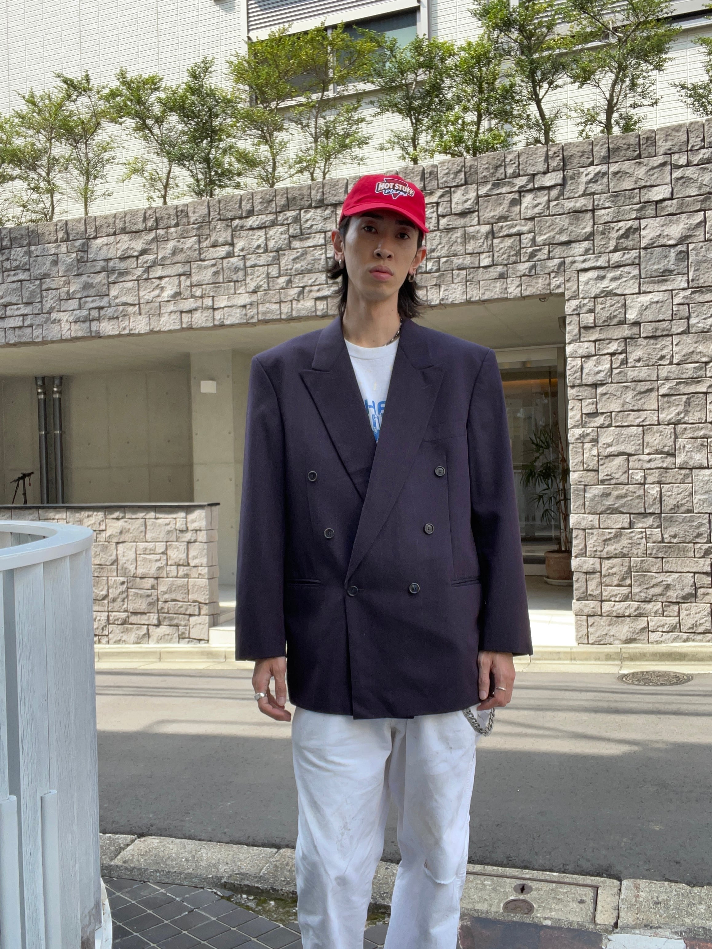 暗めなパープルボディに、細いラインが縦に施された、ダブルテーラードジャケット。上品で、色気のあるカラーがなんとも言えないかっこよさ。肩パットが入っている為、着用時のシルエットが綺麗です。ゆったりとしたサイズ感で、これからの季節にはTシャツの上からなど羽織ると良いバランス感になりそうです。左肩部分に小さな穴が見られます。