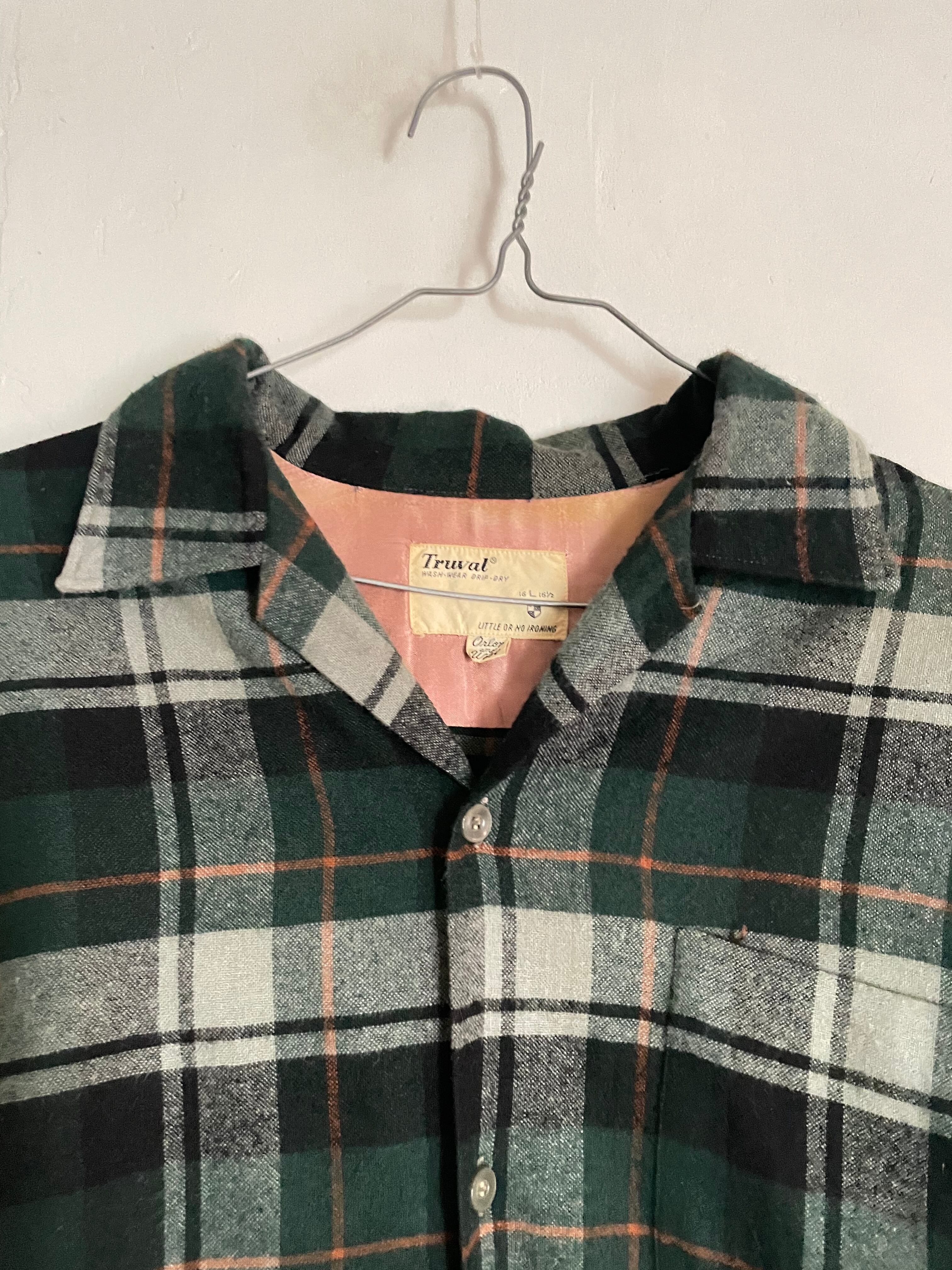 1950~1960年代を中心に高品質なシャツを製造していたブランド、トゥルーヴァルのチェックシャツです。落ち着いた色味、ゆとりのあるシルエットでカジュアルなコーディネートにぴったりの1枚です。素材には軽量で乾きやすく、保湿性が高いオーロンを使用しているので今の季節から羽織りとしてもお使いいただけます。中に厚手のトップスを合わせてもストレスなく着られるのも嬉しいポイントです。