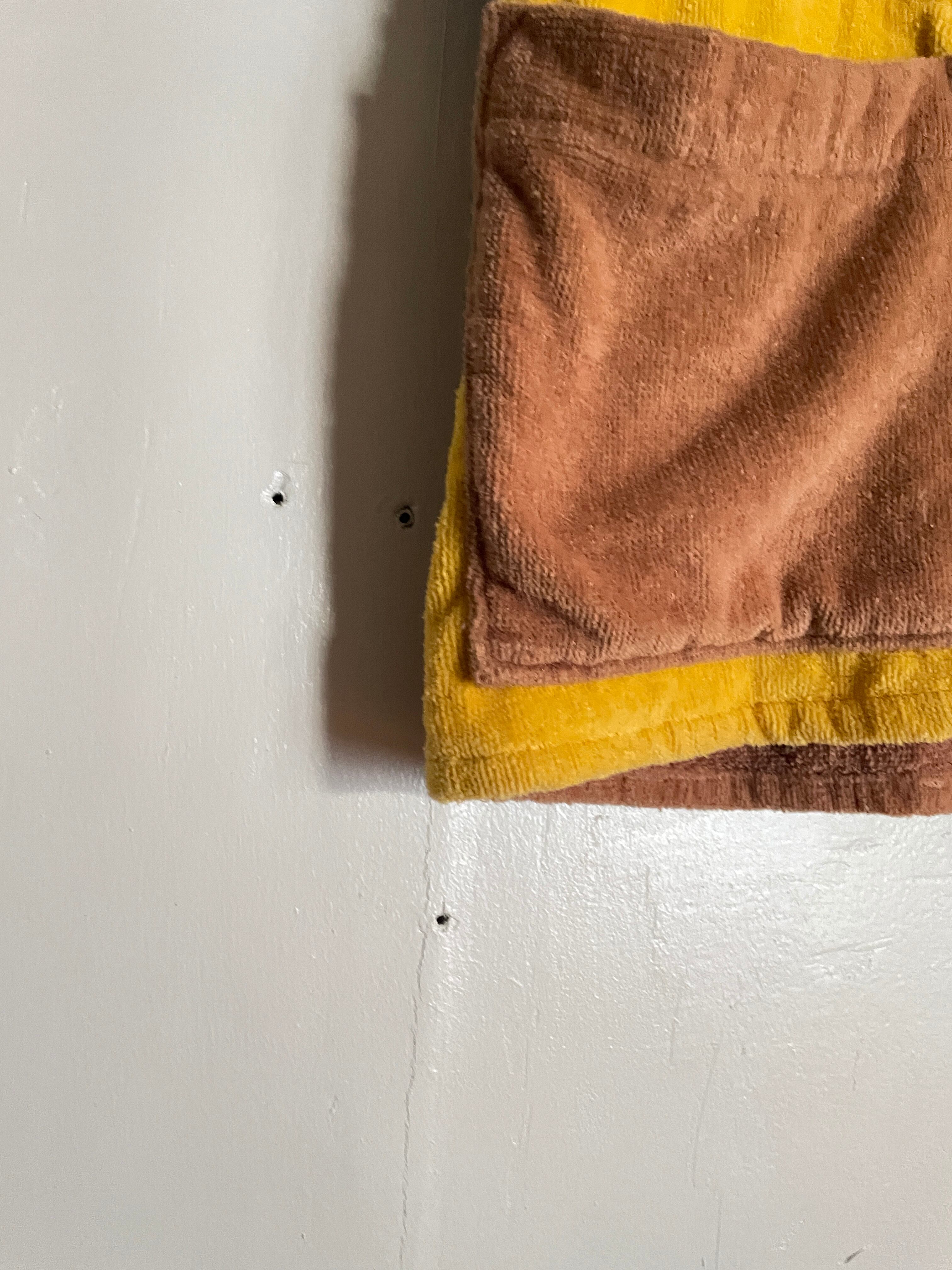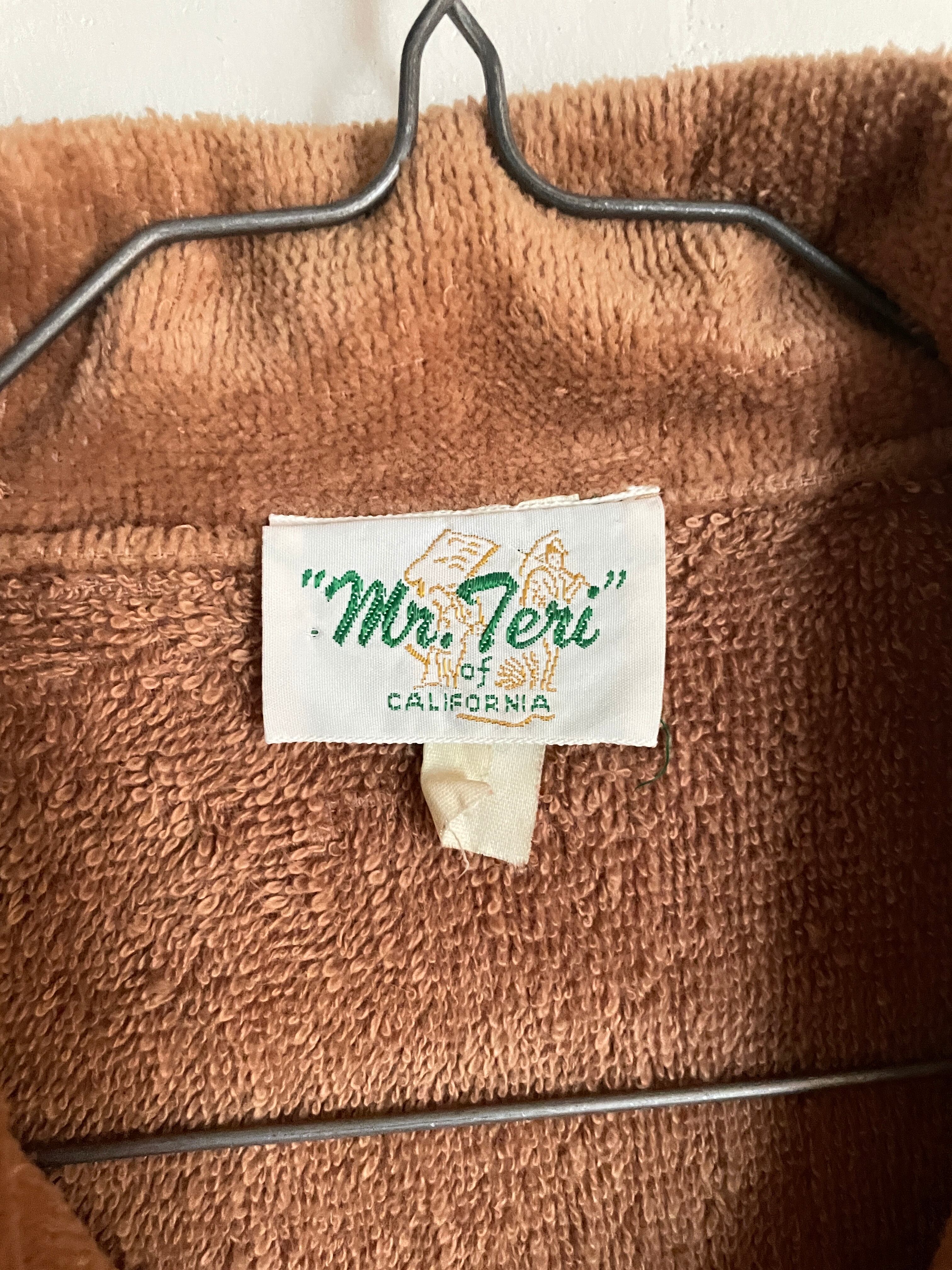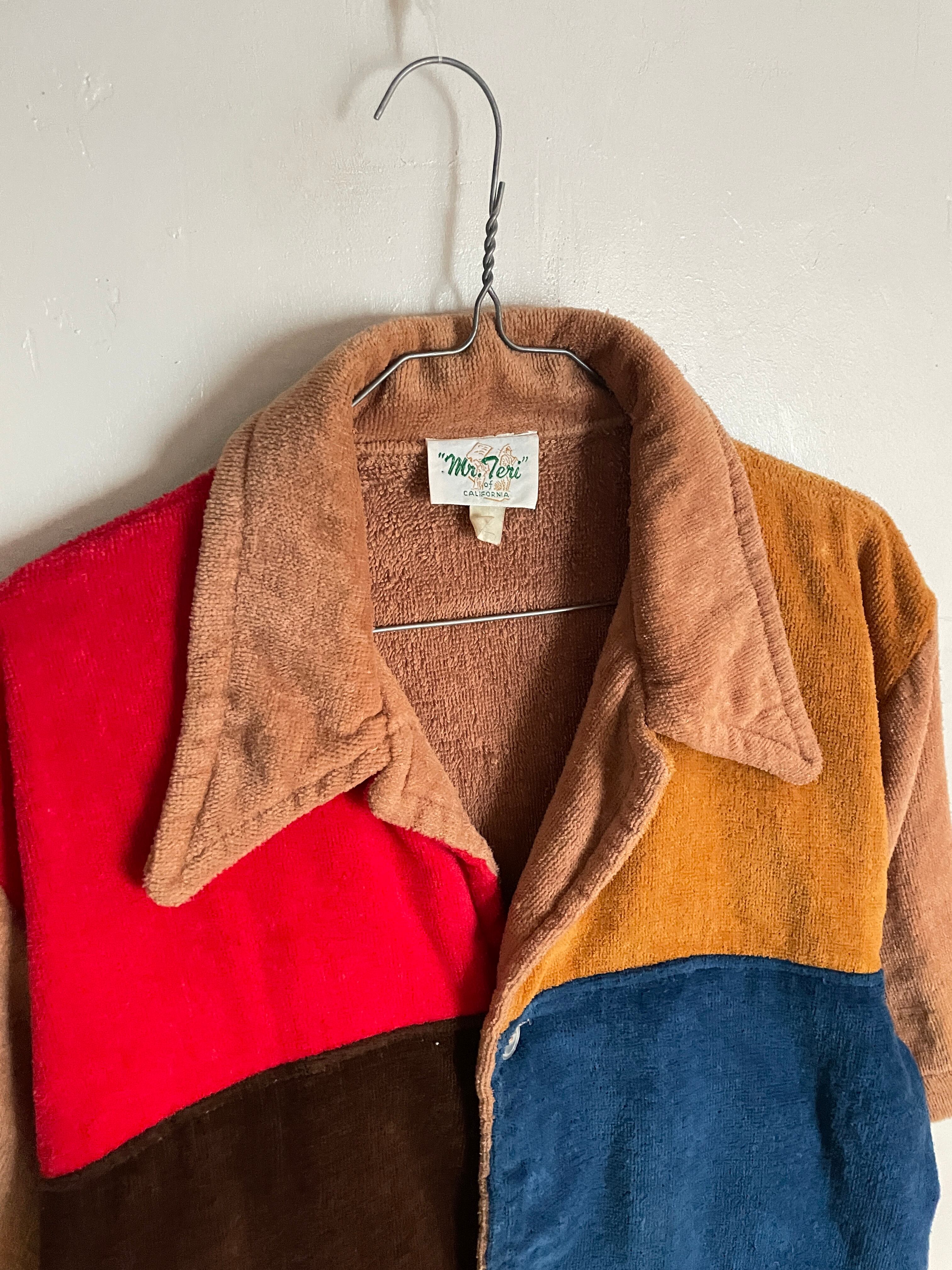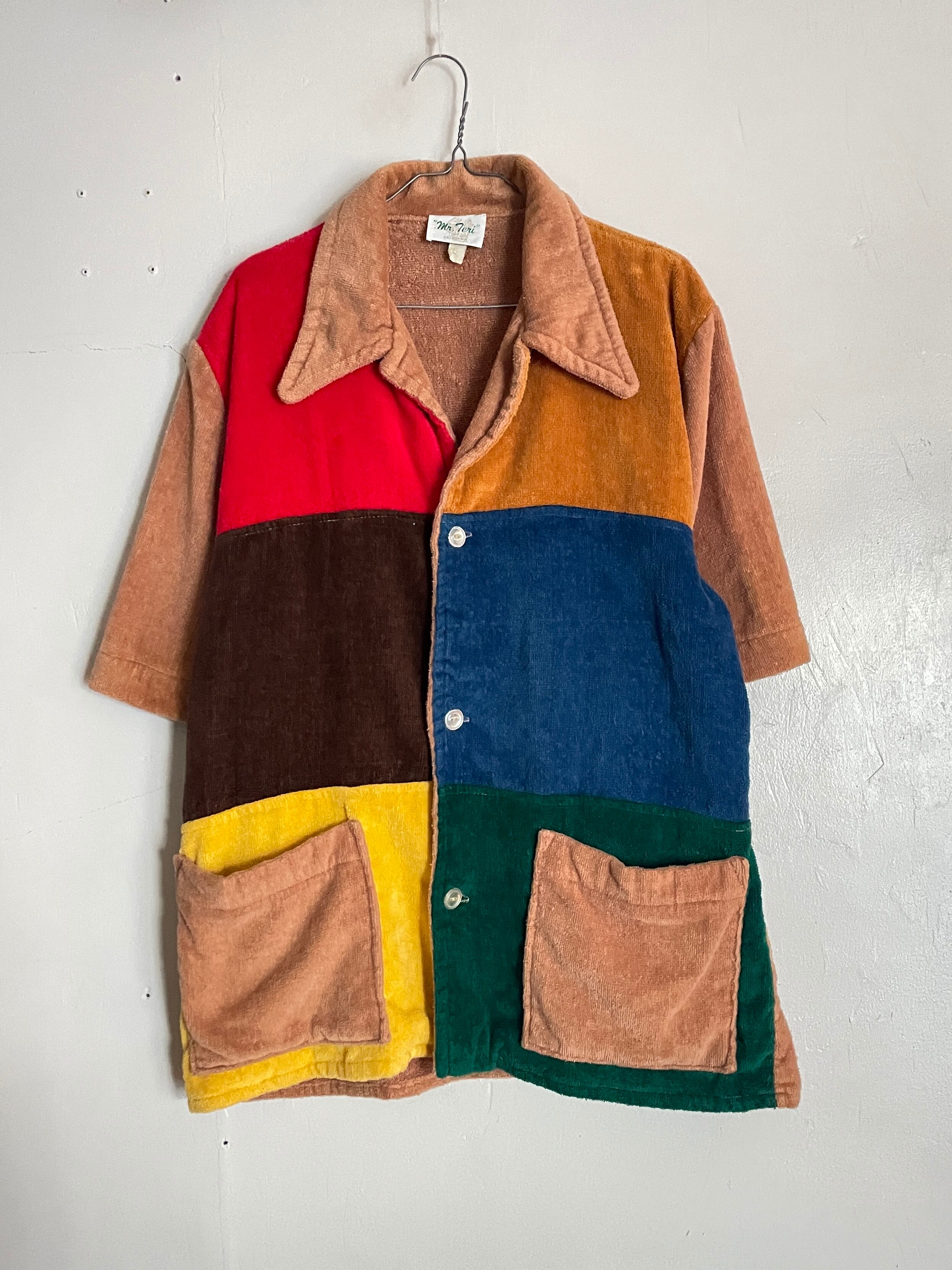 ブロック状に分かれた、カラフルなデザインがお洒落な、パイル生地のシャツジャケット。フワッとしたタオルのような、触り心地抜群な素材感。大振りな襟からは、しっかりとヴィンテージらしさが感じられます。バックは全くの無地なのもポイント。2ポケット付きなのも嬉しいです。シングルステッチで、希少なヴィンテージアイテムです。今の時期には確実にファッションのメインになってくれる一着です。