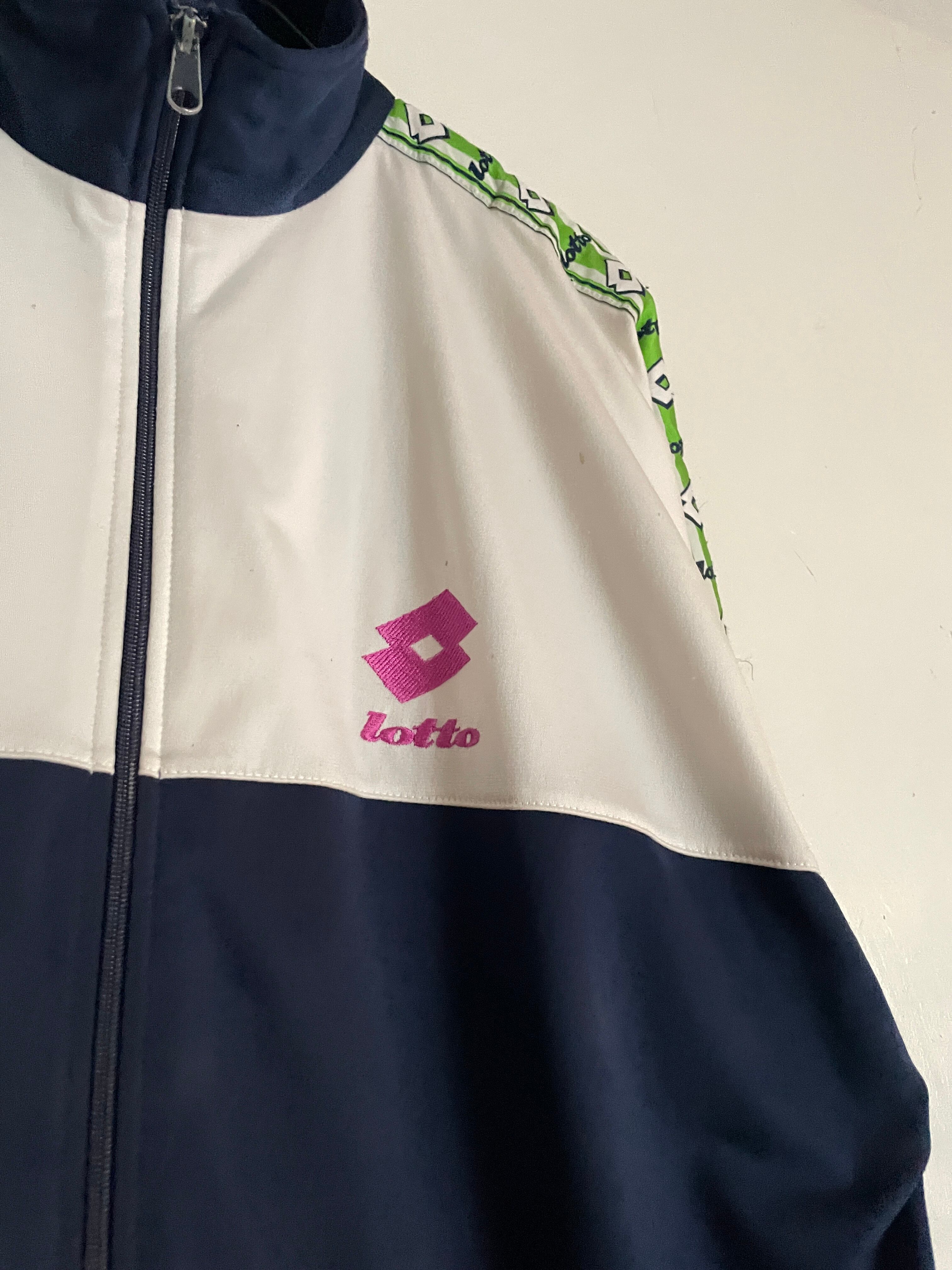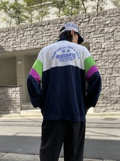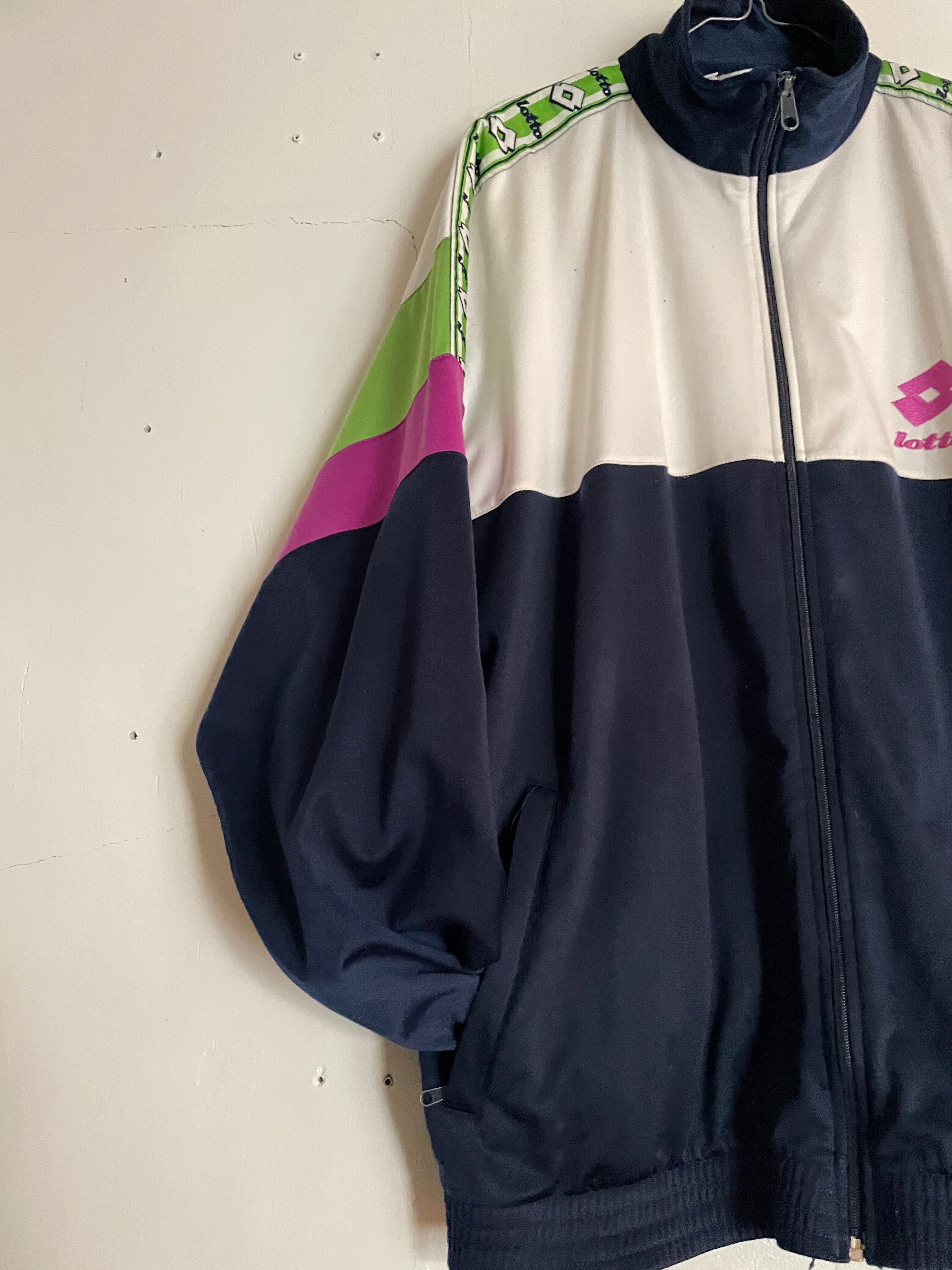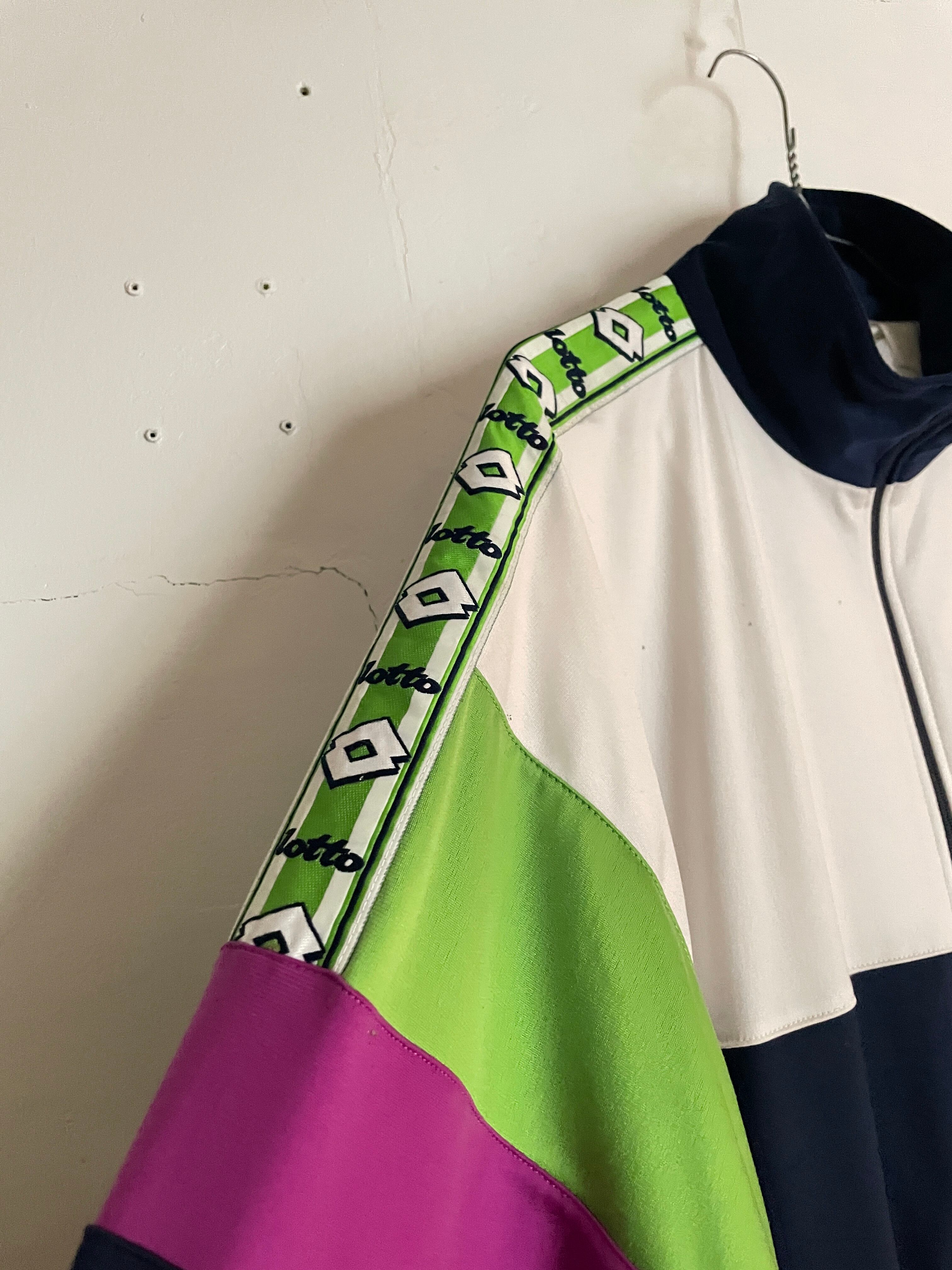 ホワイト、ネイビーボディをベースに、お洒落なカラーリングの切り替えが施された、ロットのトラックジャケット。脇部分のライトグリーンとパープルが良いアクセントになっています。ネックから肩にかけてズラッと、ロットのロゴ刺繍。スポーティ過ぎず、デザイン性に長けた一着。バックにはスポンサープリントが施されています。ゆったりとしたサイズ感で、これからの季節一着は持っておきたいアイテムかと思います。所々に小さな汚れが見られますが、あまり気になりません。