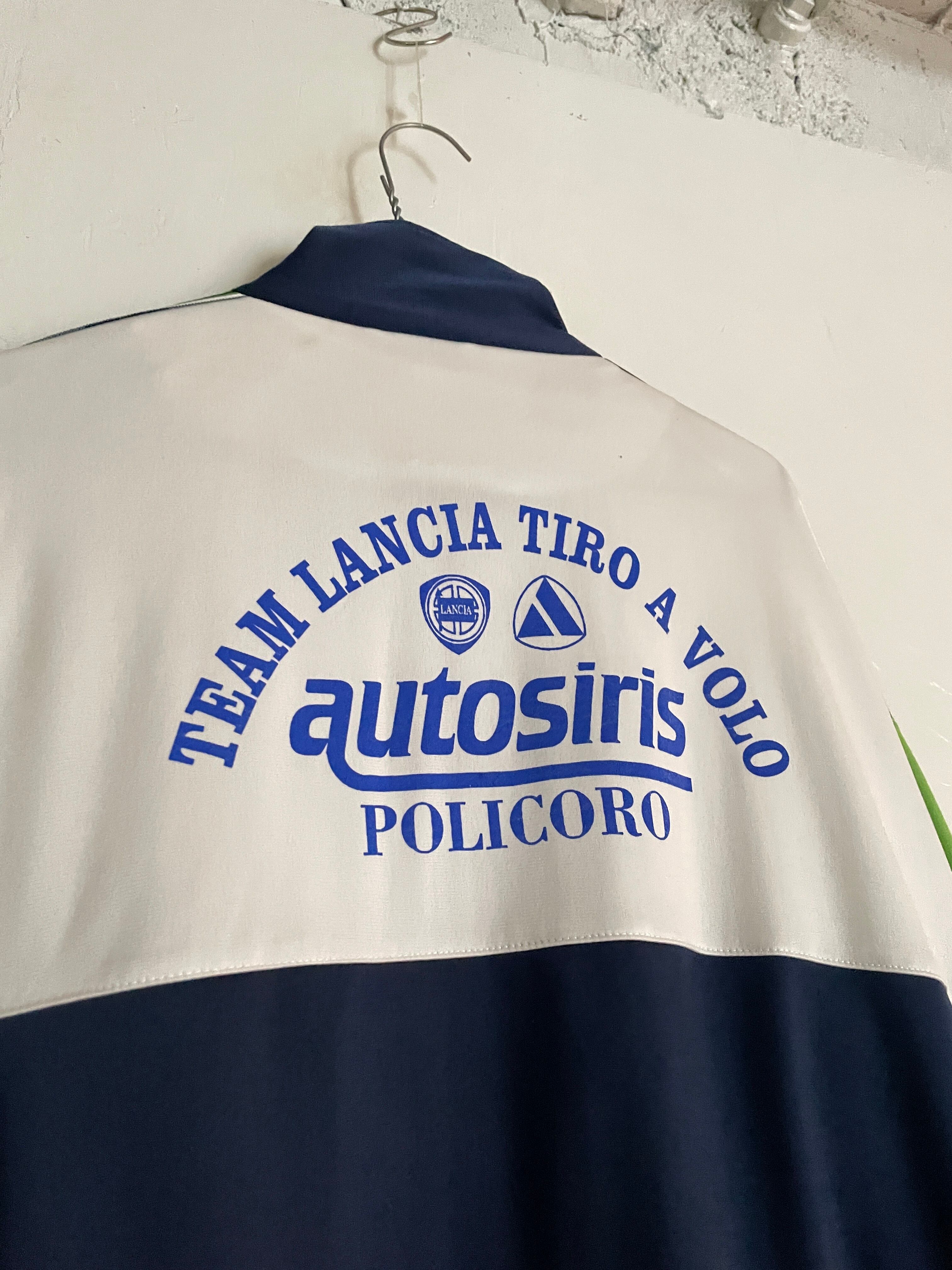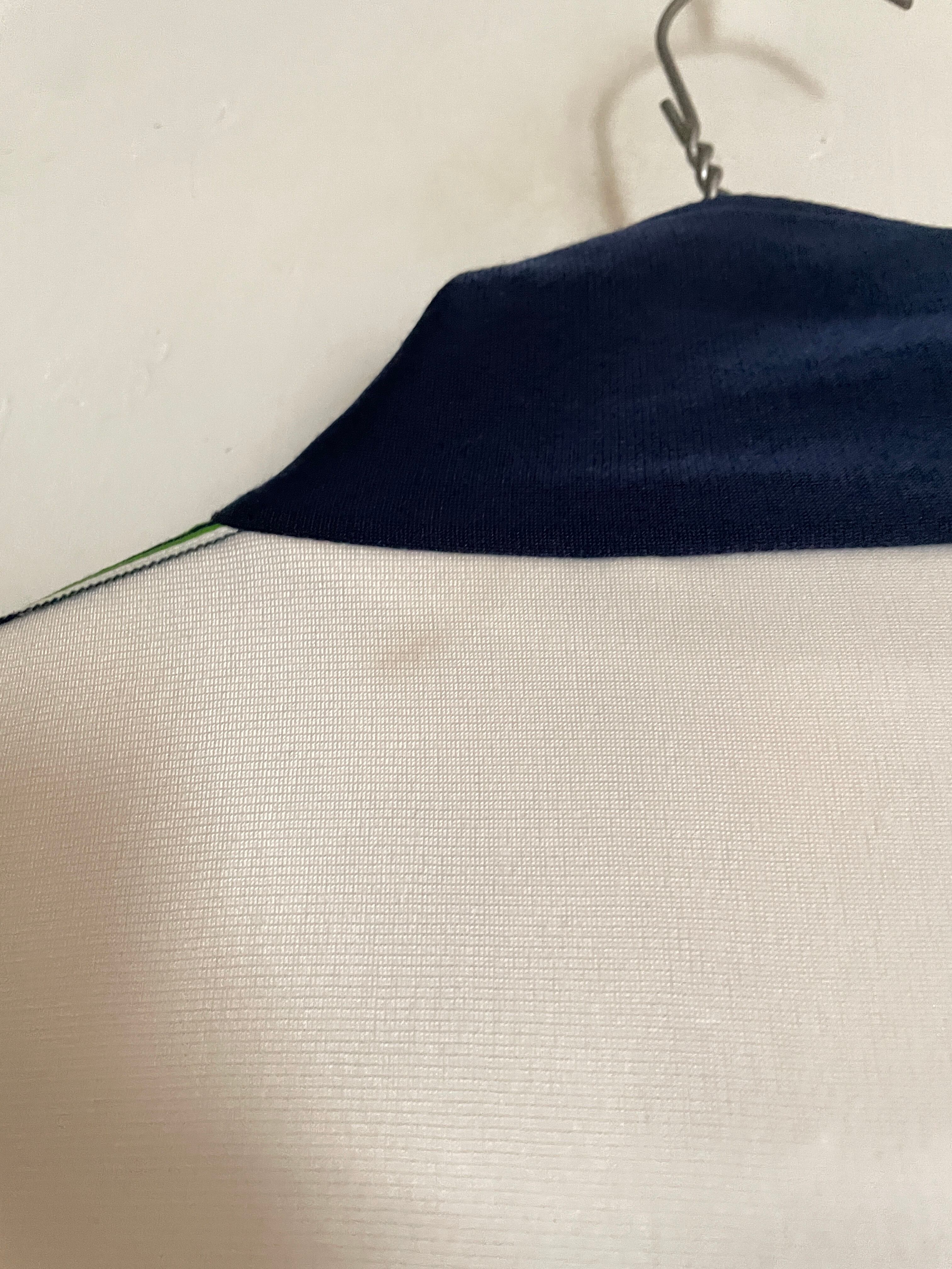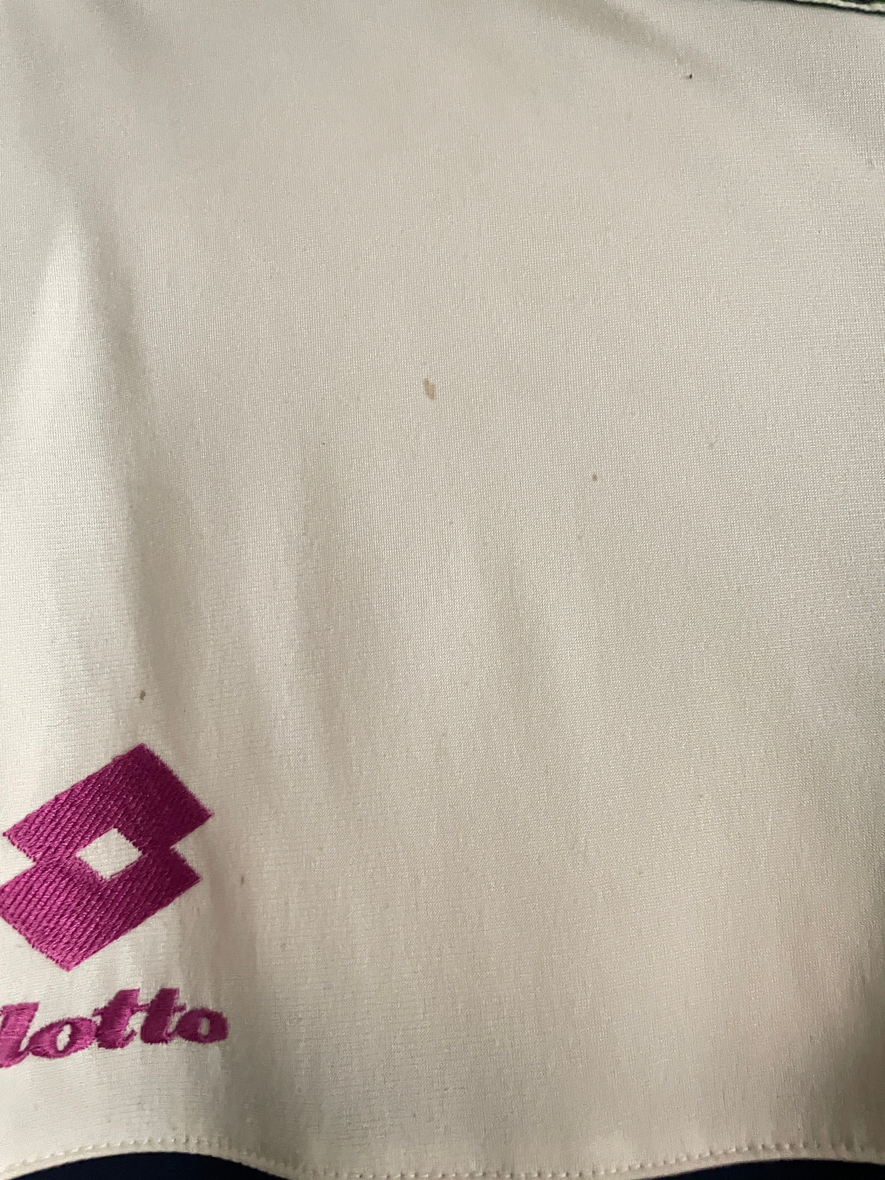 ホワイト、ネイビーボディをベースに、お洒落なカラーリングの切り替えが施された、ロットのトラックジャケット。脇部分のライトグリーンとパープルが良いアクセントになっています。ネックから肩にかけてズラッと、ロットのロゴ刺繍。スポーティ過ぎず、デザイン性に長けた一着。バックにはスポンサープリントが施されています。ゆったりとしたサイズ感で、これからの季節一着は持っておきたいアイテムかと思います。所々に小さな汚れが見られますが、あまり気になりません。