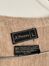 ベージュボディで、毛足長めの上品なアクリル素材が魅力的な、ジェーシーペニーのニットカーディガン。文句の付け所がない至宝の一着です。タグを見ると、70年代のアイテムだという事が分かります。小さめなものが多い中、こちらはゆったりと着られるLサイズ。袖も長めで、Tシャツの上からなど、ラフに着られそうです。単色なので、着回しやすい一着かと思います。秋には確実に活躍してくれるアイテムかと思います。