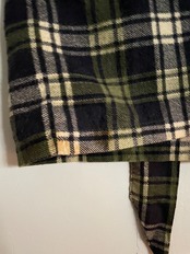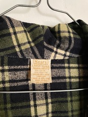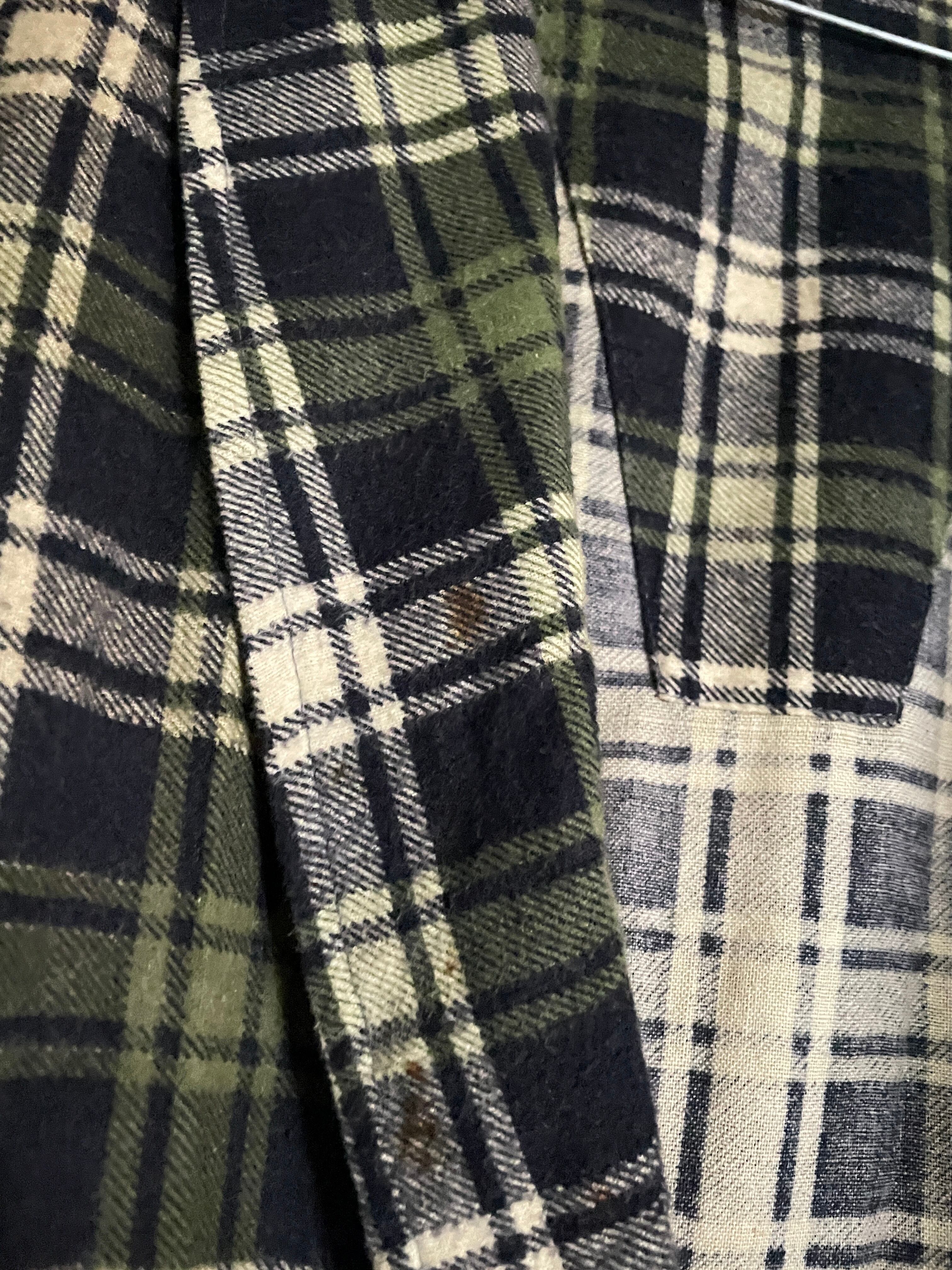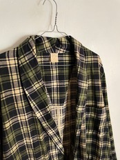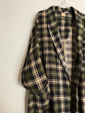 配色抜群のフランネルチェックがお洒落な、シアーズのガウンコート。秋の訪れを感じさせる一着です。フワッとした質の良いコットンポリ。シャツ感覚で着られそうです。ポケット付きなのも嬉しいです。紐で縛って着ても良し、垂らして緩く着ても良し。使い方によって、様々な着こなしを楽しめる魅力的なアイテムです。所々に小さな汚れが見られますが、気になる程ではありません。