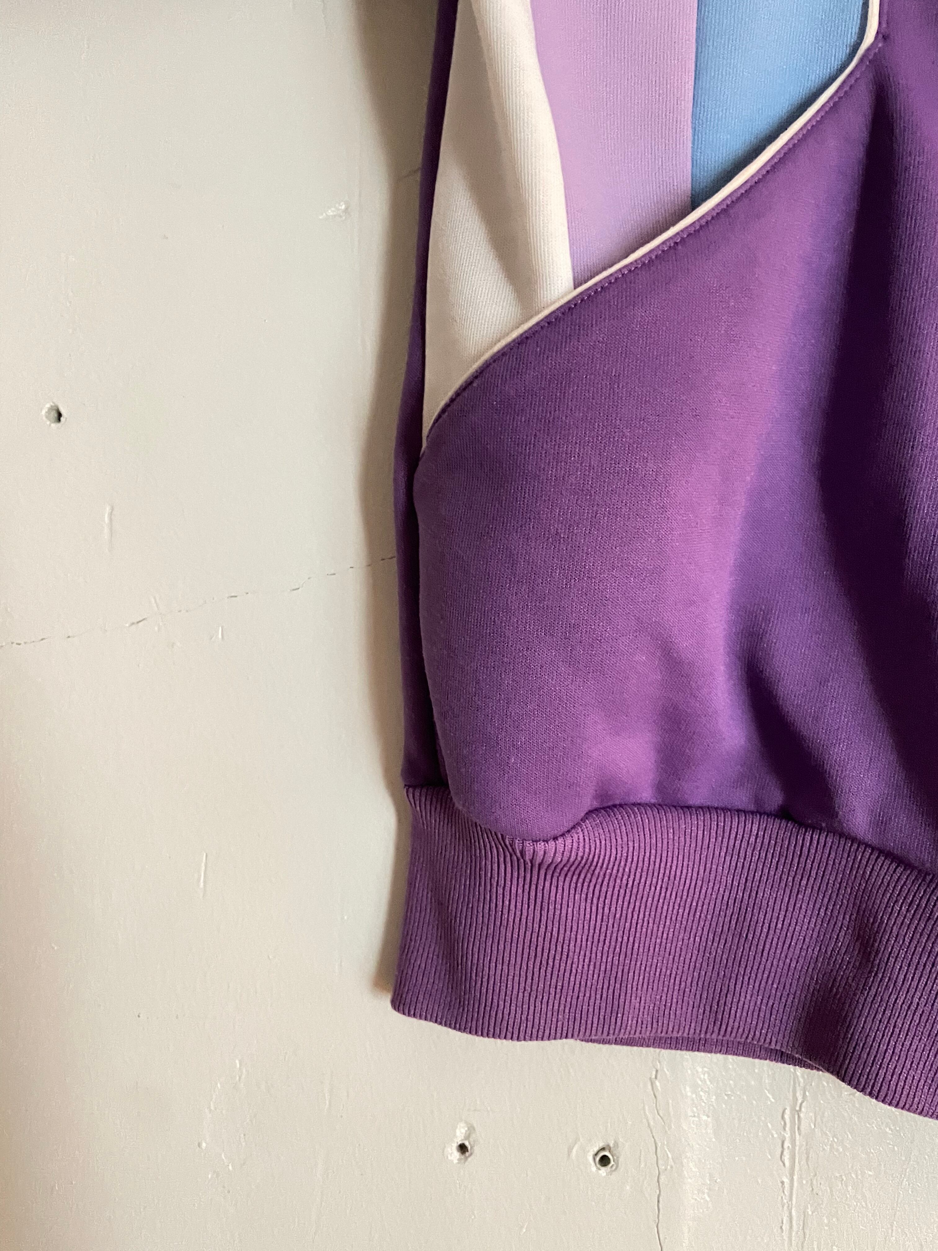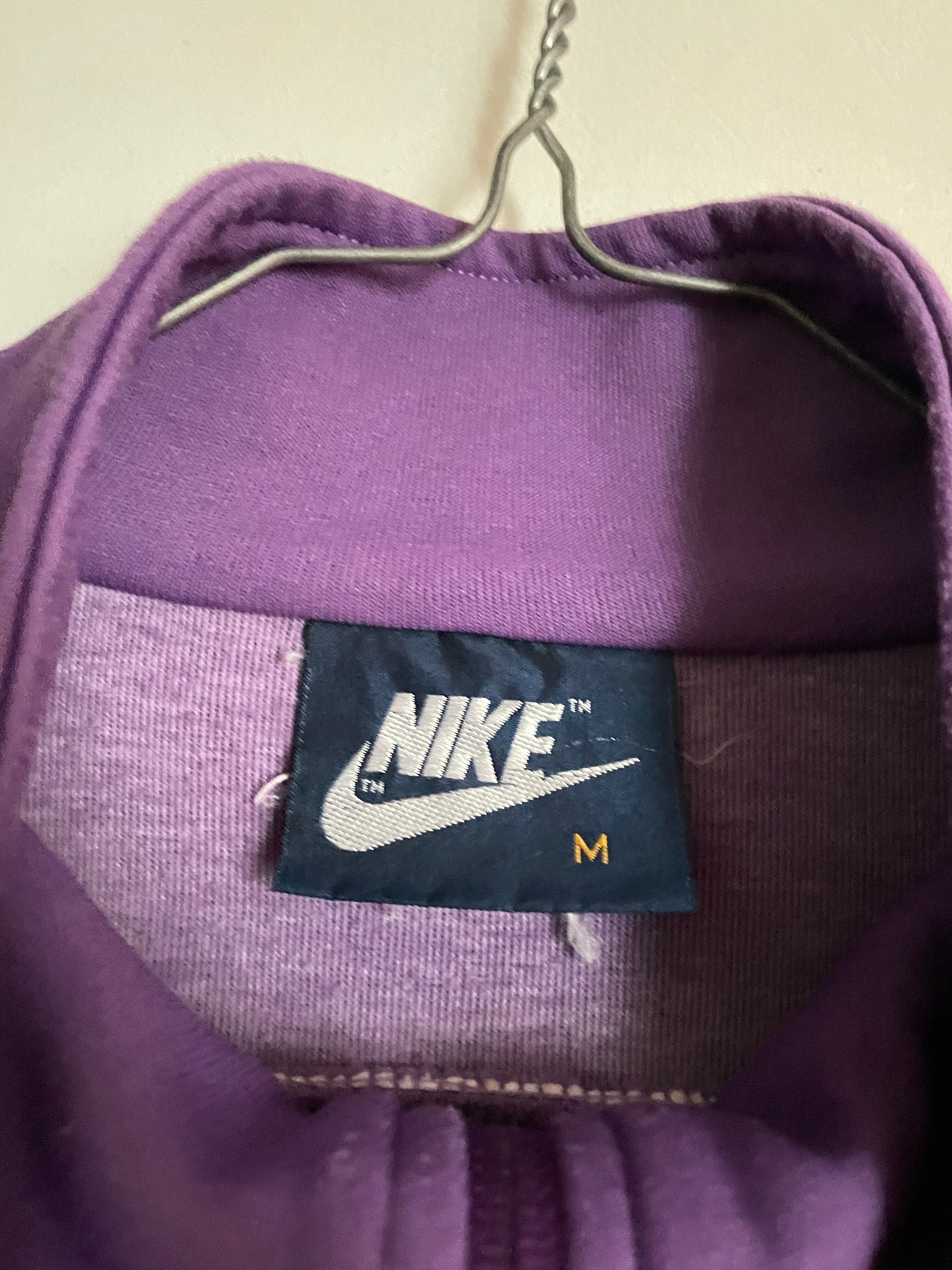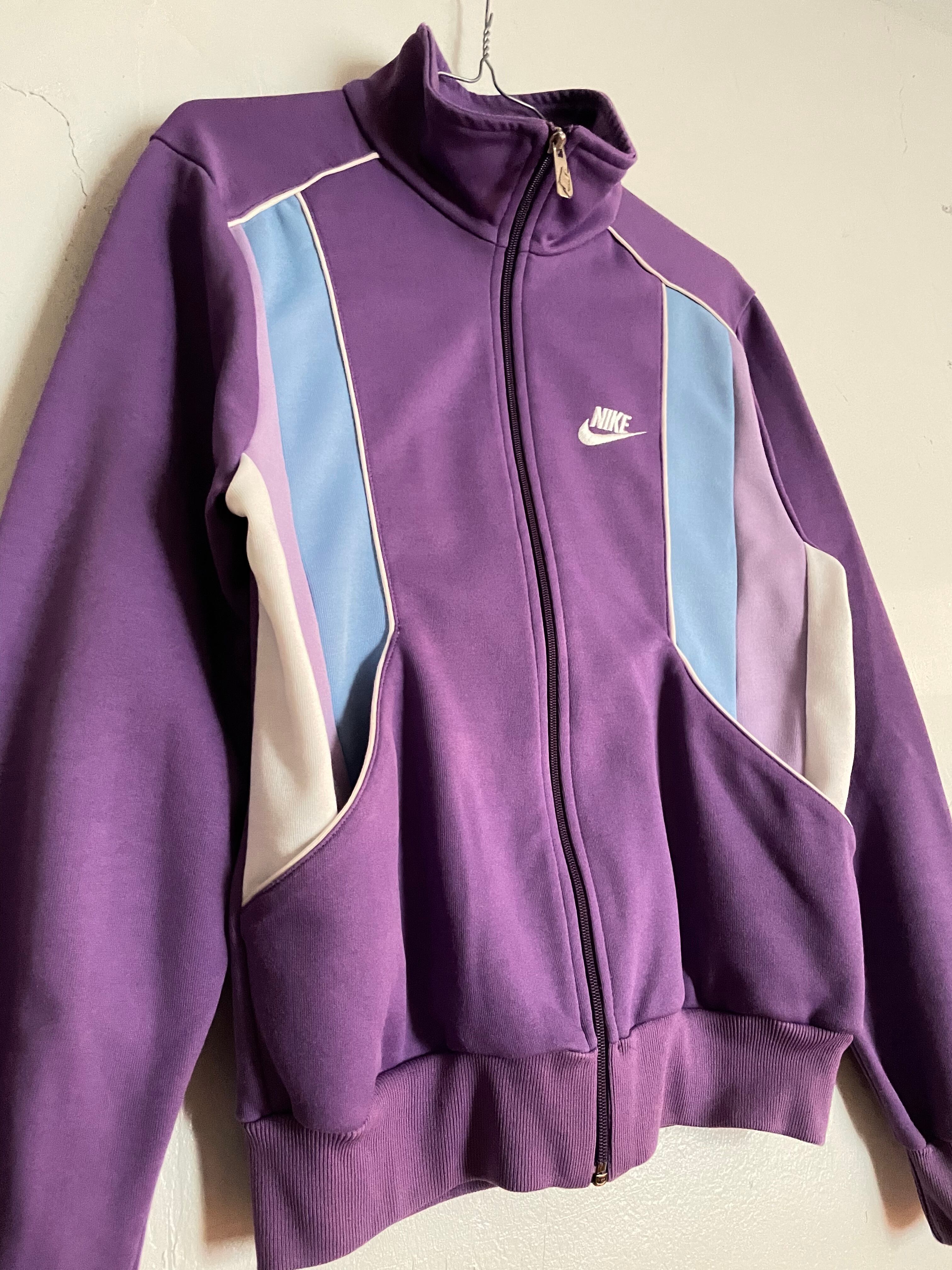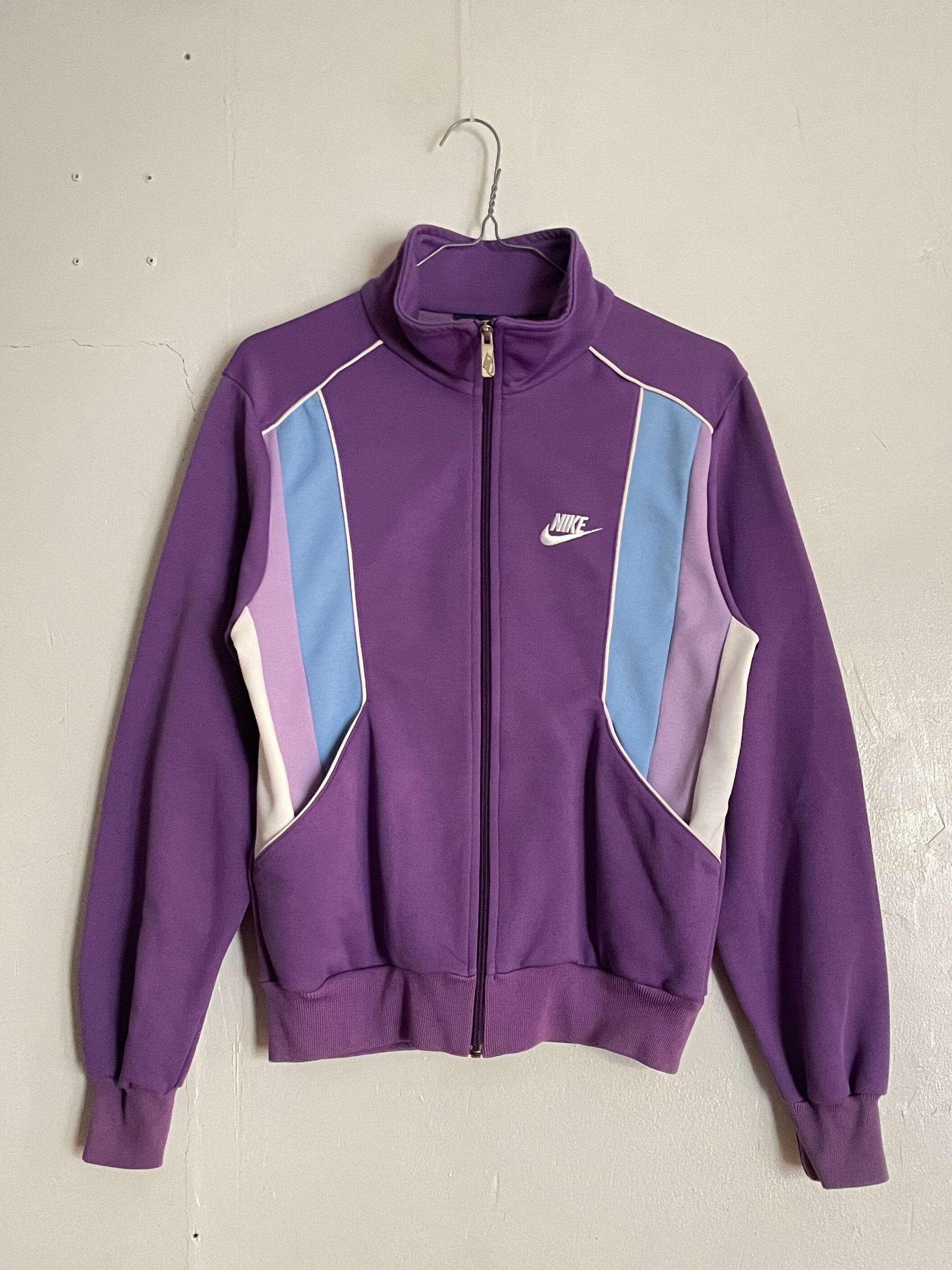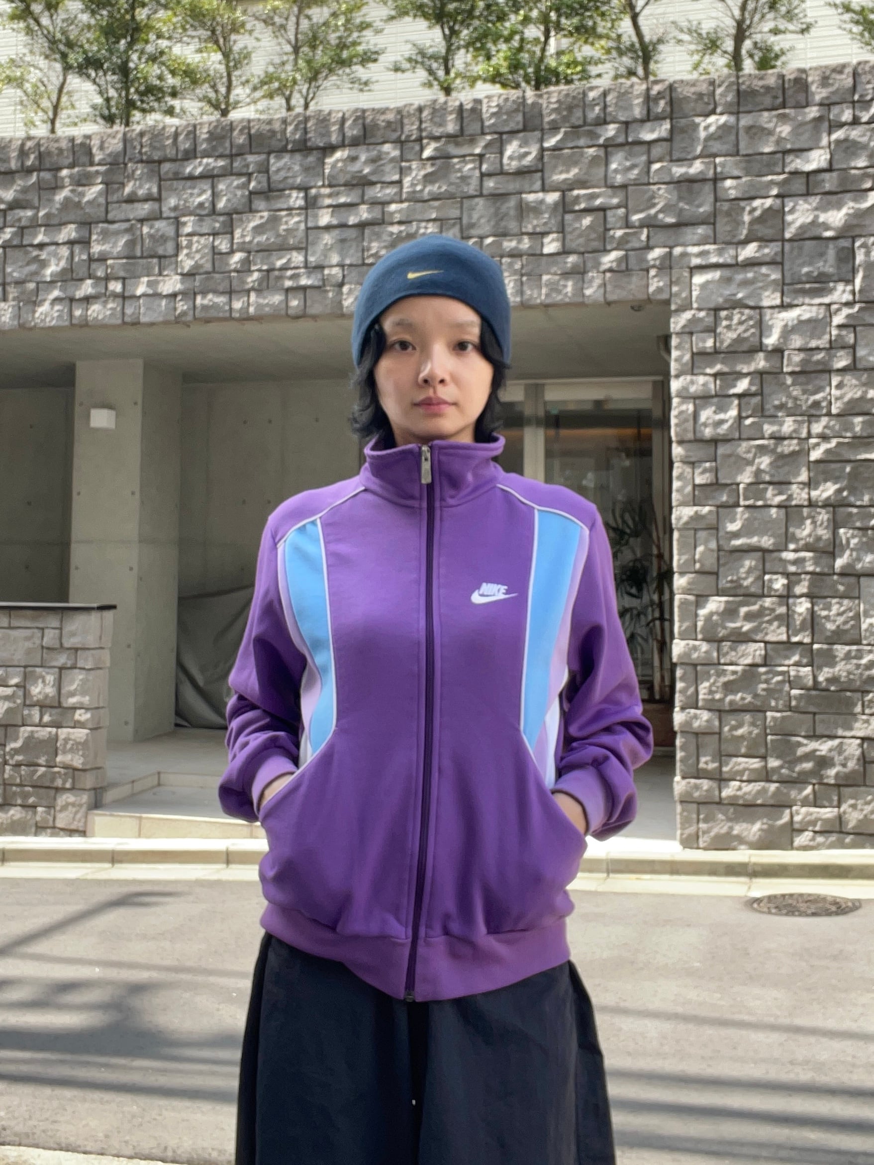 ナイキのフルジップトラックジャケット。鮮やかなパープルをベースに、ブルー・ピンク・ホワイトの切り替えデザインが特徴です。胸元にはホワイトのロゴ刺繍入りで、スポーティーながらもレトロな雰囲気も演出してくれます。軽やかなポリエステル素材で柔らかく、着心地も抜群です。バックのラインデザインも目を惹く一着です。