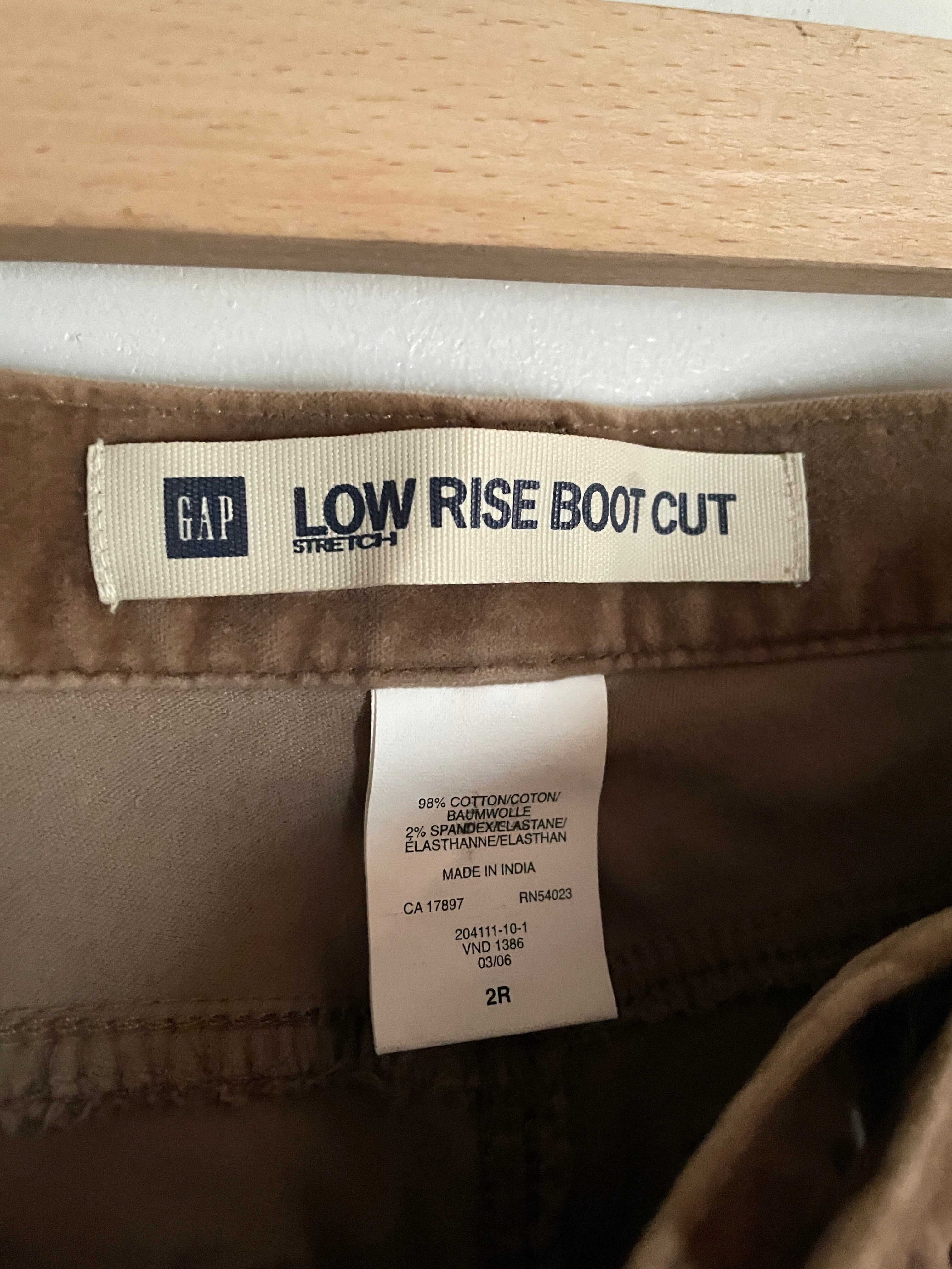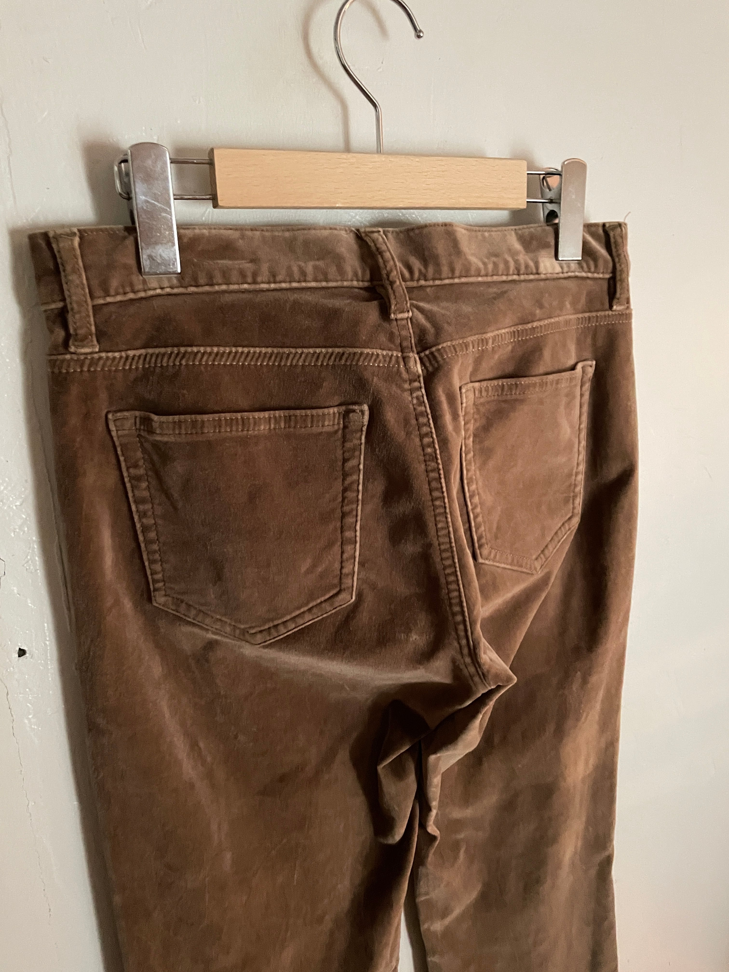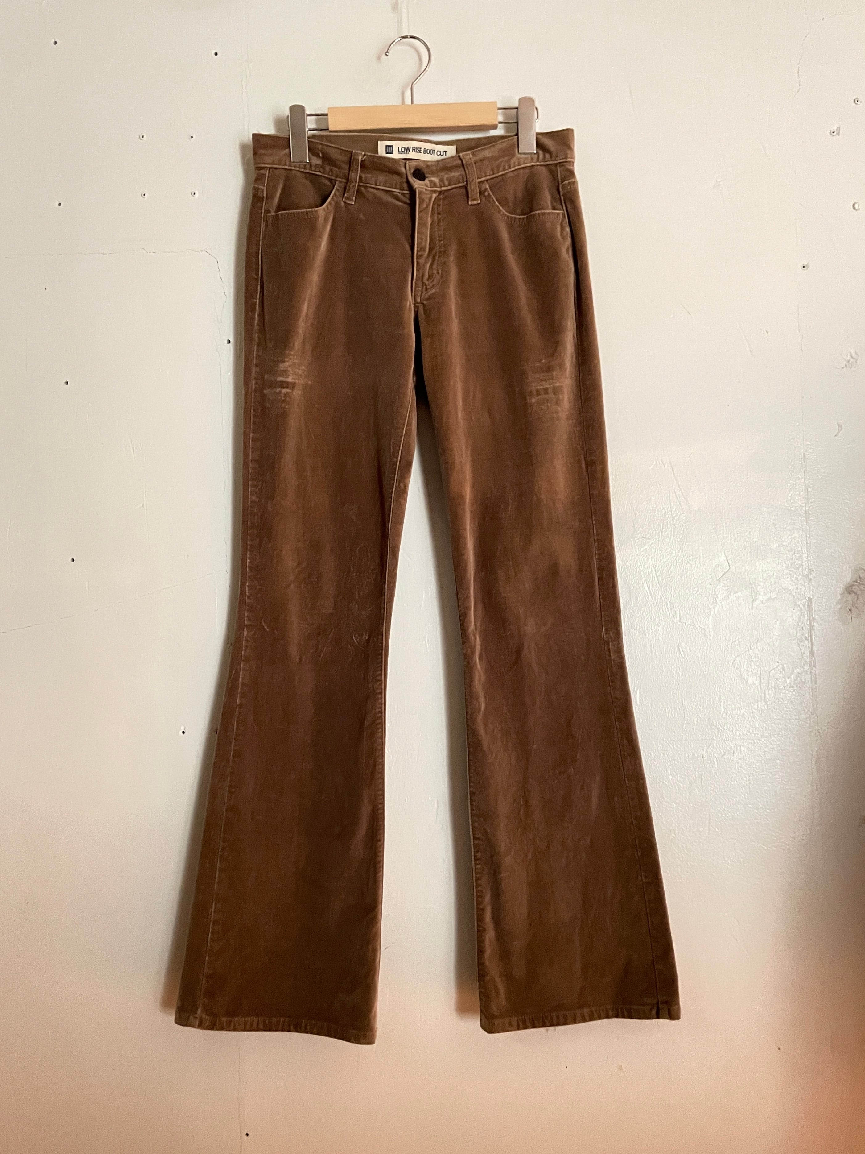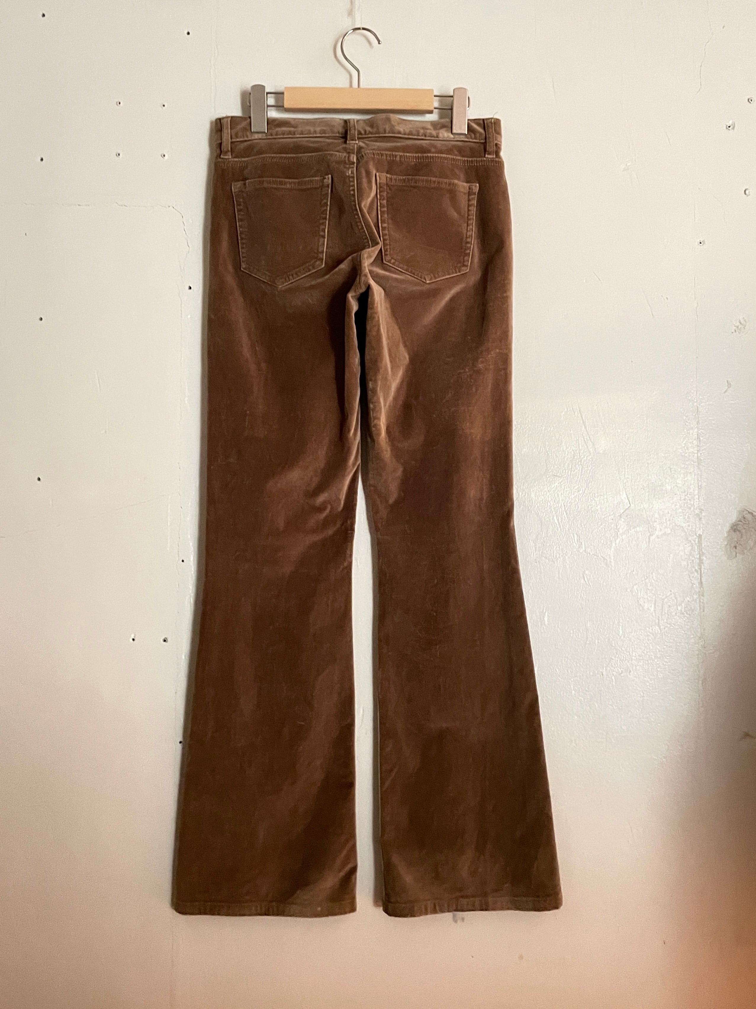 ブラウンカラーで、光の当たり方によって色味が変わって見える、ギャップのベロアフレアパンツ。触り心地抜群のベロア素材で、裾にかけて綺麗にフレアした絶妙なシルエット。ローライズで、まさに美脚パンツです。70年代の雰囲気が漂うお洒落な一本です。