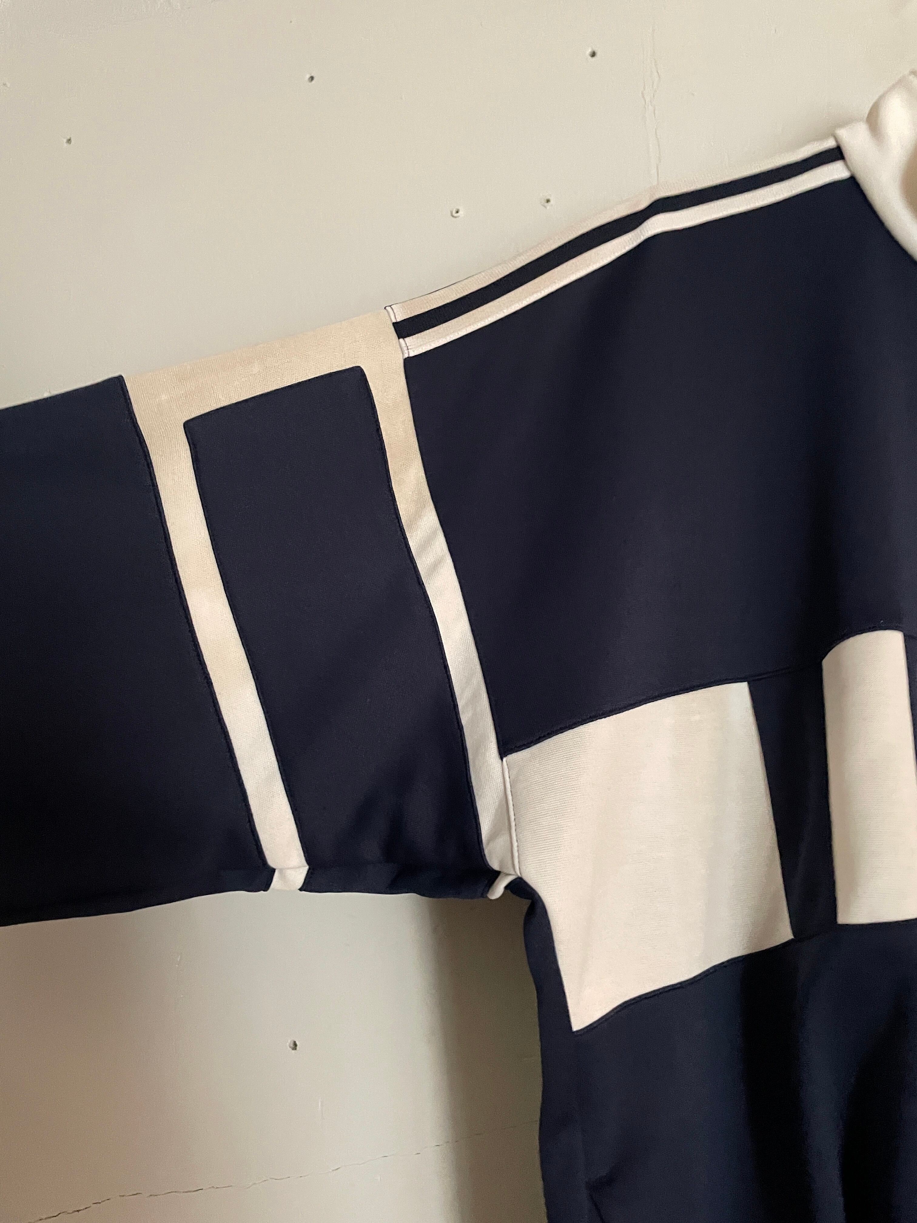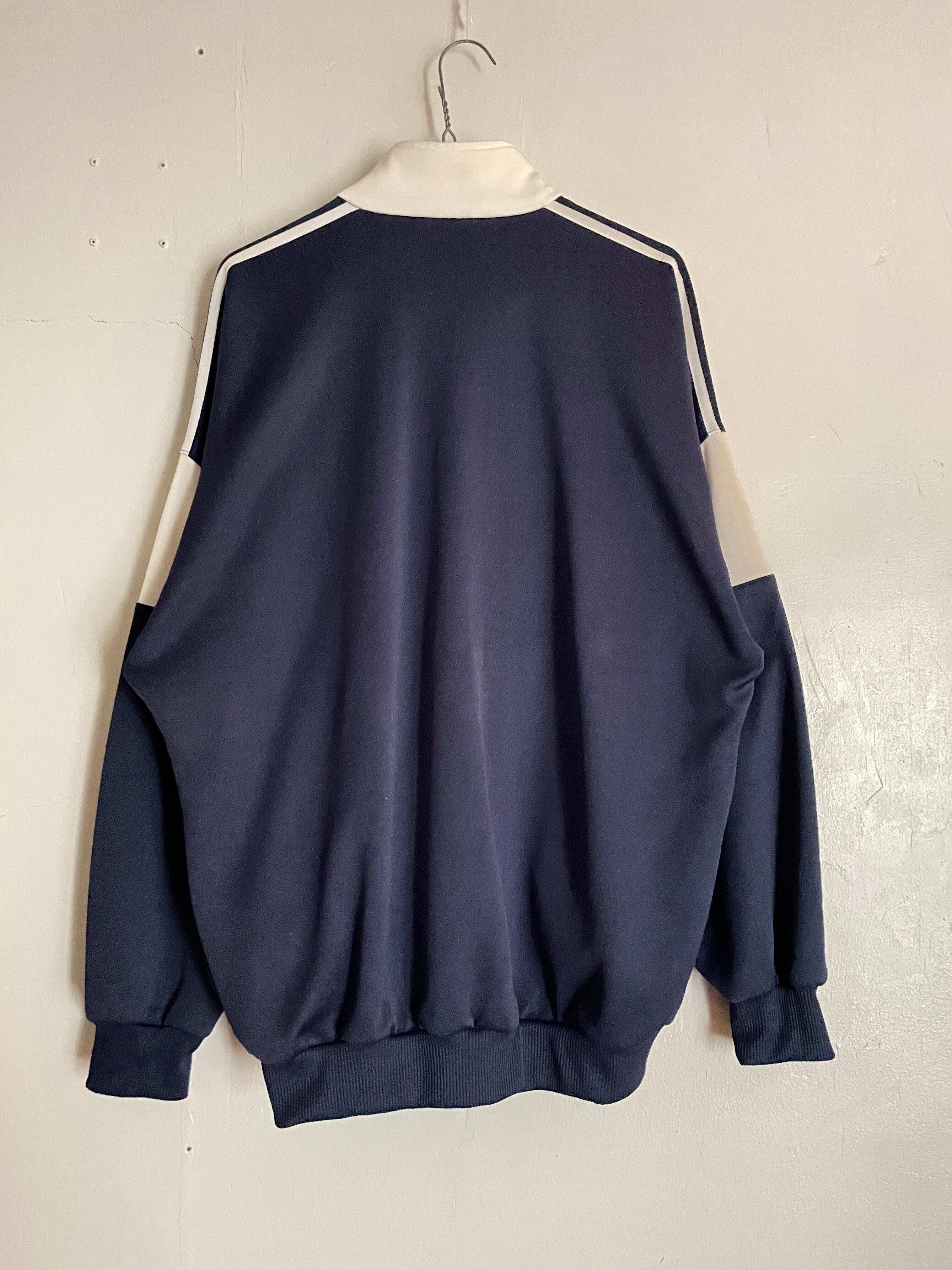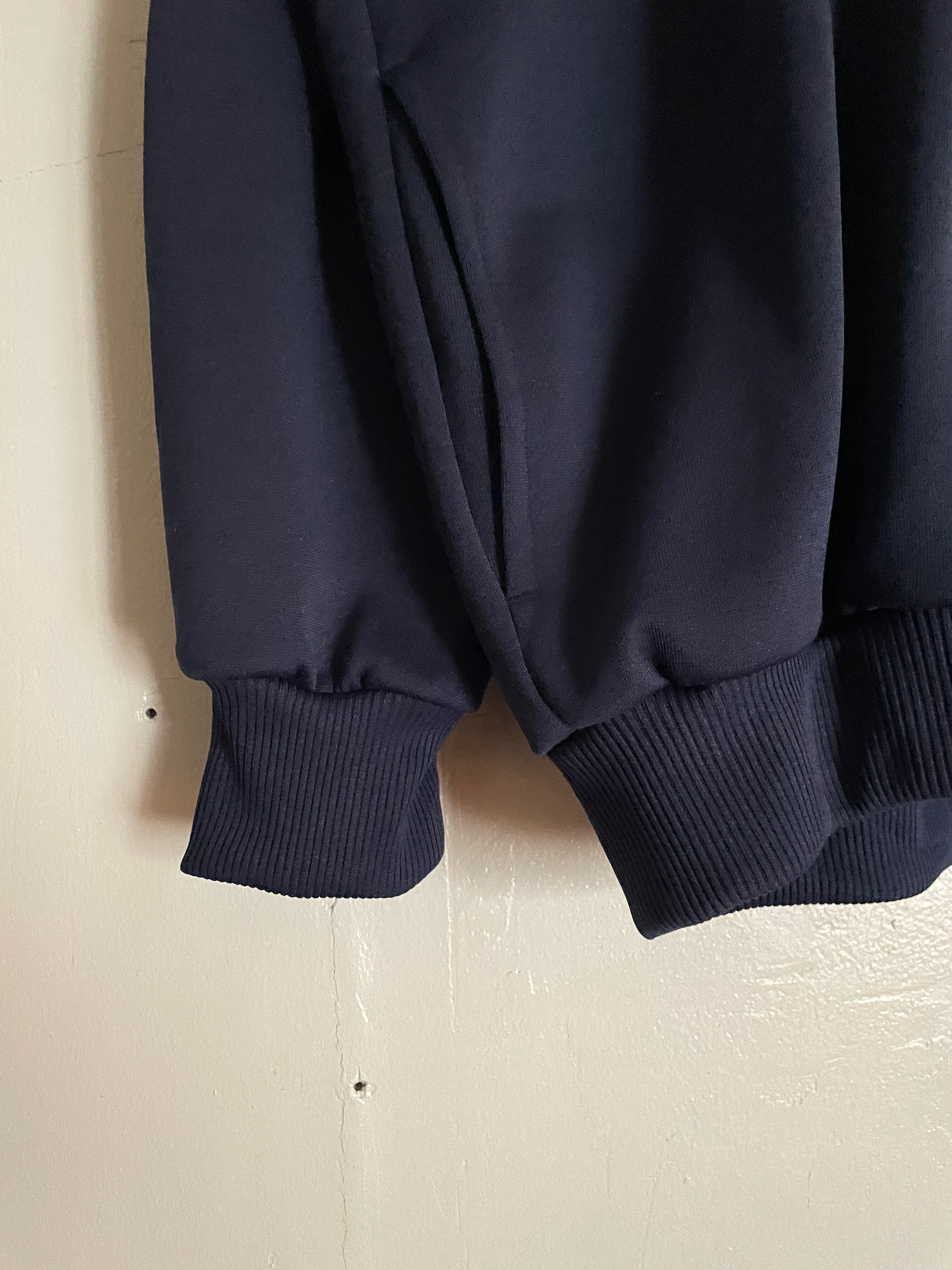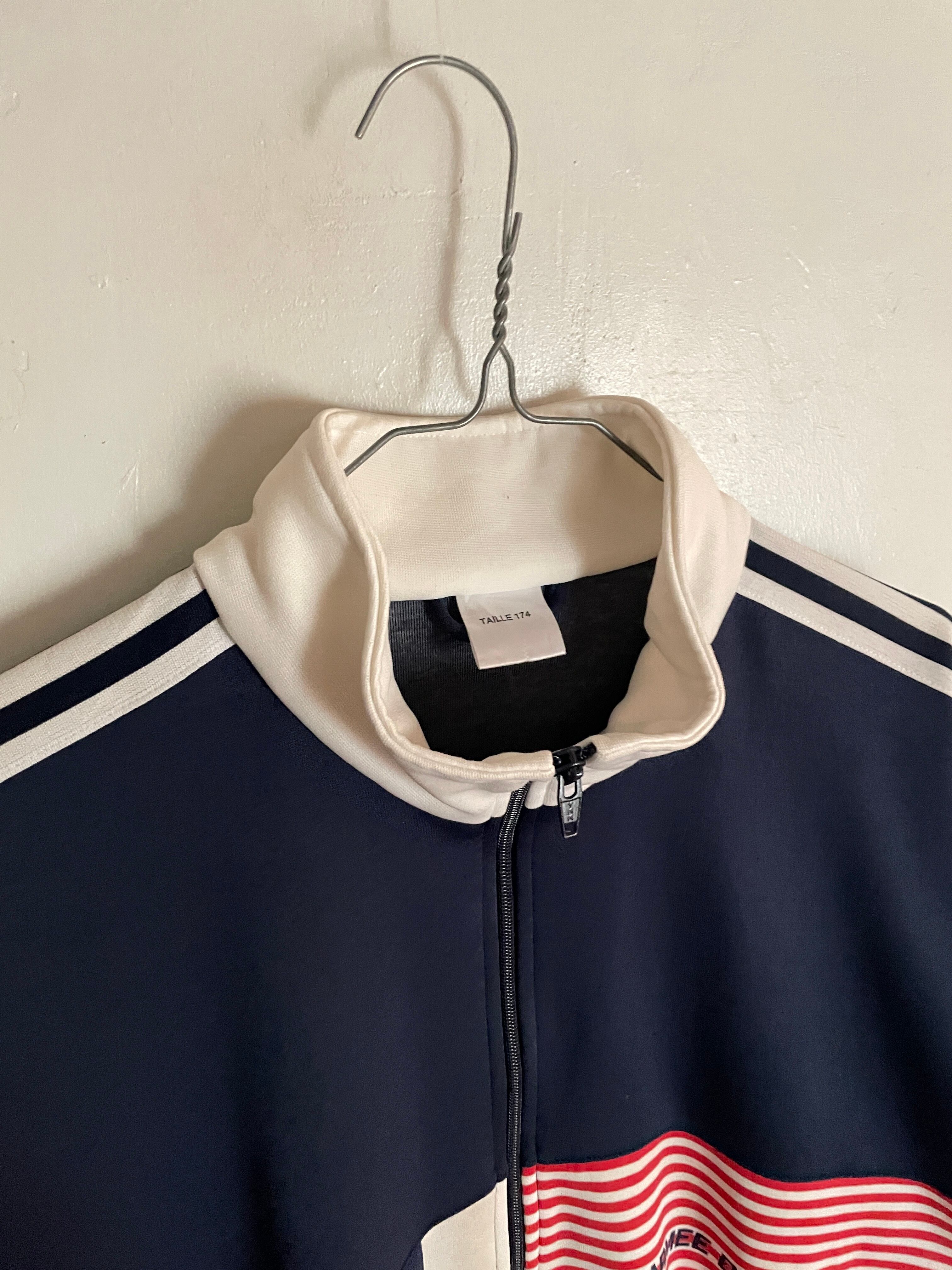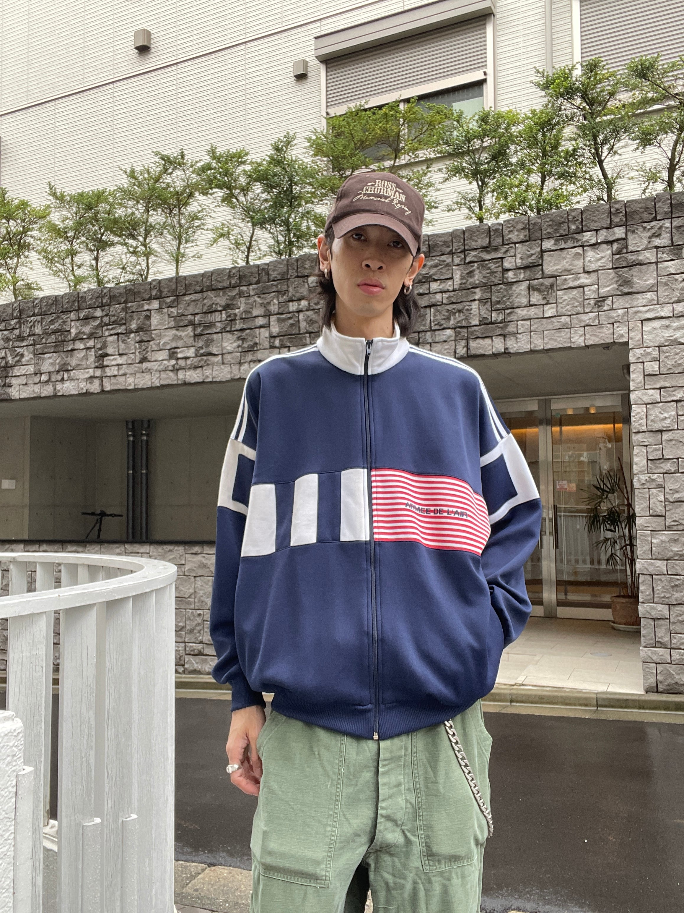 ネイビーボディに、お洒落なデザインが施された、トラックジャケット。ネームプリントから見て、フランス空軍のトレーニング用に着用されていた物だという事がわかります。白と赤のラインが入ったトリコロールカラーが特徴的です。袖のデザインもグッドです。ゆったりとしたサイズ感で、今の時期にはぴったりのアイテムかと思います。
