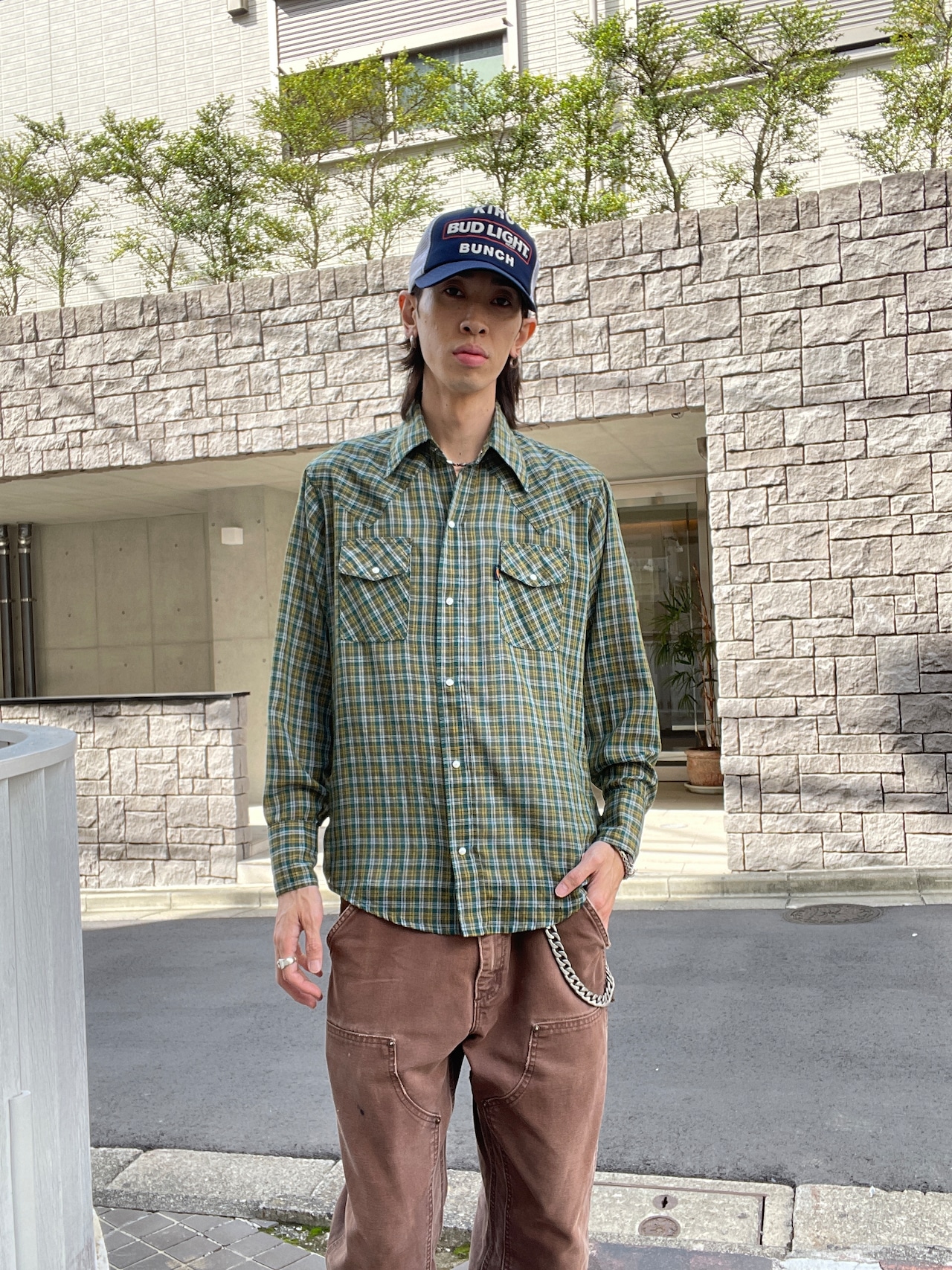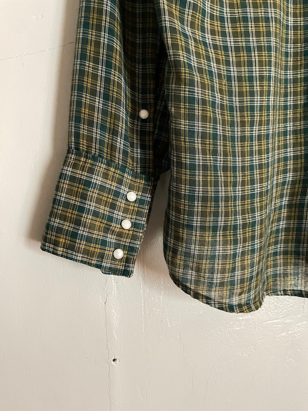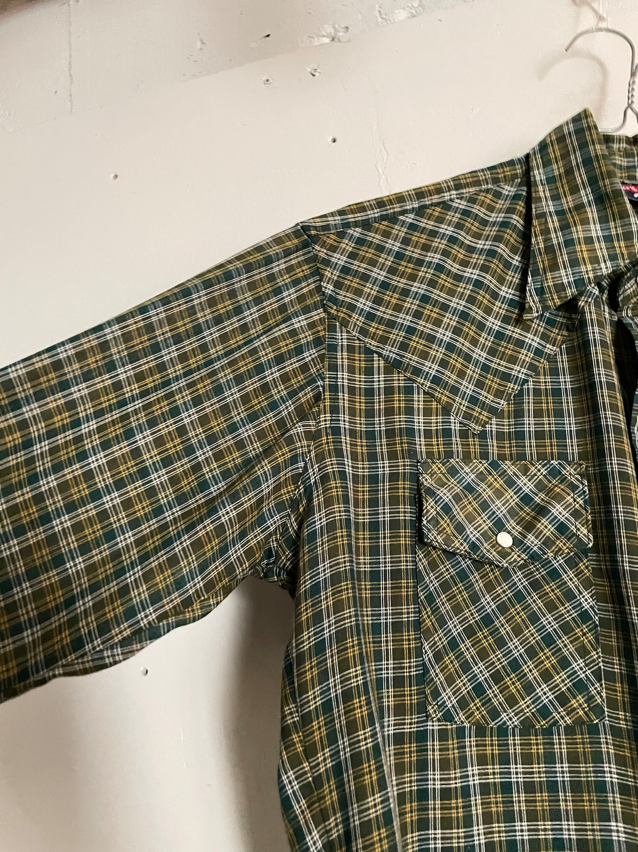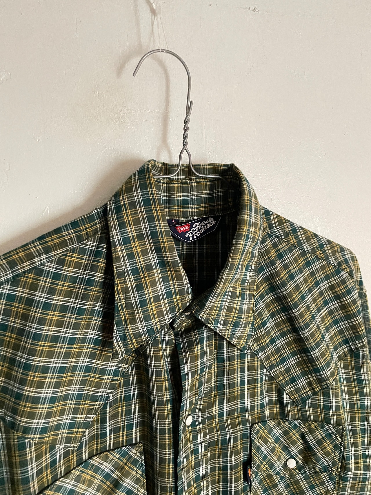 やや透け感のある、お洒落なチェック柄デザインが魅力的な、リーバイスのウエスタンシャツ。70年代に展開していた、”フレッシュプロデュース”ラインのシャツです。通常のリーバイスとは異なり、人参の形をしたタグ”キャロットタブ”が特徴的です。70年代らしさをしっかりと感じさせる、大振りな襟や、ヨークデザイン。縦長なポケットも洒落てます。サラッとした軽い素材感なので、今の時期にはぴったりな一着かと思います。