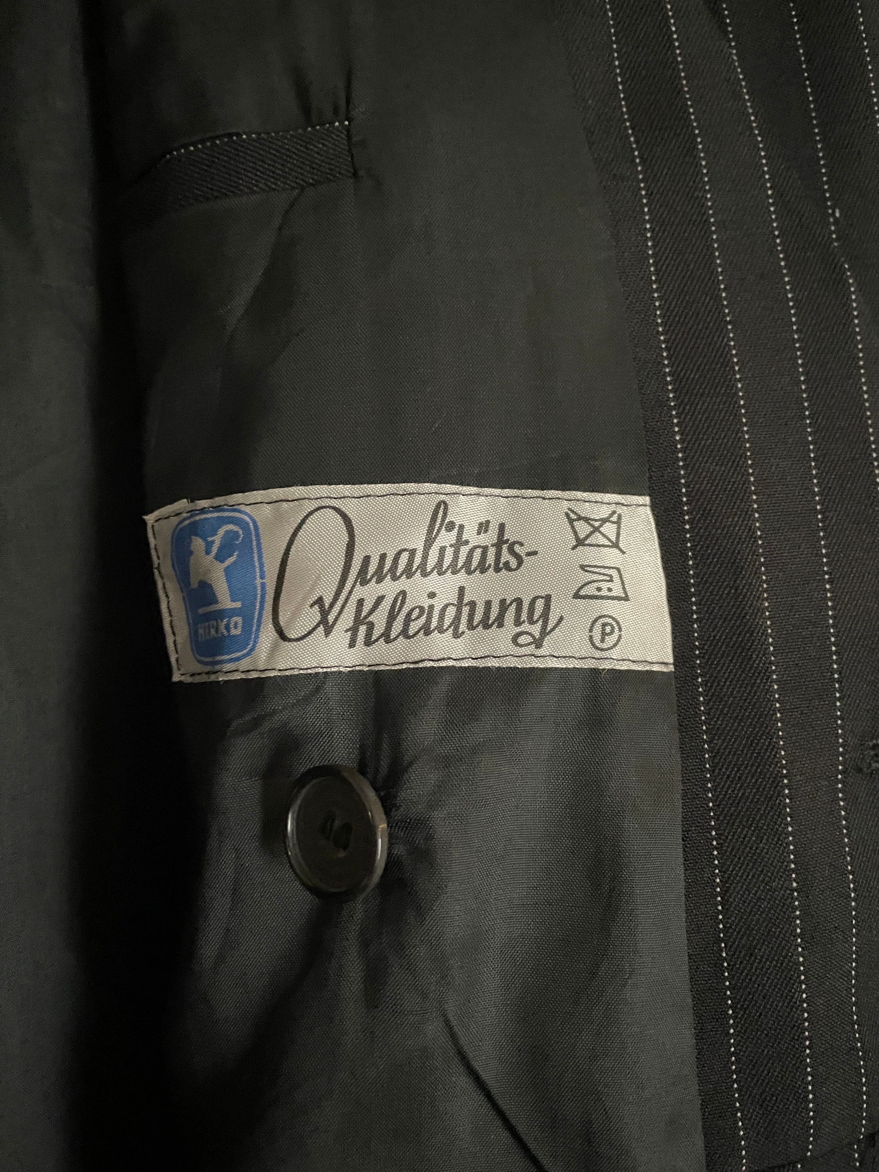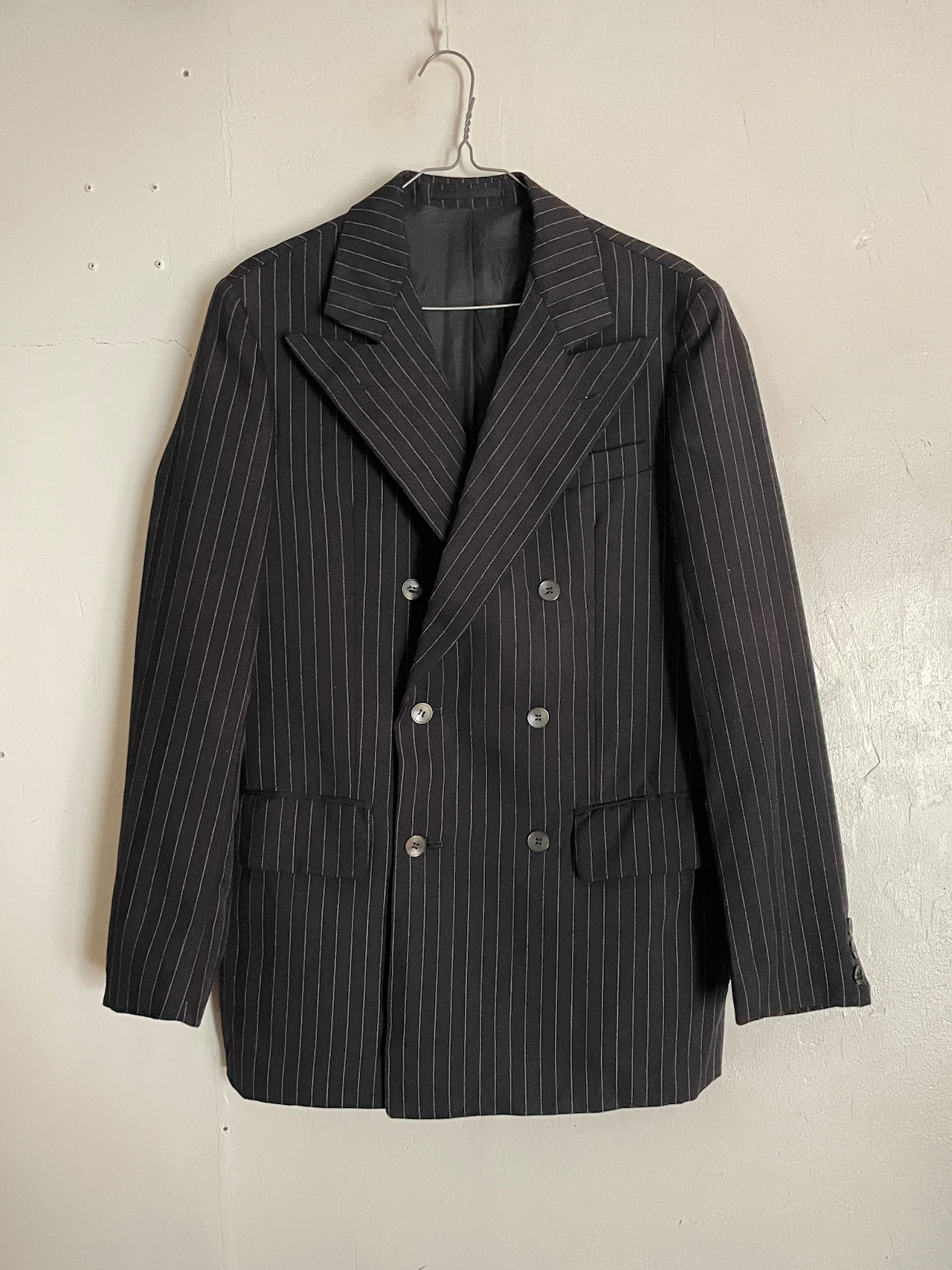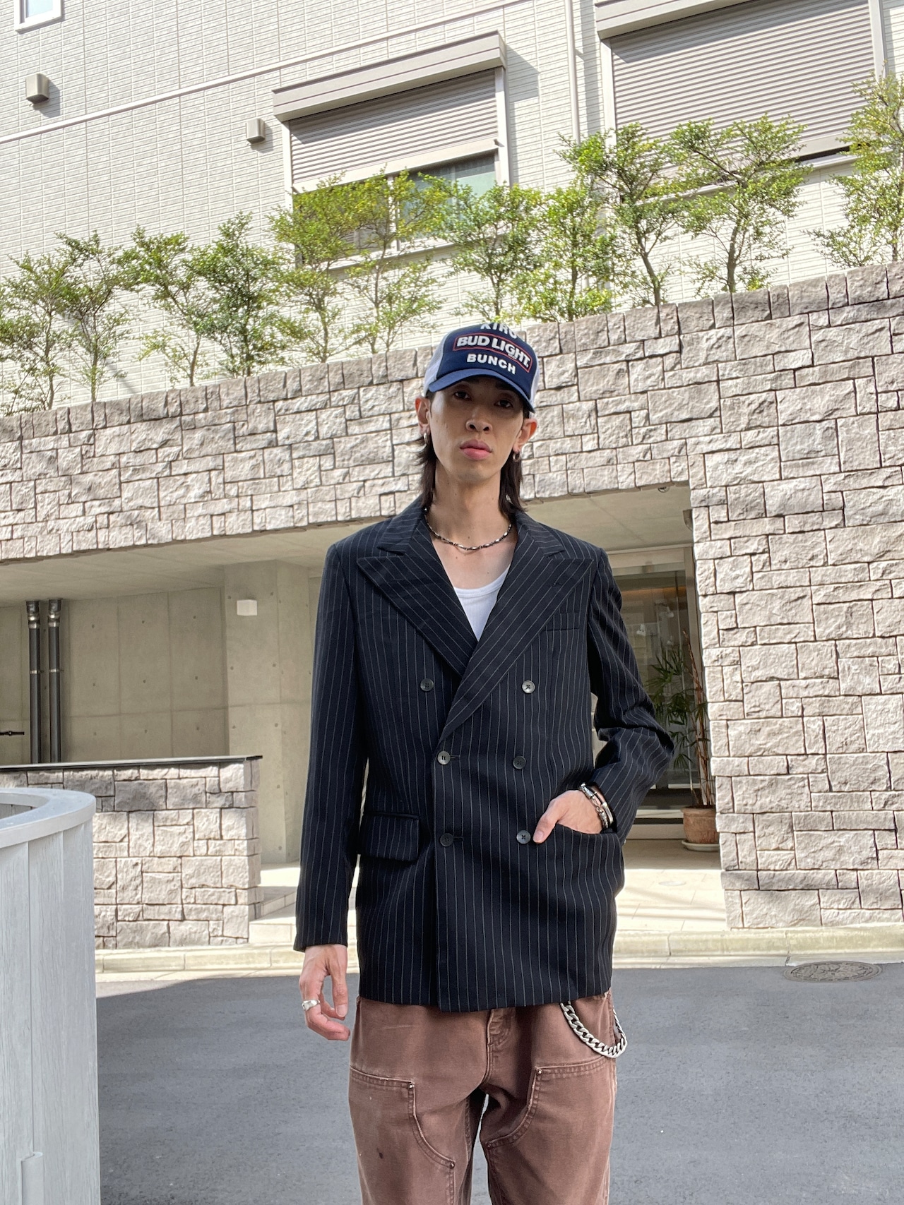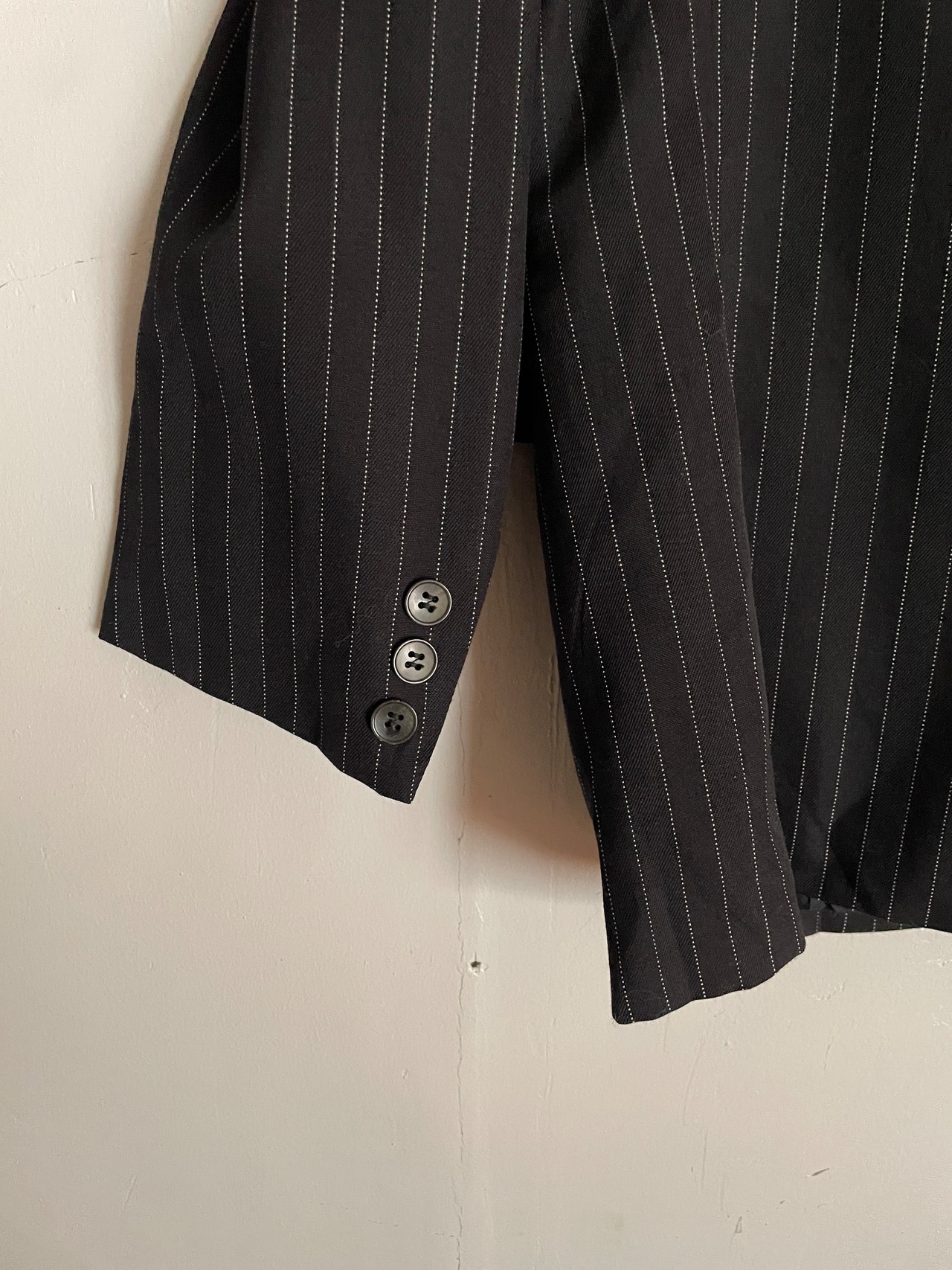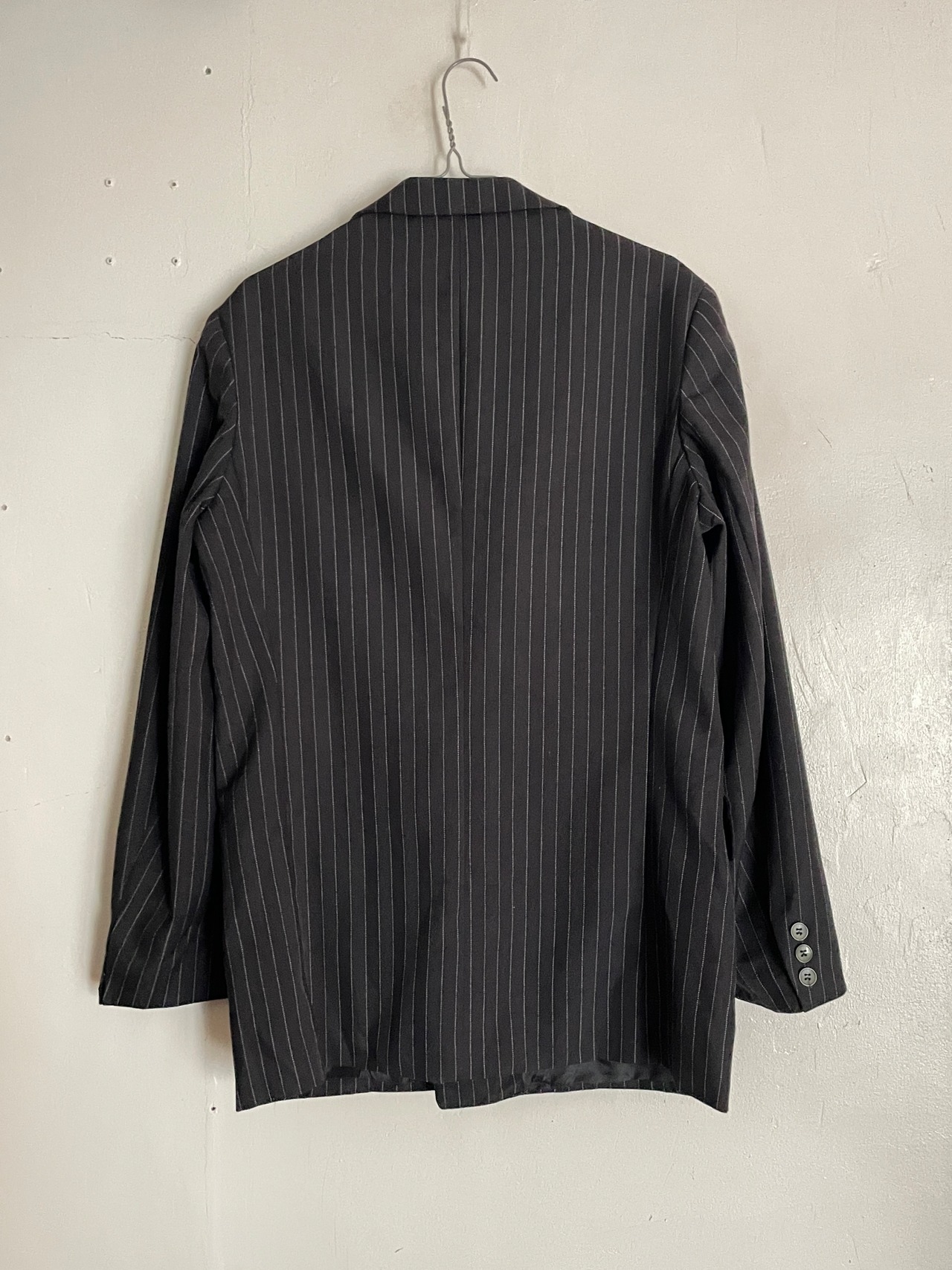 ブラックボディに、細めなストライプデザインが魅力的な、テーラードジャケット。ダブルタイプです。上品さもありつつ、カジュアルな雰囲気も感じられる一着。やや縦長の綺麗なシルエットになっています。癖が無い分、幅広いジャンルに取り入れやすいジャケットかと思います。