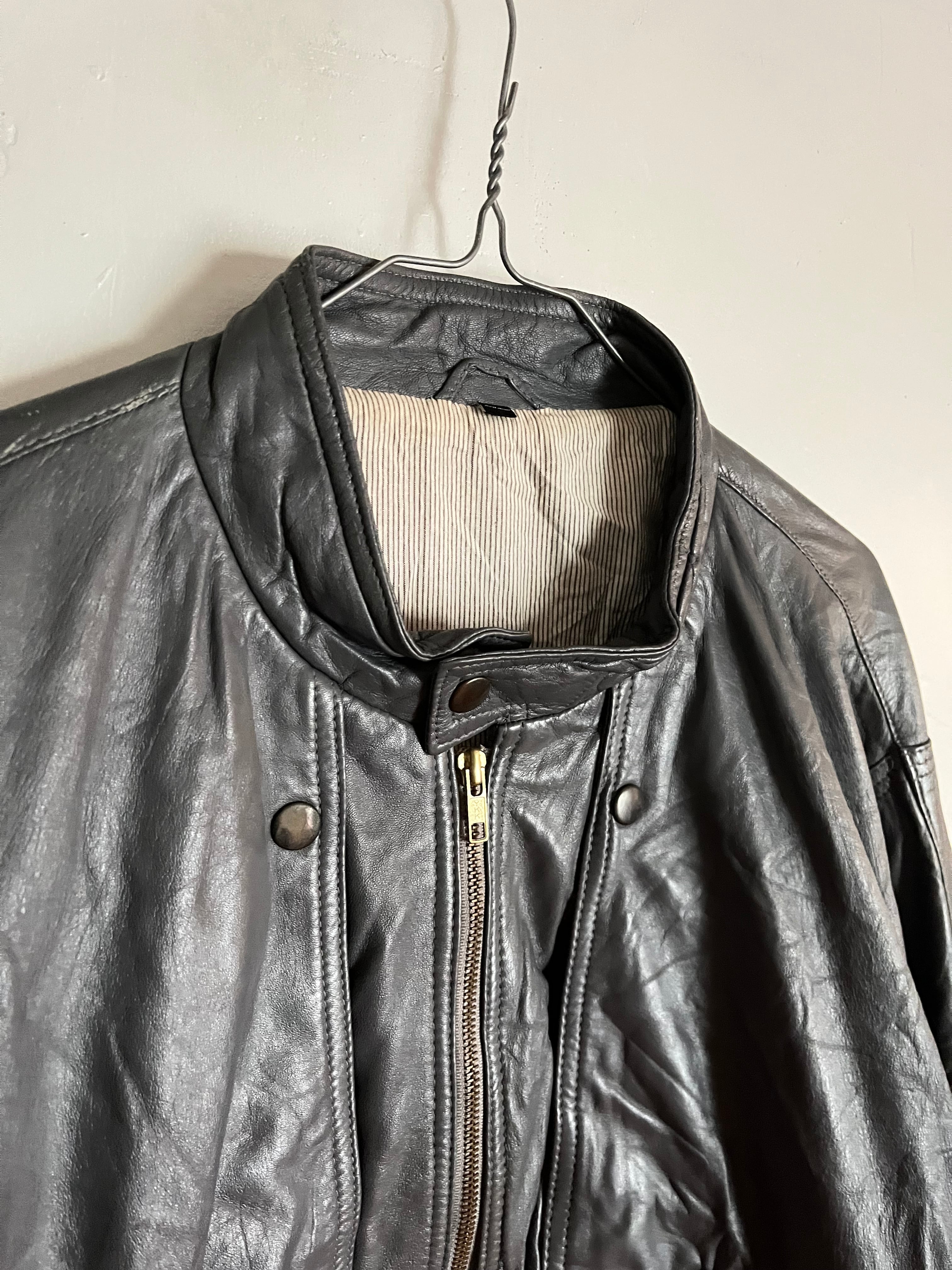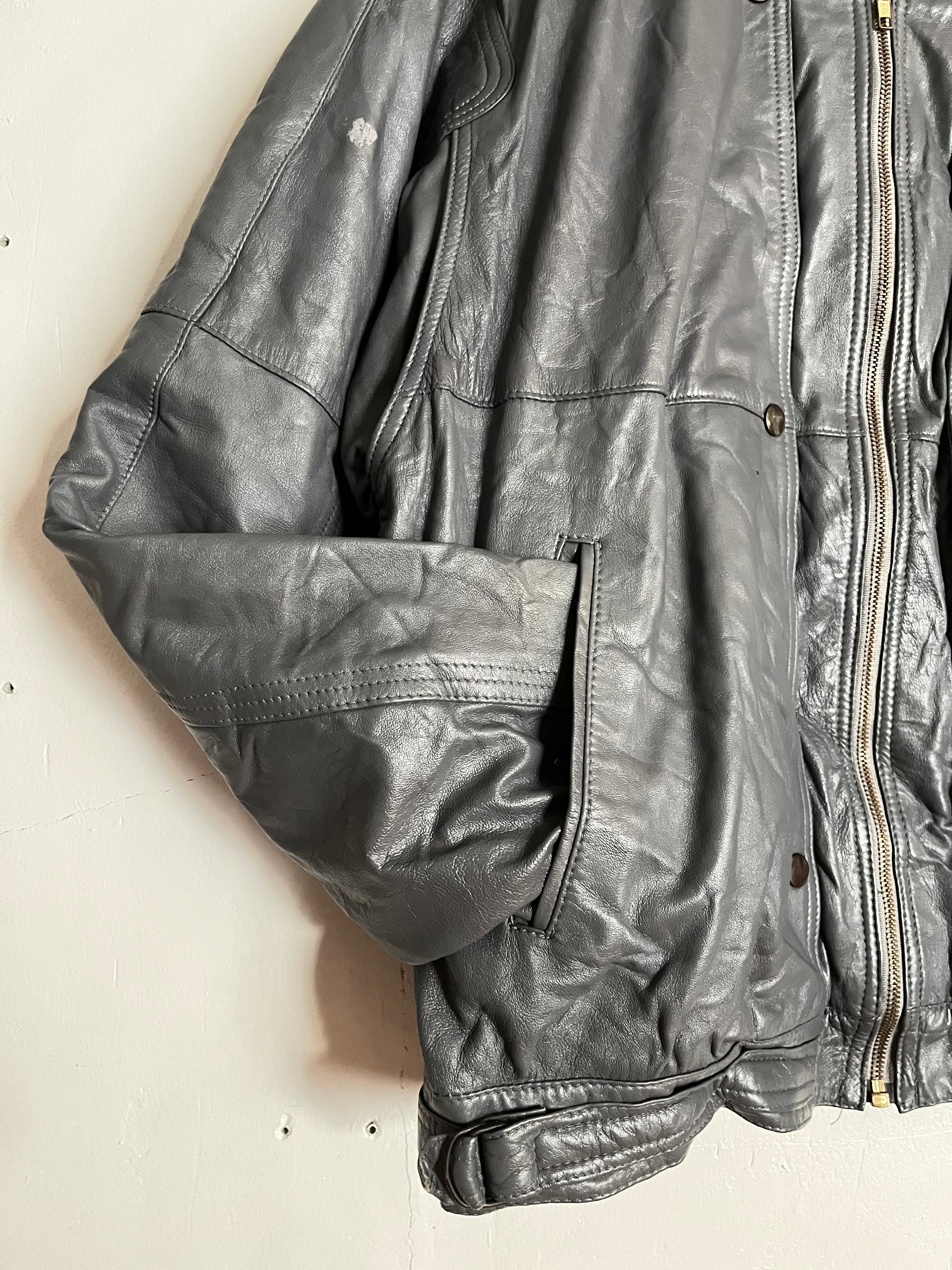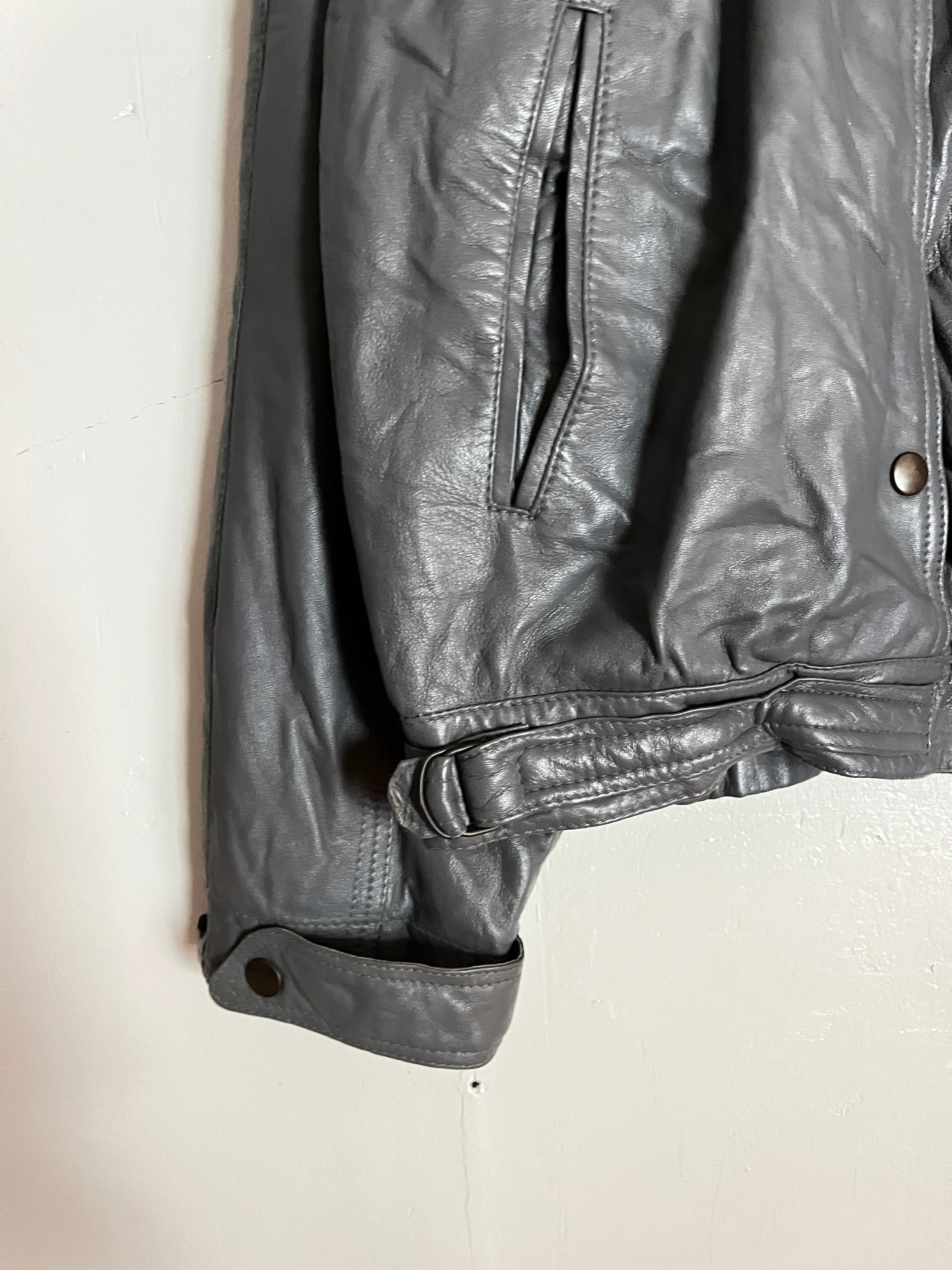 スタンドカラーとなっており生地がレザーとなっているため風をとさないので、これからの季節にぴったりのアイテムとなっております。また、サイドにポケットが二つ付いており、左胸の方にもチャック付きのポケットが付いているため、機能性にも優れています。