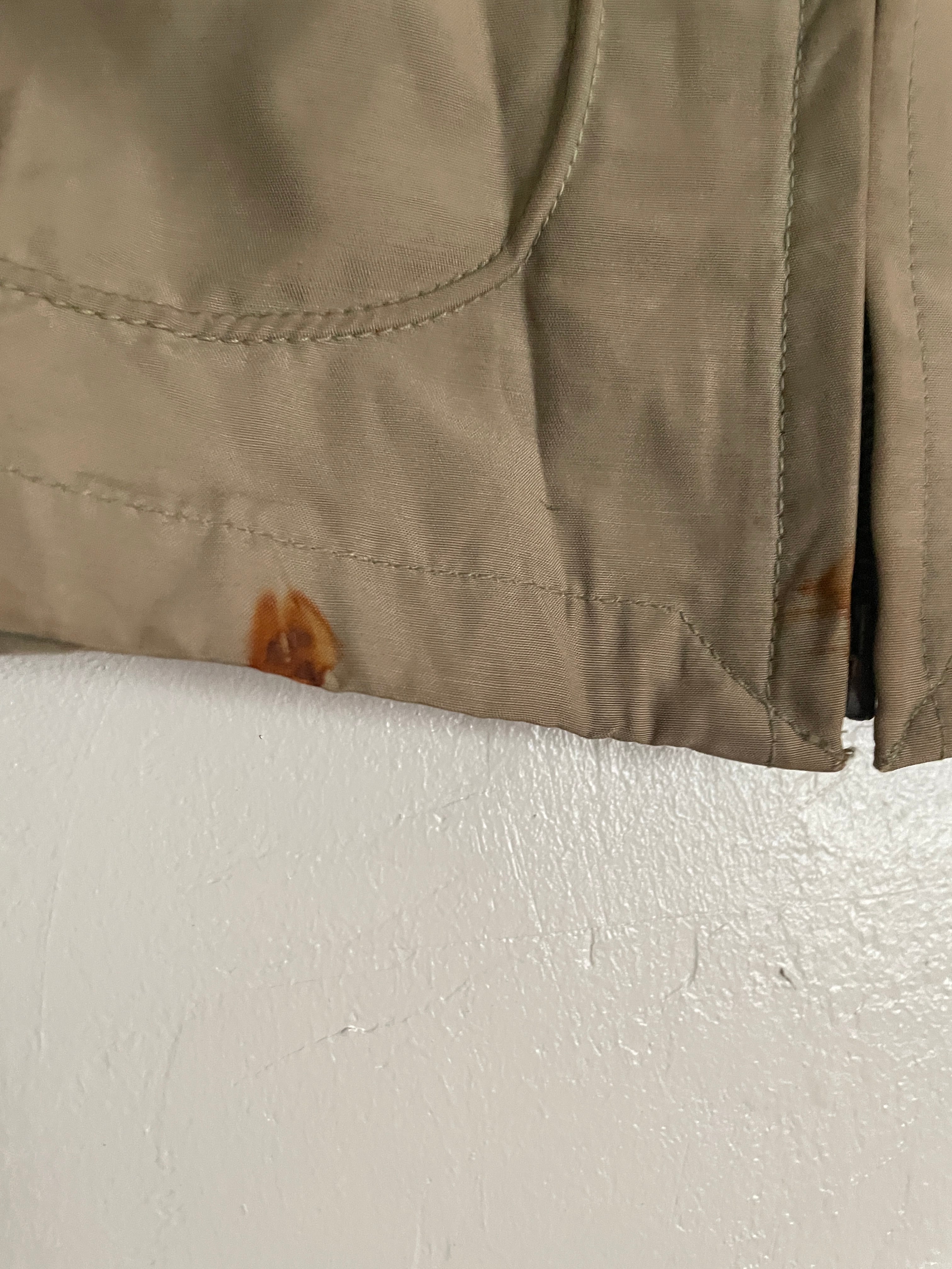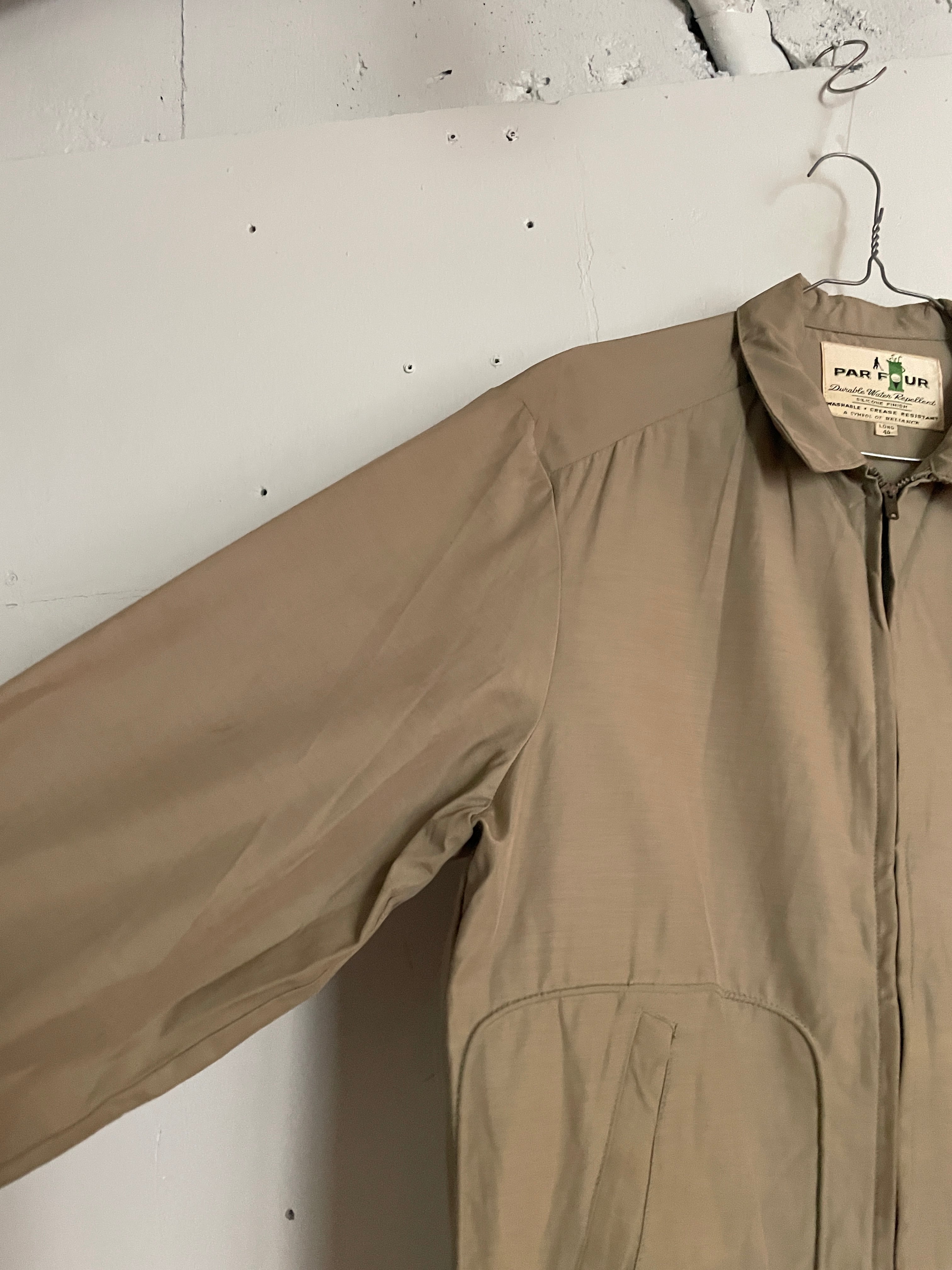 ベージュのシンプルなドリズラージャケット。素材はややナイロンに近く、かなりライトなジャケットです。色味は暗めのベージュで、アメリカンカジュアルな雰囲気があり少し大人なスタイリングにぴったりです、また着丈も短くスタイルアップに役立つアイテムなので、この秋にライトアウターをお探しの方にはぜひ手に取っていただきたいアイテムです。裾部分に汚れが見られます。
