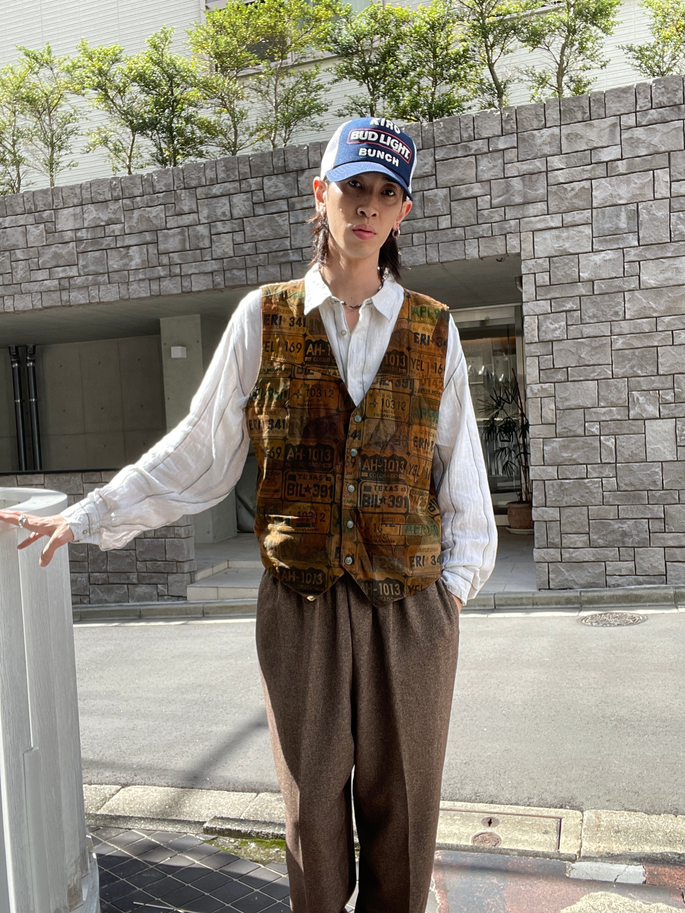 前面に様々な州のナンバープレートを模した柄デザインが施された、スエードレザーベスト。あえて雑に縫い付けられているような、お洒落なデザインになっていましす。バックは柄、生地感が前面とは違っていて、前後でメリハリのある面白いディテール。確実にファッションの良いアクセントになってくれるレイヤードアイテムです。