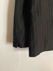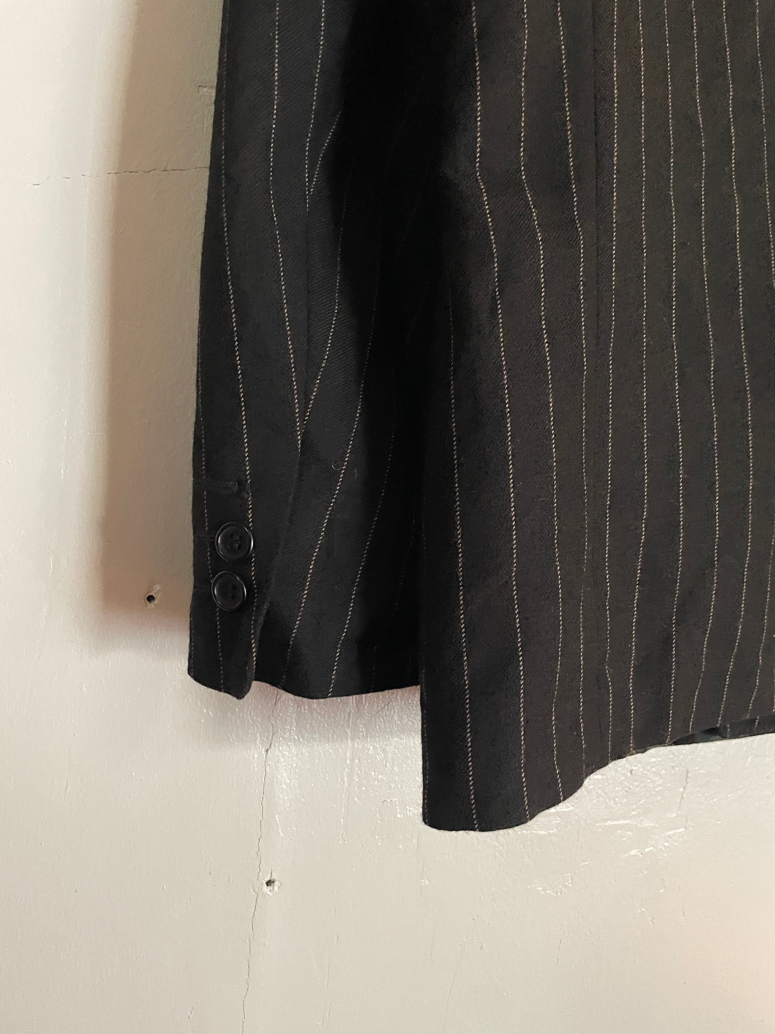 ブラックボディをベースに、細めのベージュストライプが全体に施された、ダブルテーラードジャケット。縦長の綺麗で上品なシルエット。ポリエチレンとウールのフワッとした質感になっています。綺麗めなどにはもちろんですが、カジュアルなスタイルにも落とし込めるアイテムかと思います。