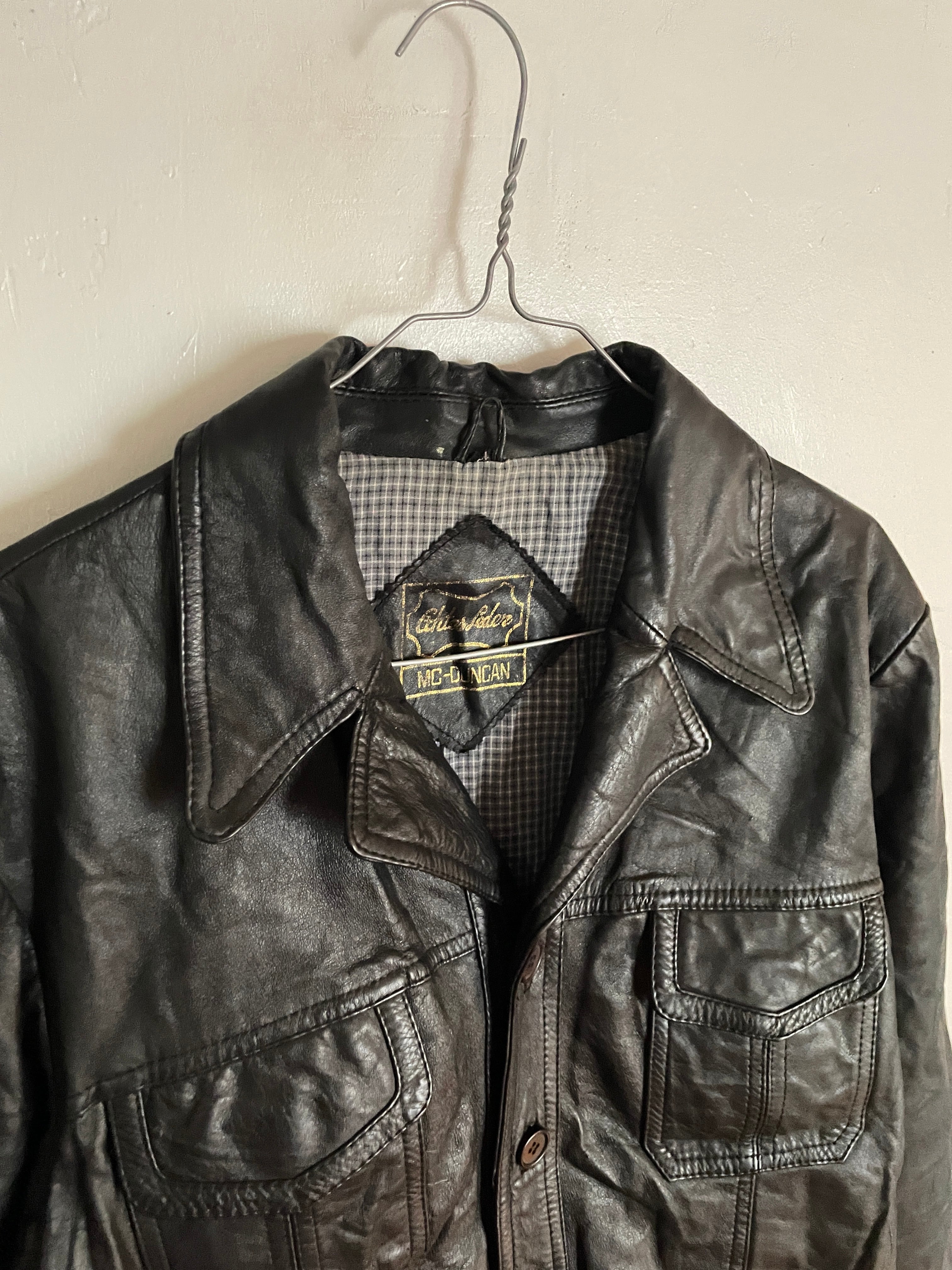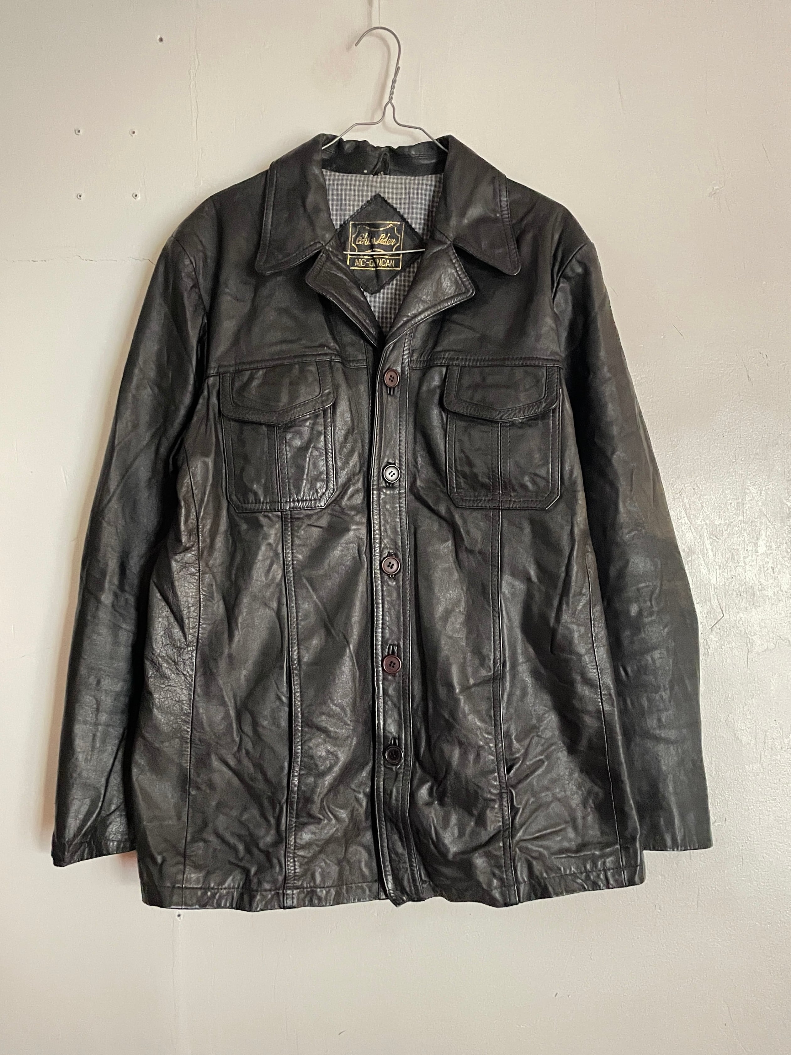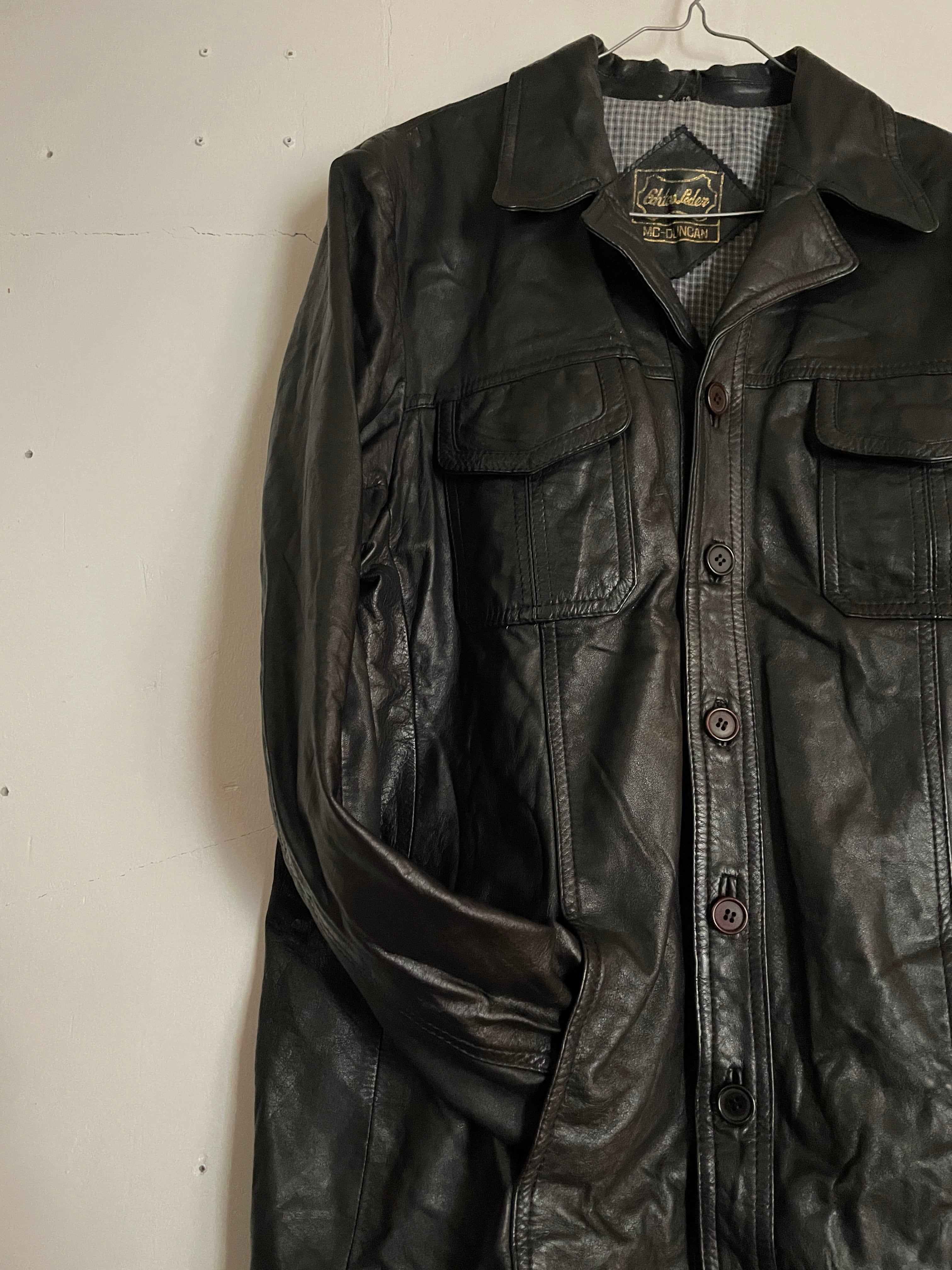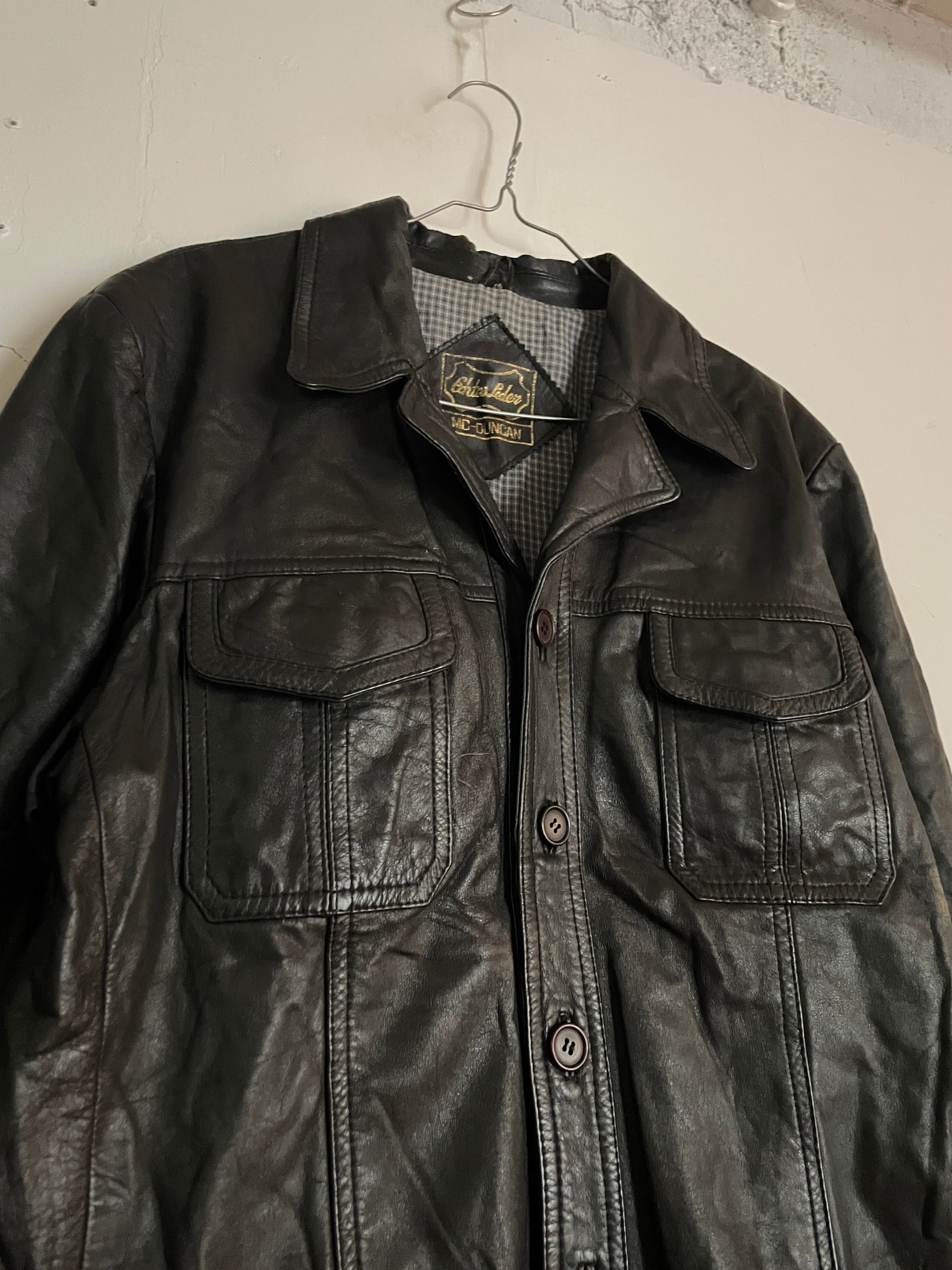 やや光沢感のあるブラックボディで、綺麗な縦長シルエットが魅力的な、レザージャケット。モチッとした上品なレザー。大振りめな襟からは70年代の雰囲気が感じられます。フラップポケット付きなのも嬉しいです。裏地はサラッとしたポリとコットン素材で、お洒落なチェック柄。文句無しでかっこいい、渋いディテールになっています。
