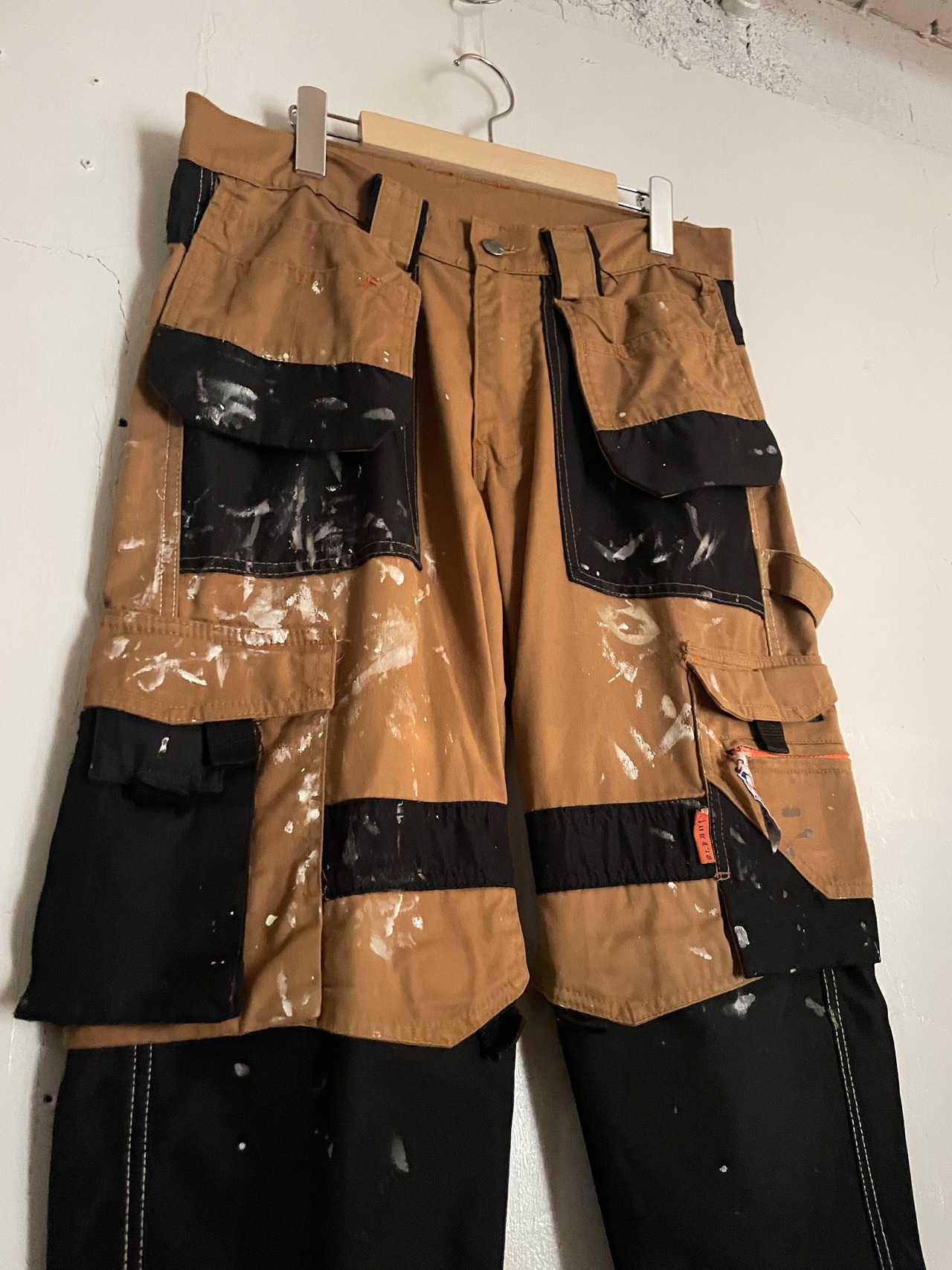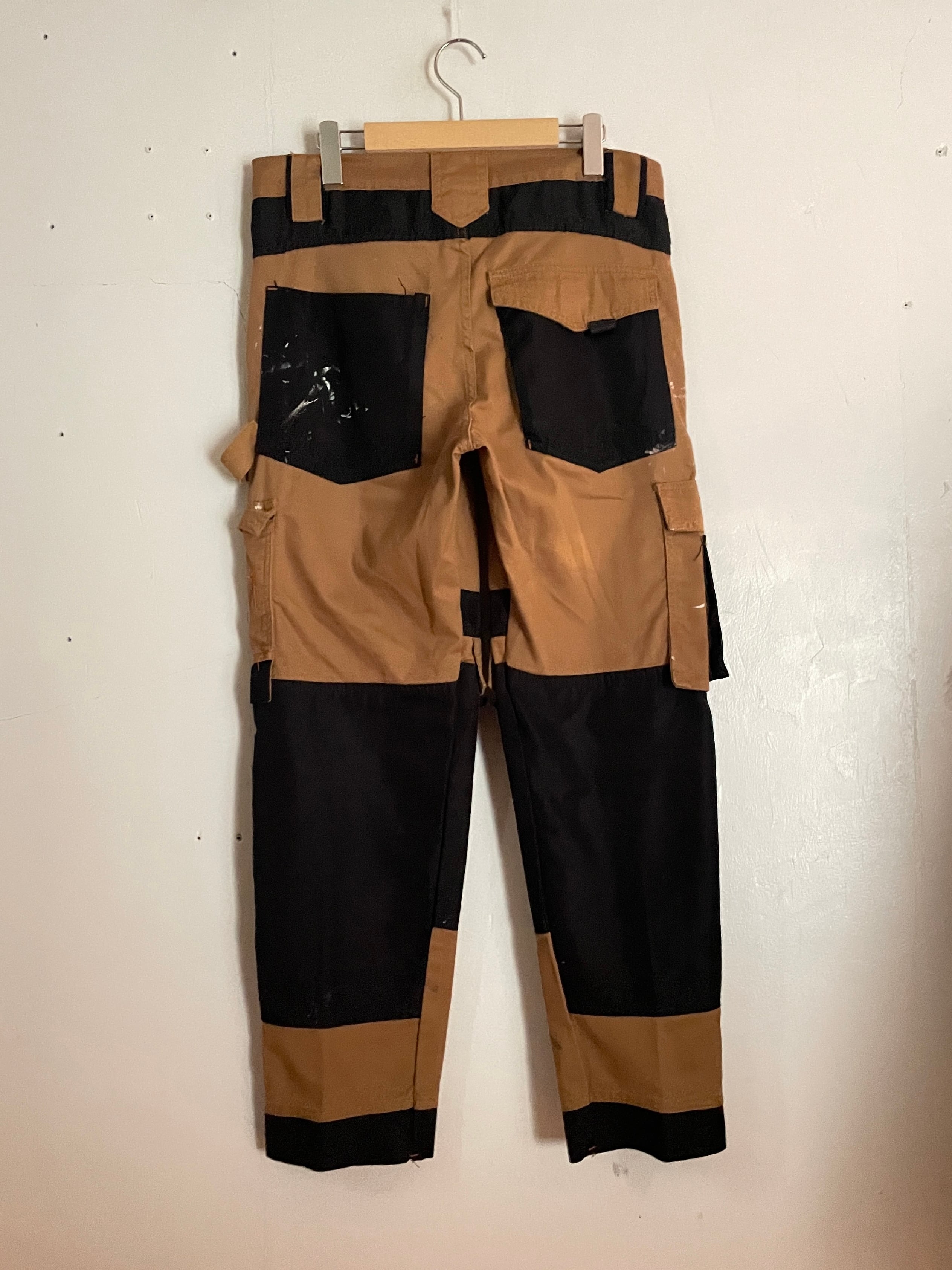 ブラウンとブラックの、2トーンカラーで、全体にペイントデザインがあしらわれたカーゴパンツ。雰囲気のあるペイントとポケットの多さが魅力的な一本。2色の色の切り替えがお洒落です。裾にかけてテーパードがかった、太過ぎず細過ぎない程良いシルエット。間違い無くファッションの主役になってくれるパンツかと思います。