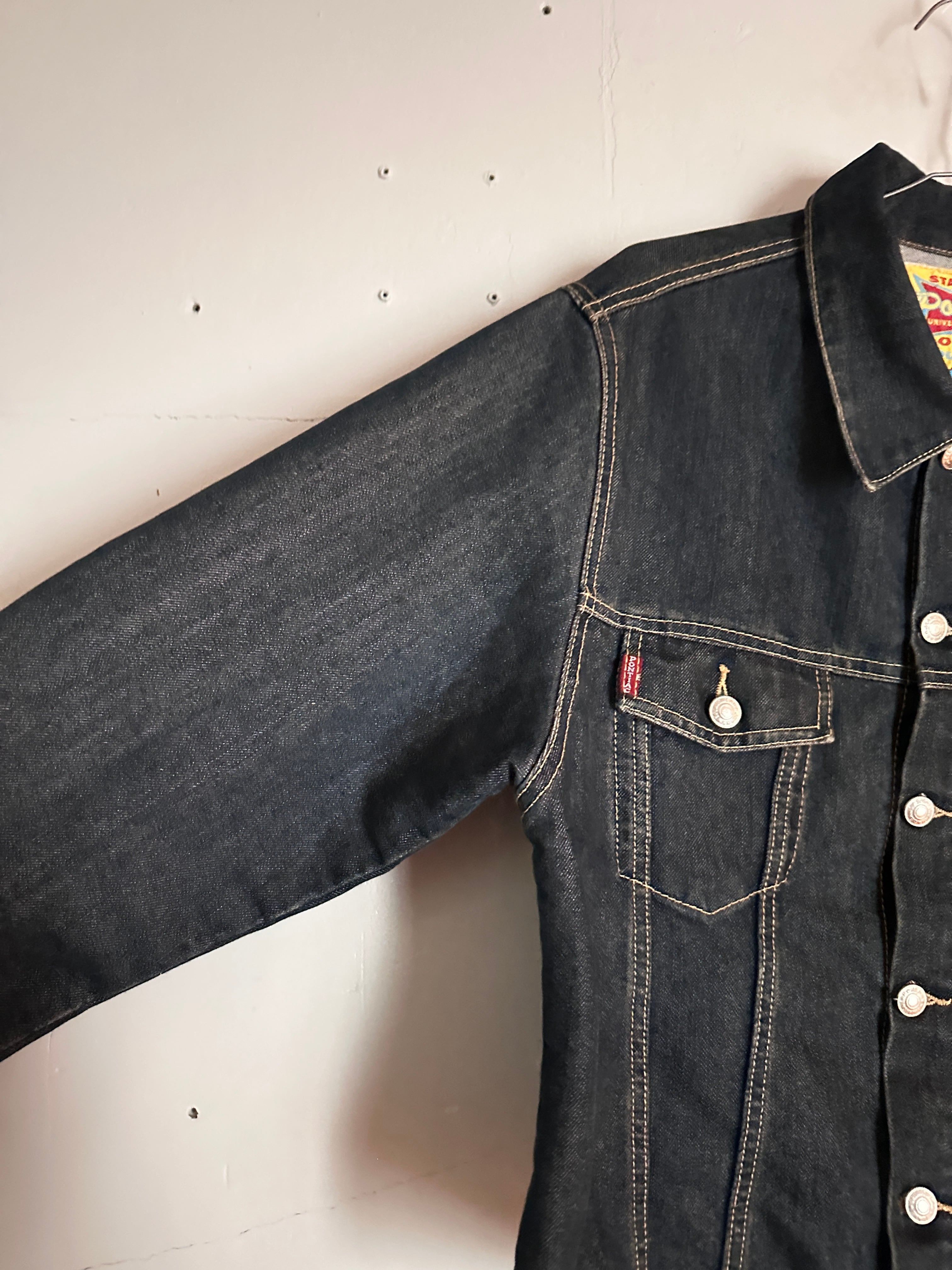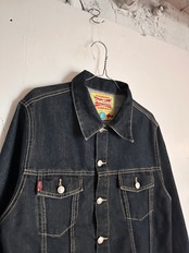 非常に綺麗な濃紺のデニムジャケット。着丈、身幅ともにタイト目で、カジュアルなスタイルにはもちろんスラックスなどに合わせた綺麗めなスタイルにも合わせていただけます。まだほとんど色落ちがなく、経年変化を楽しめるのもこのジャケットの魅力の一つです。秋物をお探しの方には非常にピッタリなアイテムだと思います。