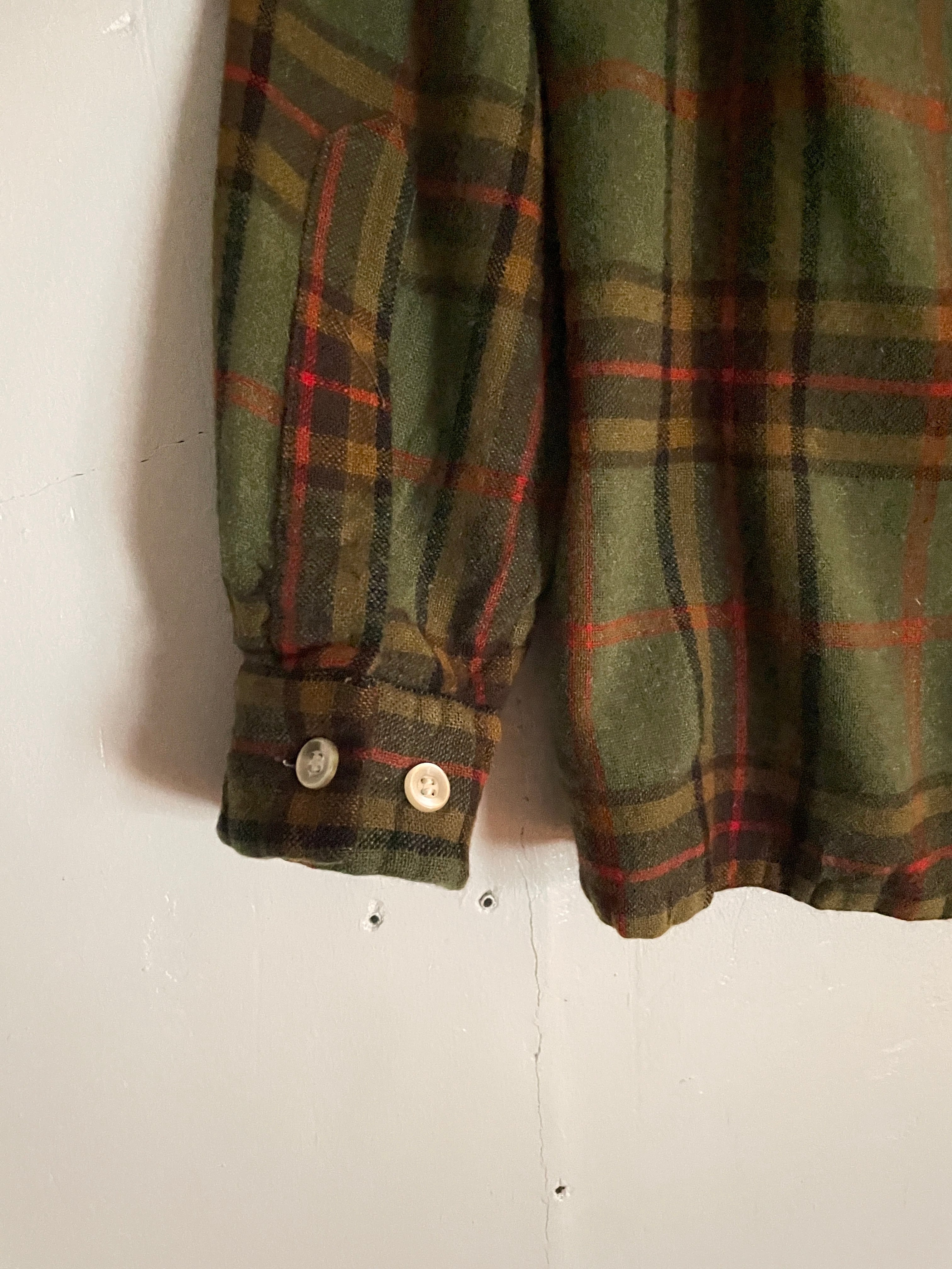 秋を感じられるお洒落なチェック柄デザインの、フランネルチェックシャツ。タグを見ると、70年代頃のアイテムだと言うことが分かります。上品で質の良いウール素材。絶妙にグッドな配色デザインです。短丈めでありながら、身幅広めのボックスシルエット。一枚ではもちろんですが、冬場などにはインナーとしても活躍してくれます。しっかりとUSA製なのも魅力的です。