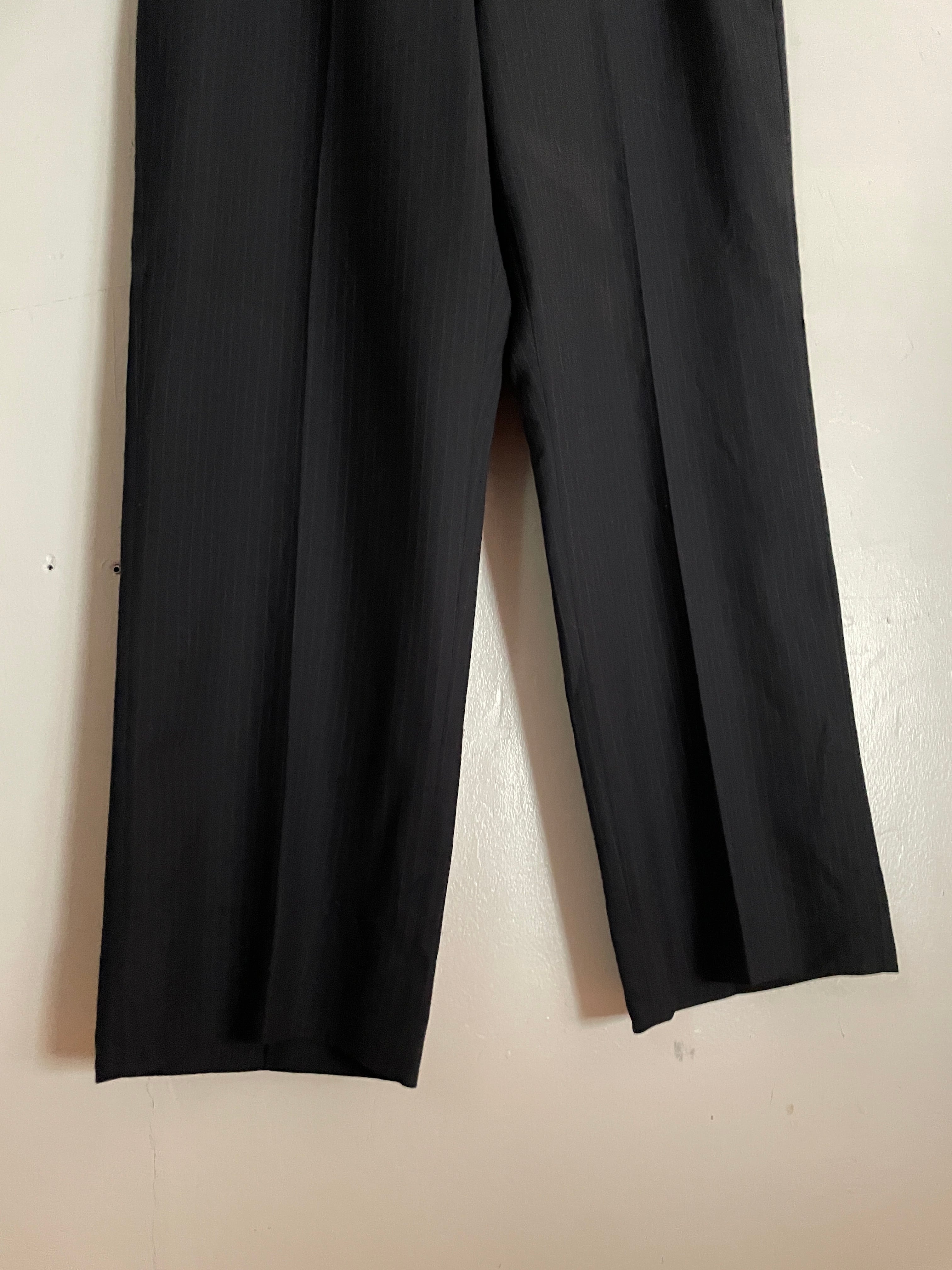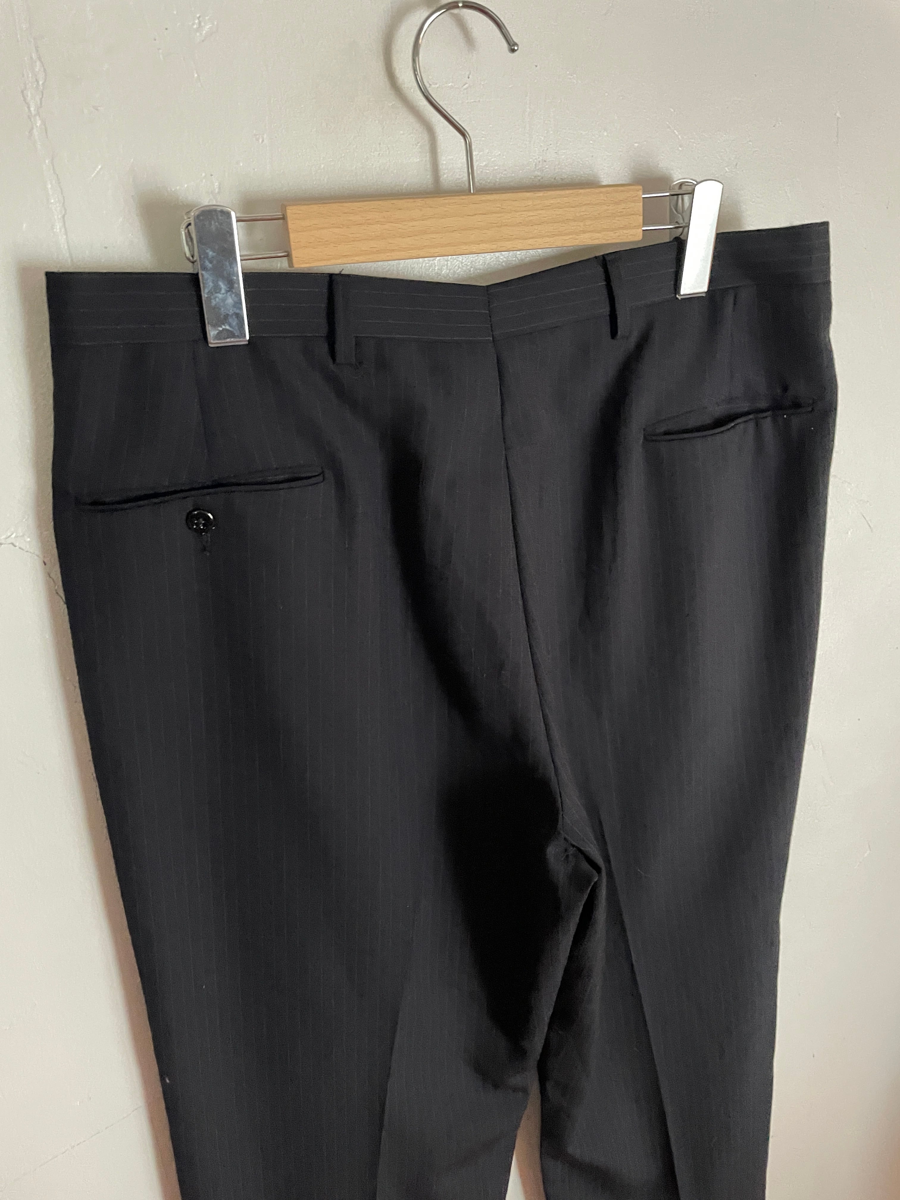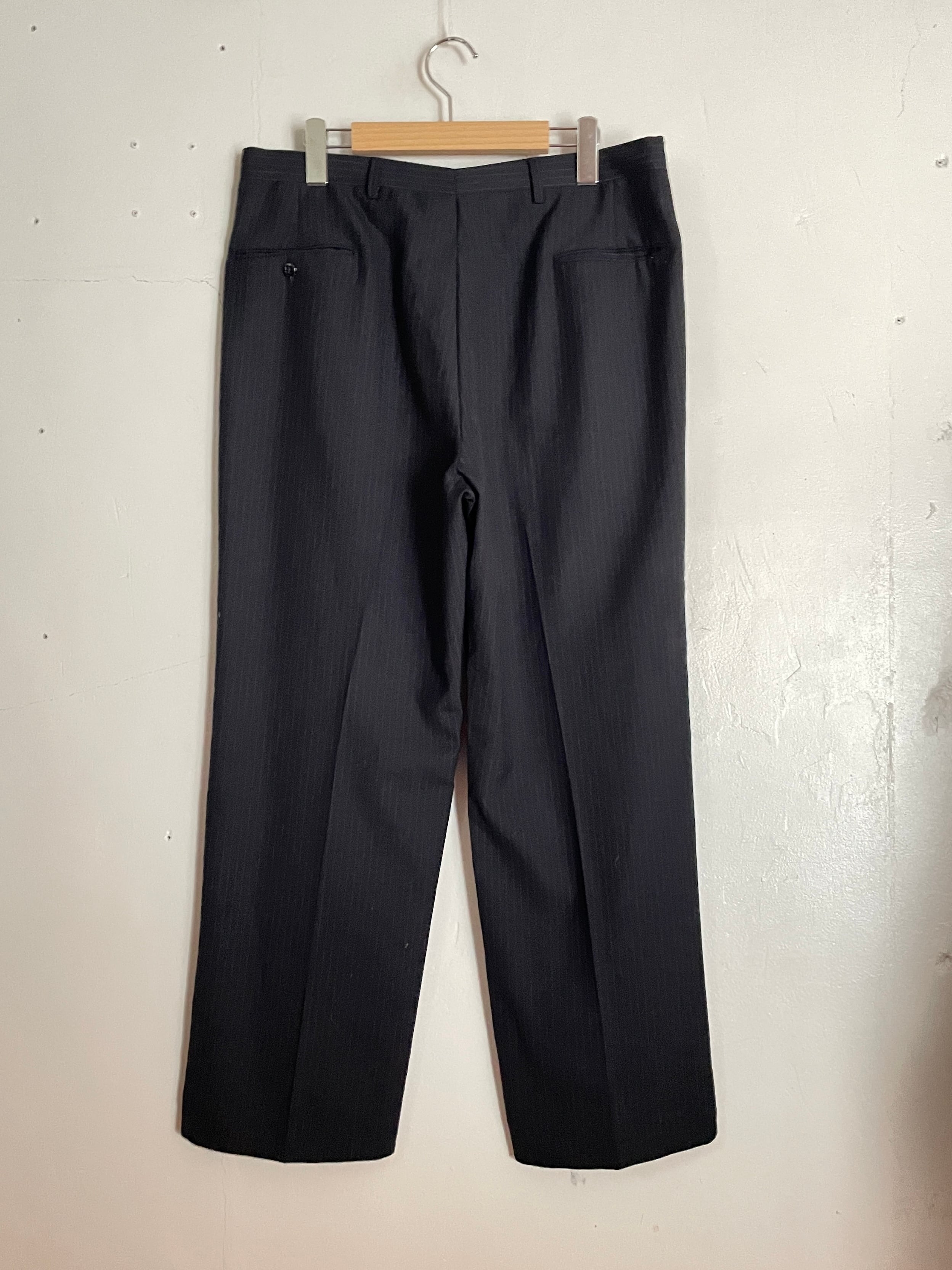ネイビーカラーに、細めのストライプデザインが施された、スラックス。ノータックでワイドストレートシルエット。癖が無く、非常に使いやすいスラックスかと思います。サラッとした肌触りの良い質感で、季節問わず活躍してくれる万能な一本です。
