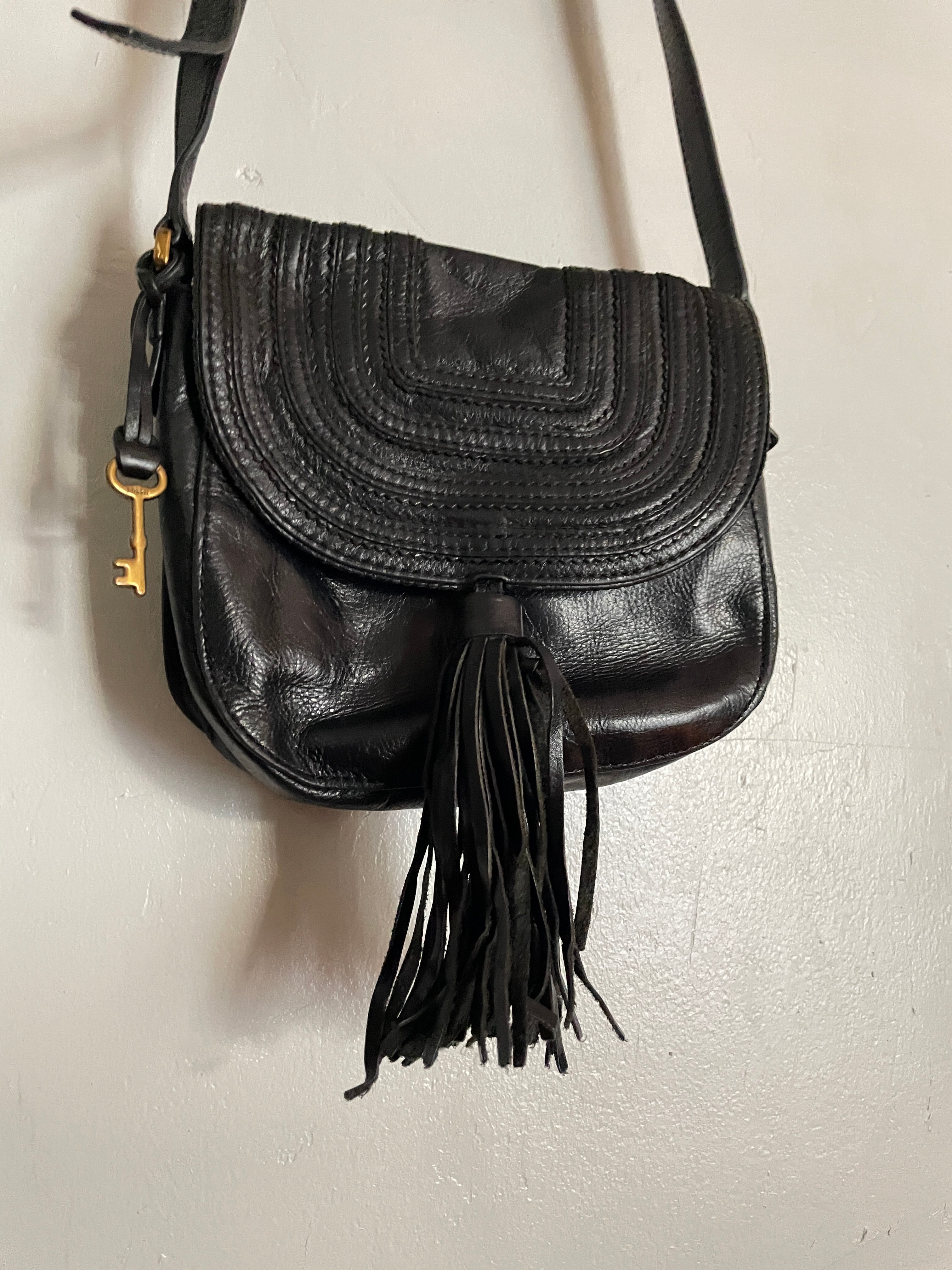 Old FOSSIL Black Fringe Design Leather Shoulder Bag