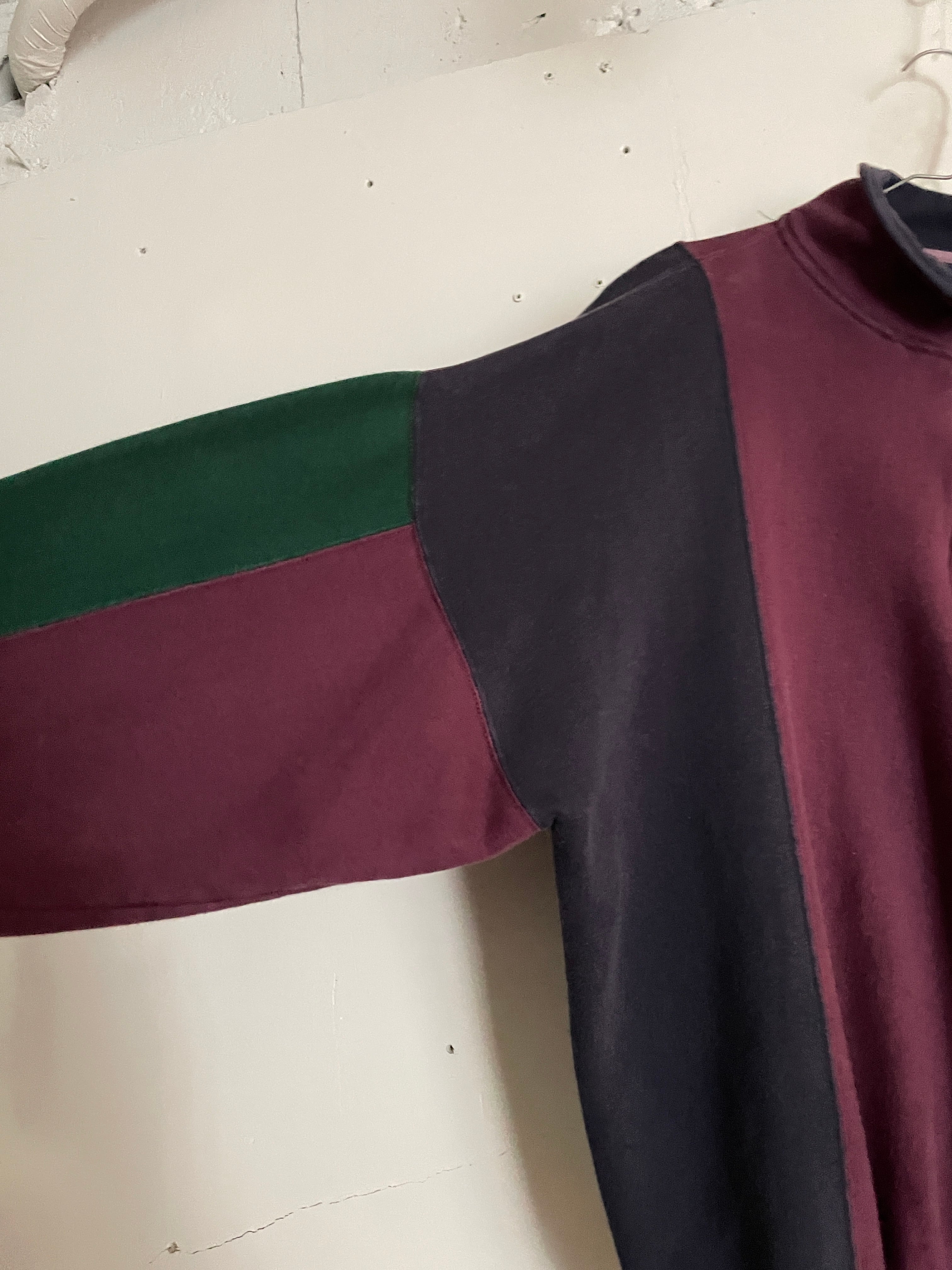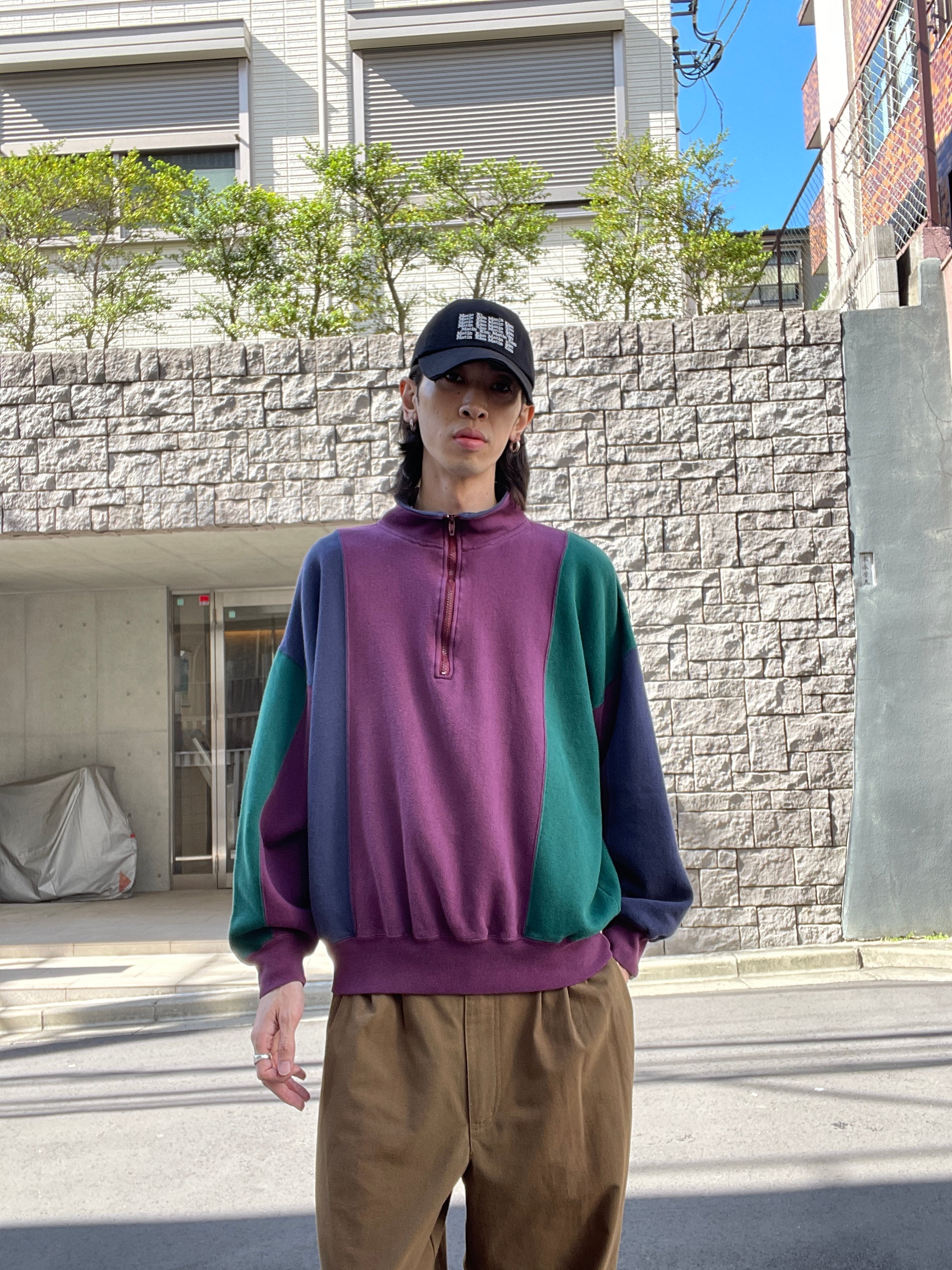 淡いマルチカラーデザインがお洒落な、ハーフジップスウェット。左右で色の配色が違っていて、アンバランスなデザインがグッドです。短丈めでありながら、身幅はかなり広め。肩が落ちるようなシルエットが今っぽいです。まさに秋を感じられるお洒落なスウェットになっています。