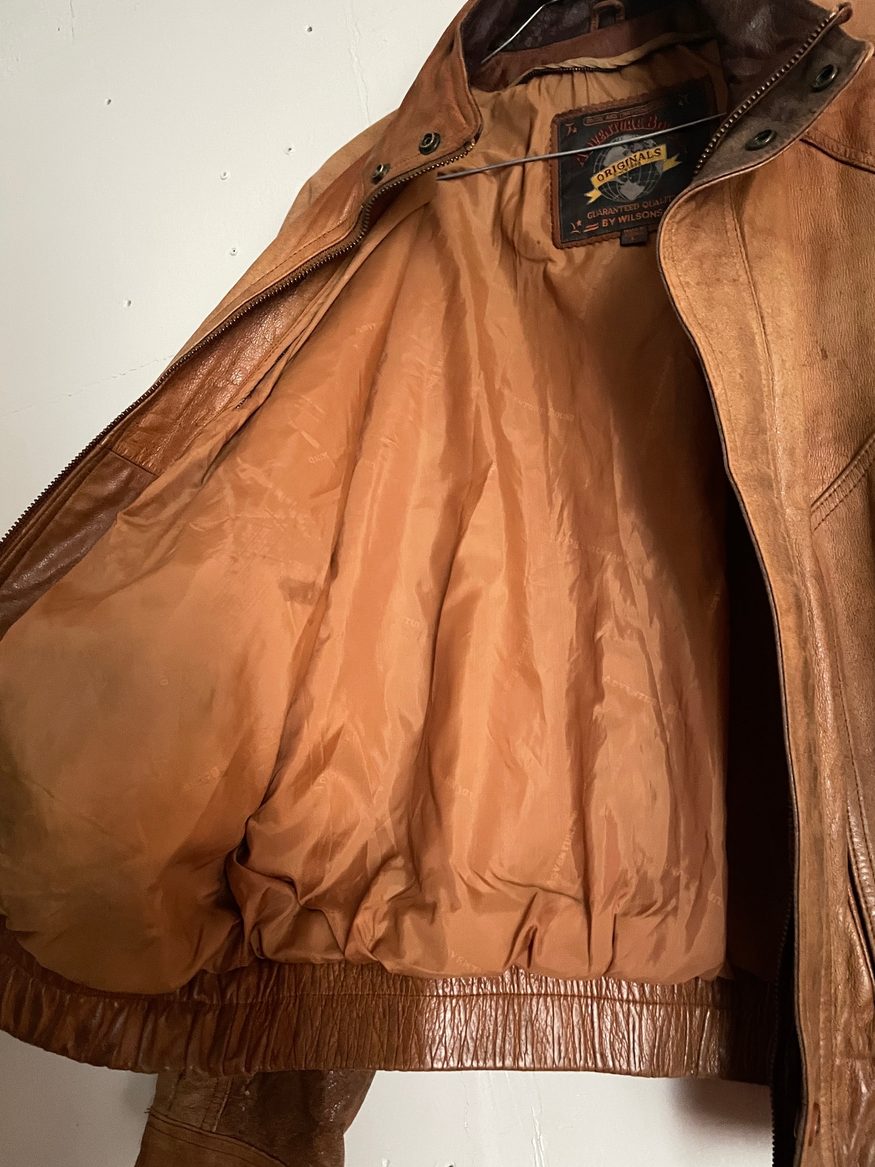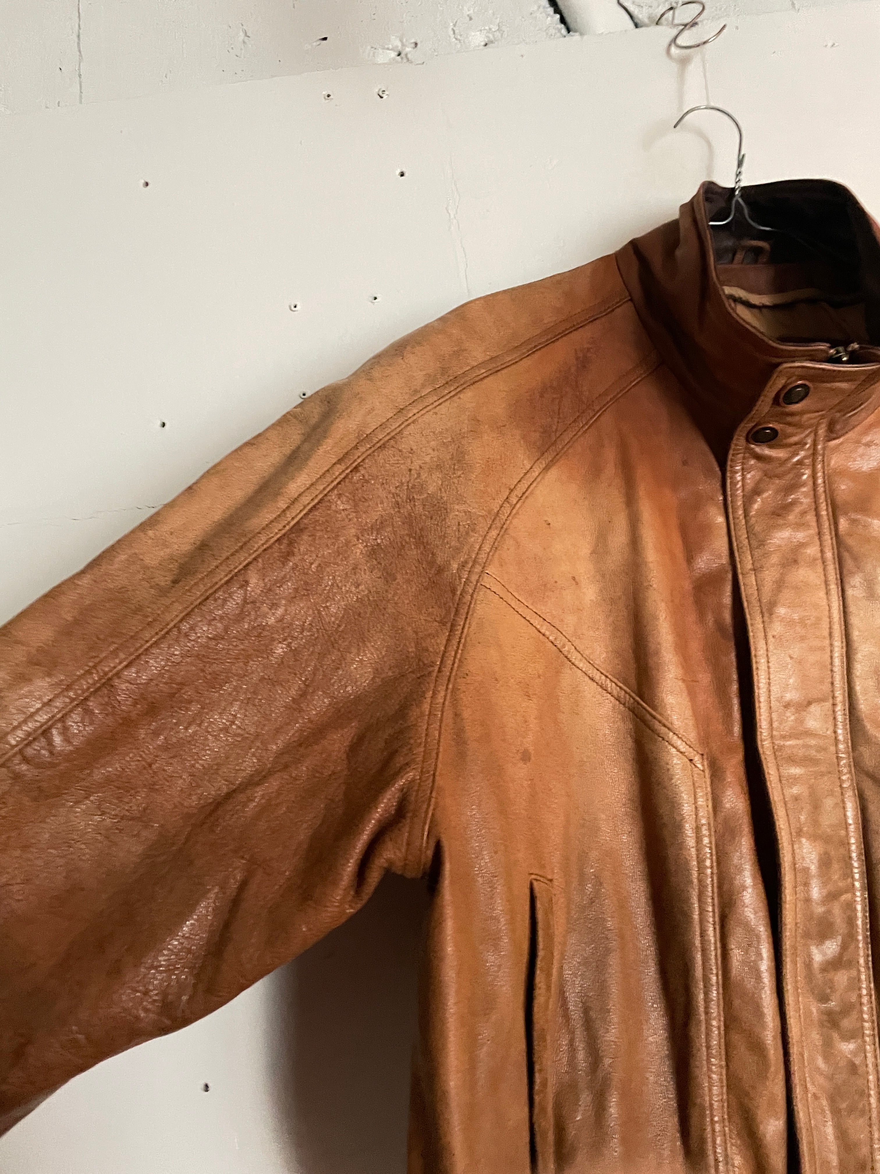 良い具合に褪せたブラウンが雰囲気抜群の、レザージャケット。元々味のあるグッドな色味です。ハイネックで、全体的に切り替えが施された、文句無しでかっこいいディテール。襟を折って、裏地のダークブラウンを見せて着用しても、また違った雰囲気で着られそうです。程良い丈感に、たっぷりな身幅が今っぽいシルエットです。これからの季節一着は持っておきたいアイテムかと思います。