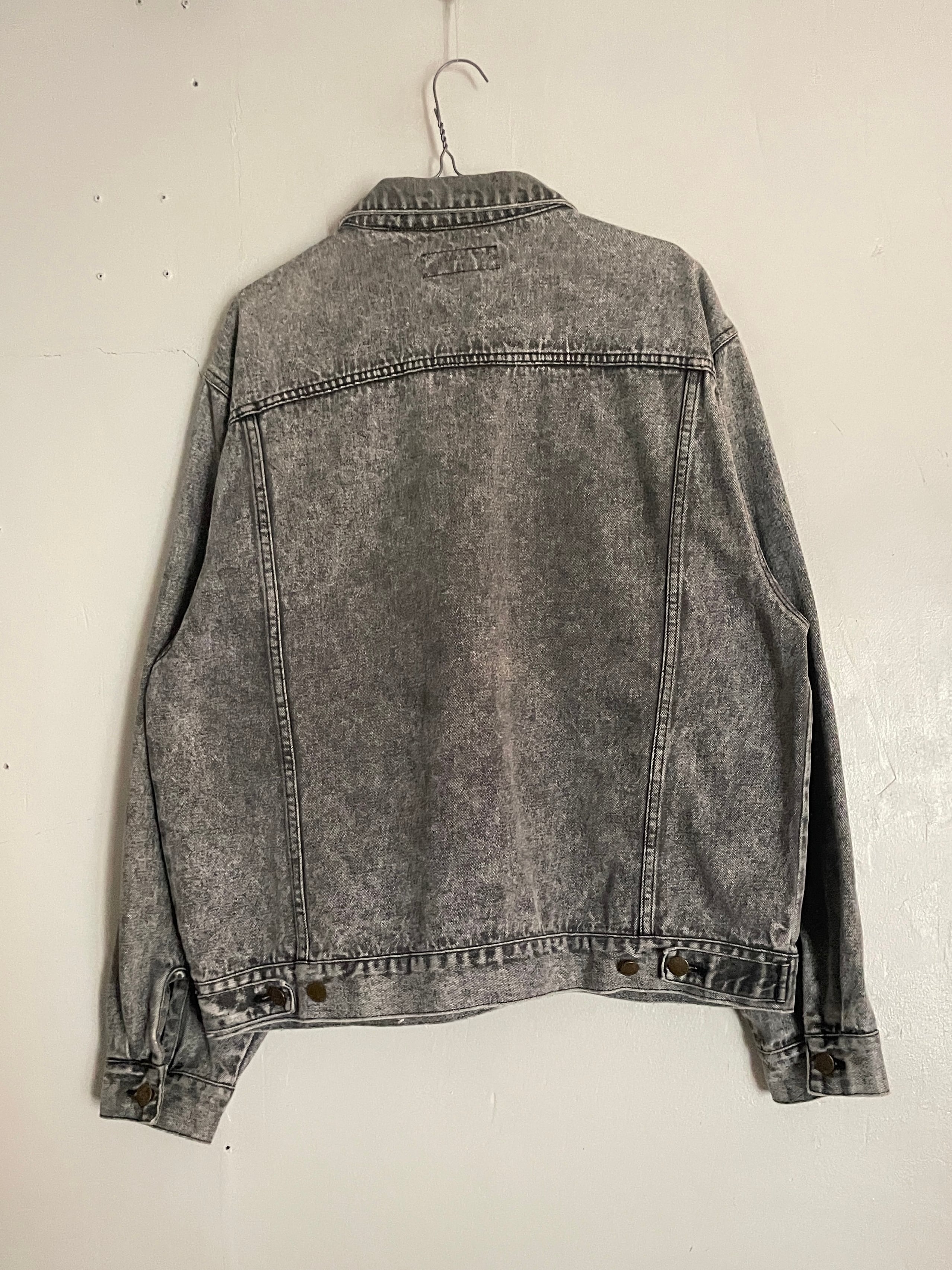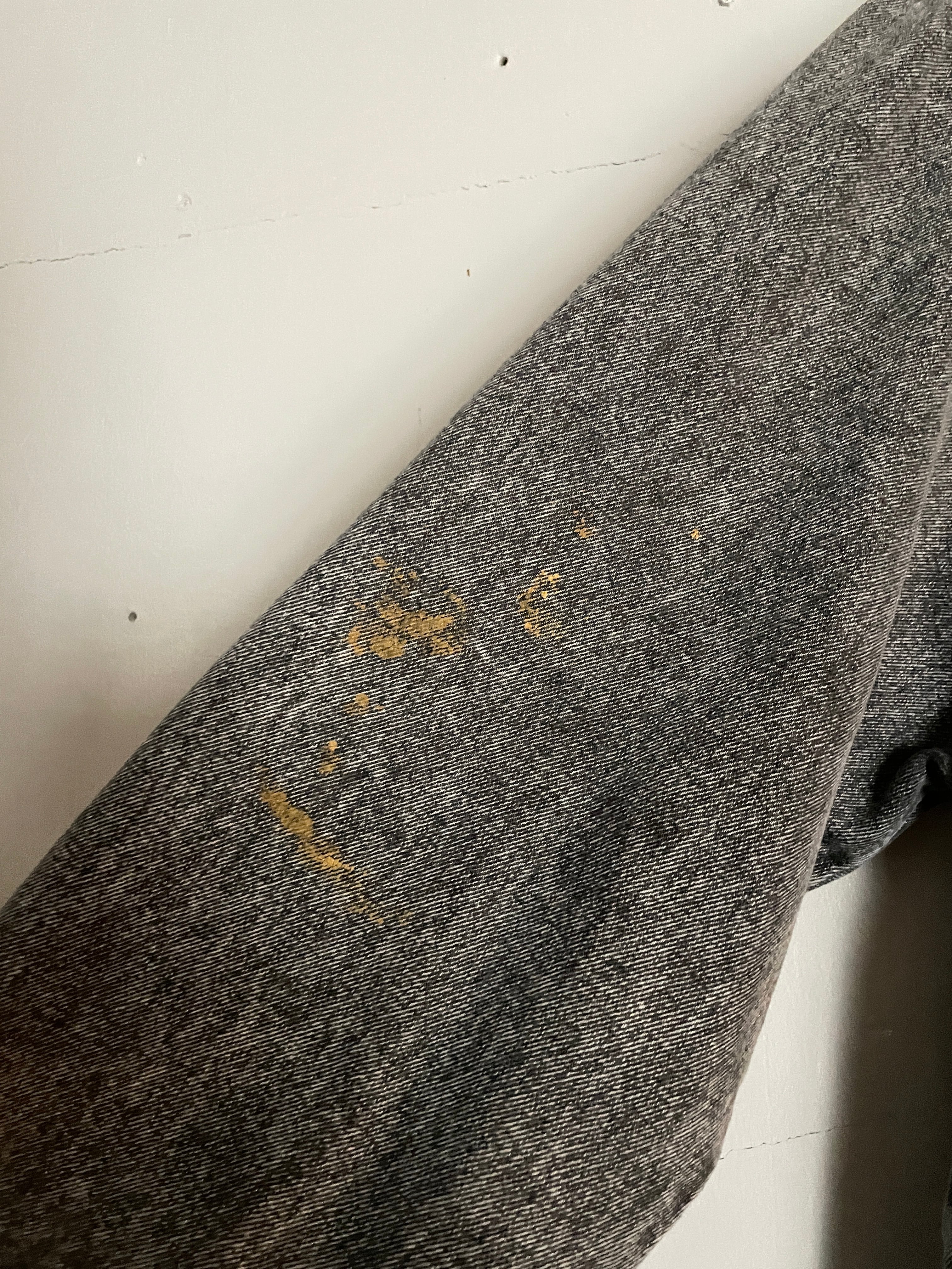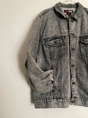 ケミカルウォッシュ加工が施された事によって、グレーがかった、ブラックデニムジャケット。燻んだ色味がが文句無しでかっこいいです。両袖にはペイント跡のようなものが見られますが、それも込みでグッドデザインです。程良い丈感に、たっぷりめな身幅が今っぽいシルエットを演出してくれています。今の時期に羽織るのにはもってこいの一着かと思います。