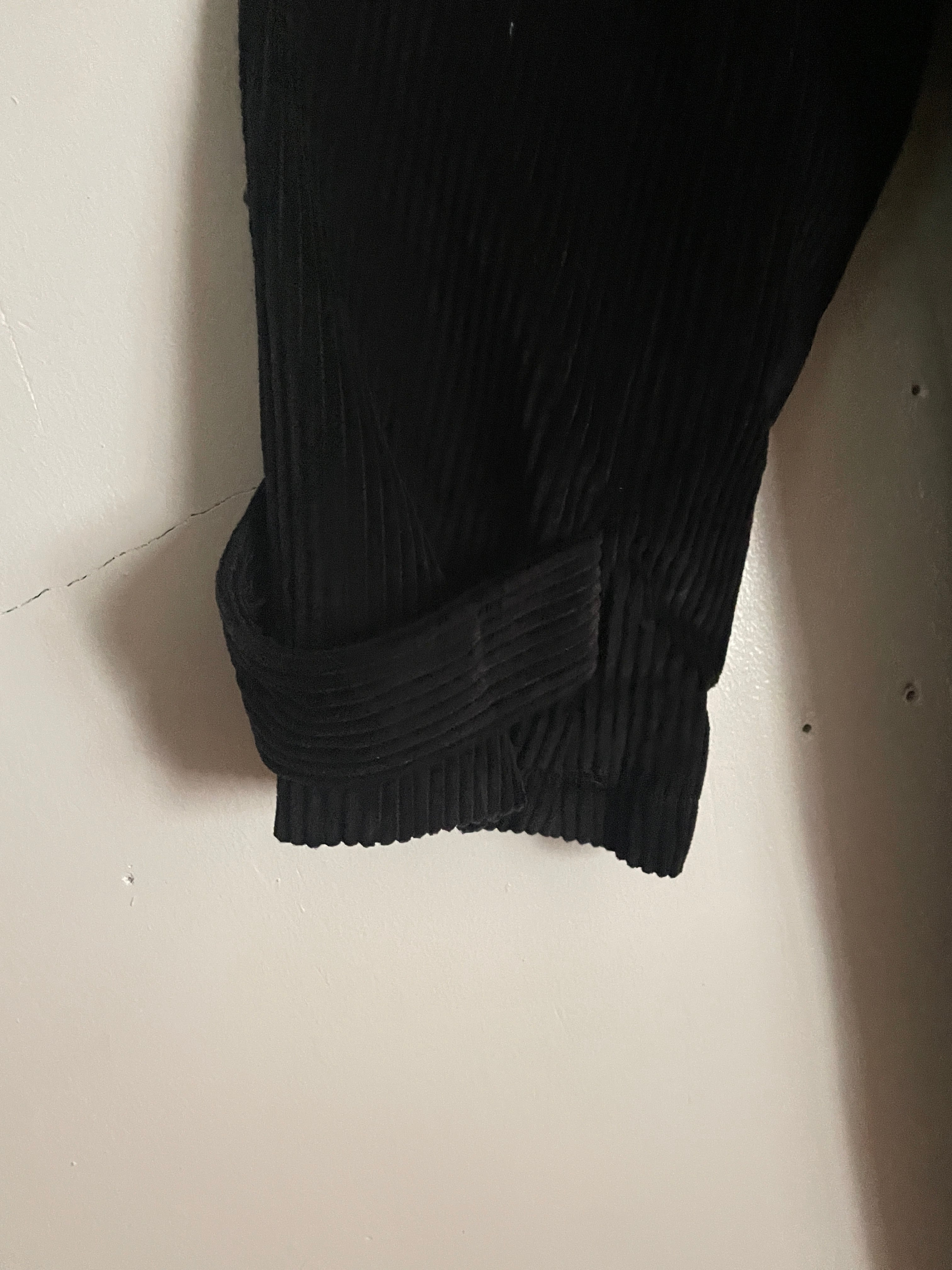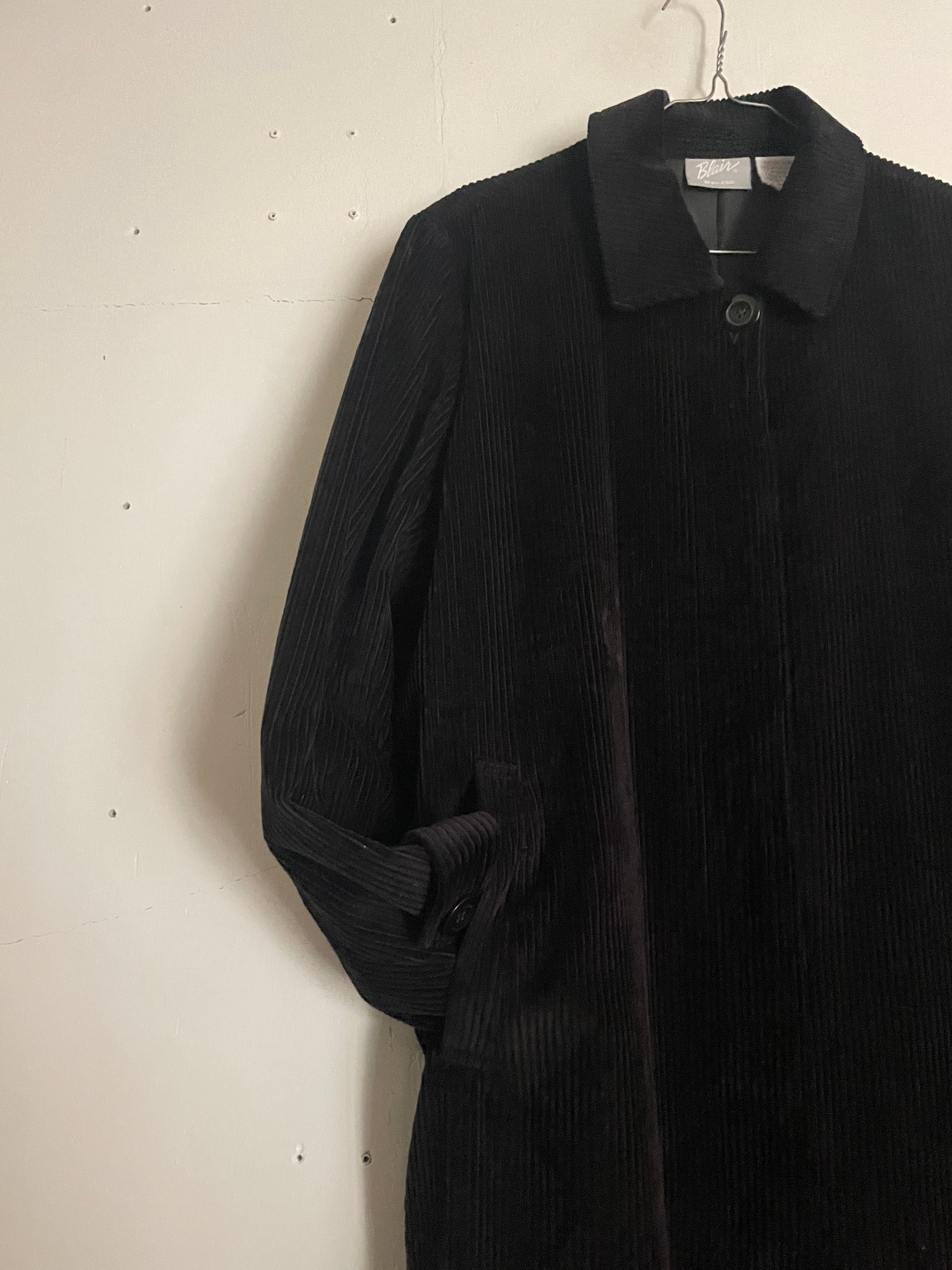 色っぽいブラックボディで、縦長な綺麗なシルエットが魅力的な、コーデュロイロングコート。綺麗めな雰囲気もあれば、カジュアルな雰囲気も感じられる一着。シングルボタンなのもお洒落です。バックにはボタン付きのストラップ付き、なんだかシュールです。上品で高級感溢れる魅力の詰まったコートかと思います。これからの季節にはファッションのメインアイテムとして活躍してくれる事間違いなしです。