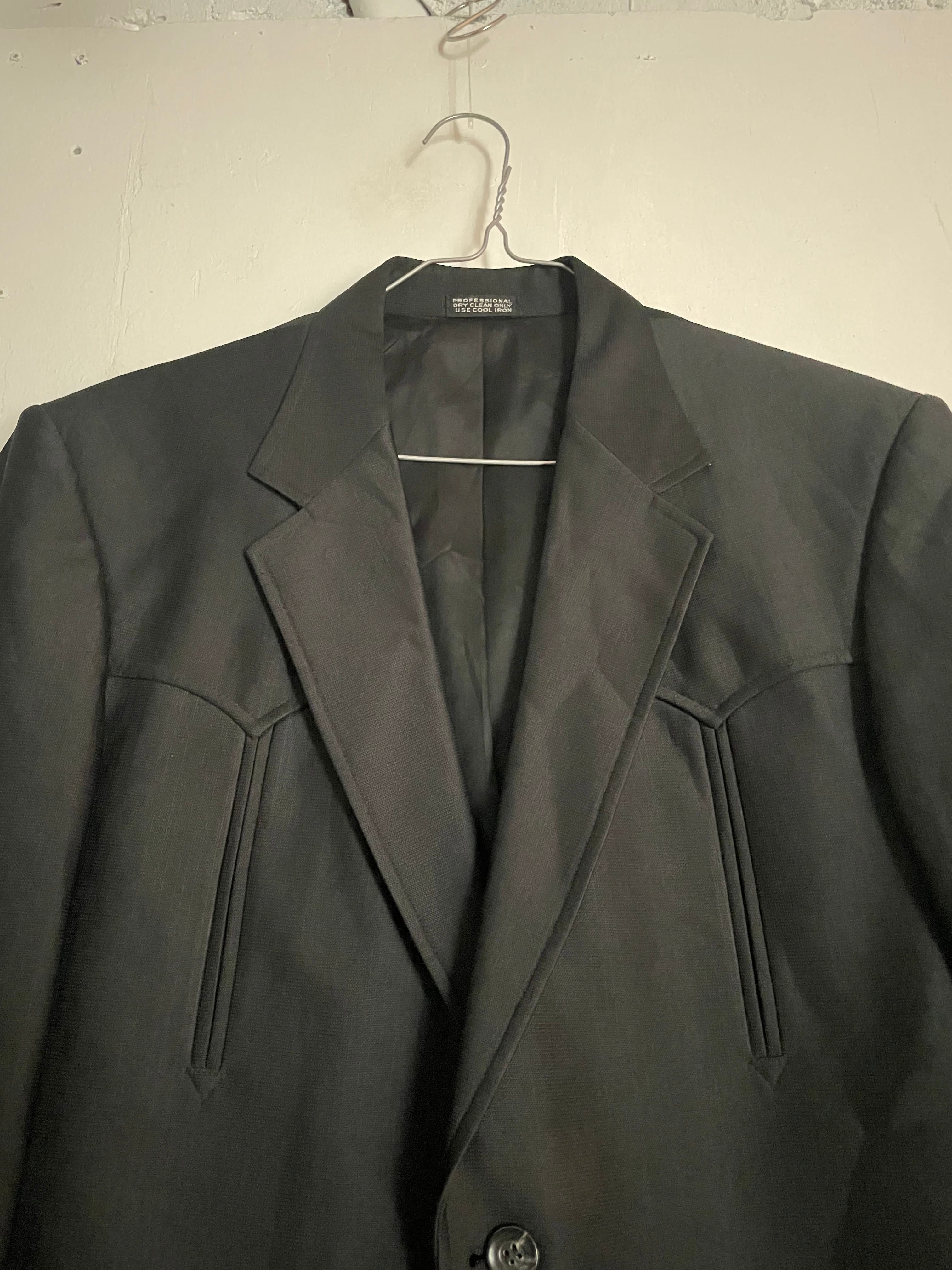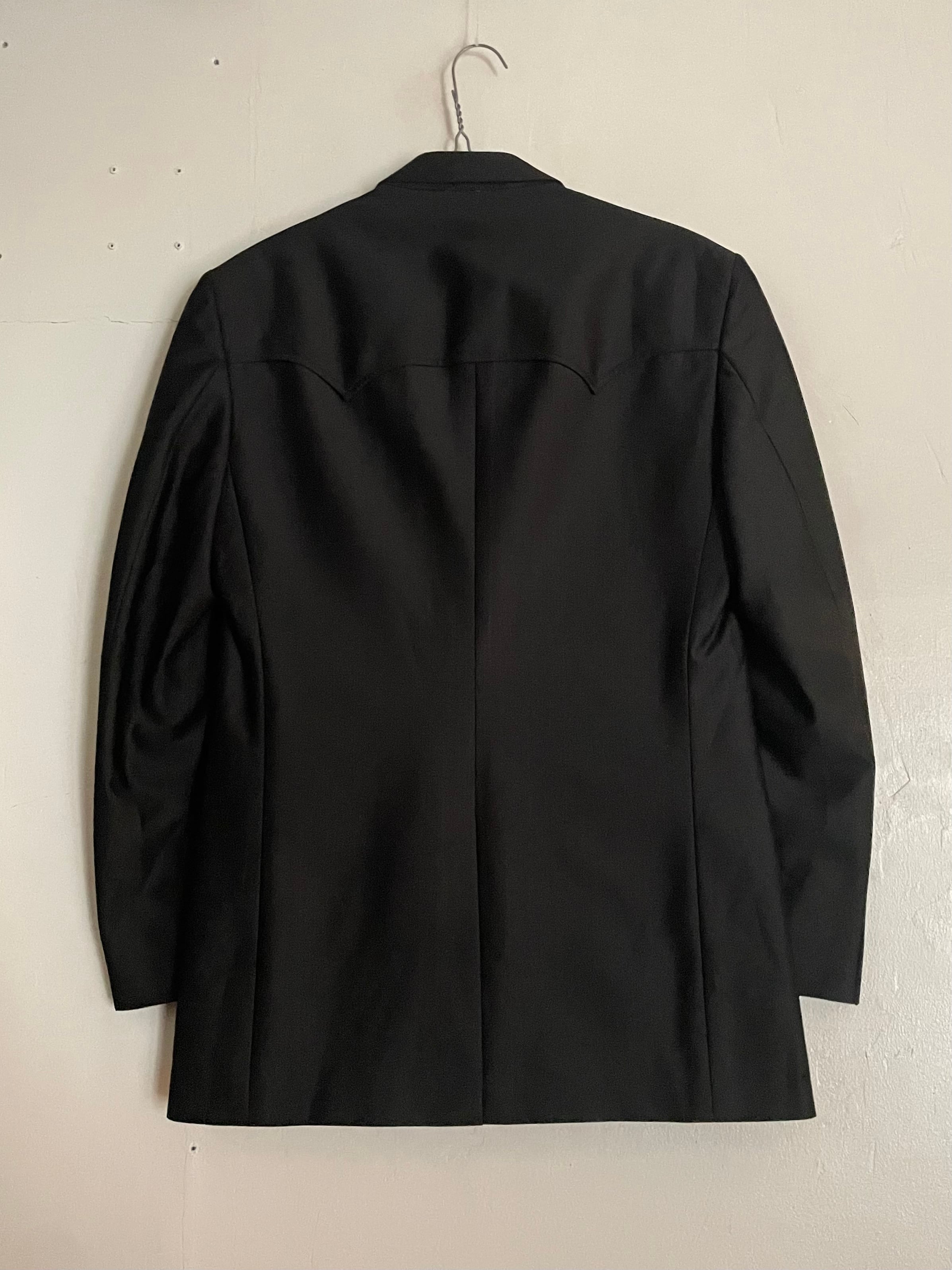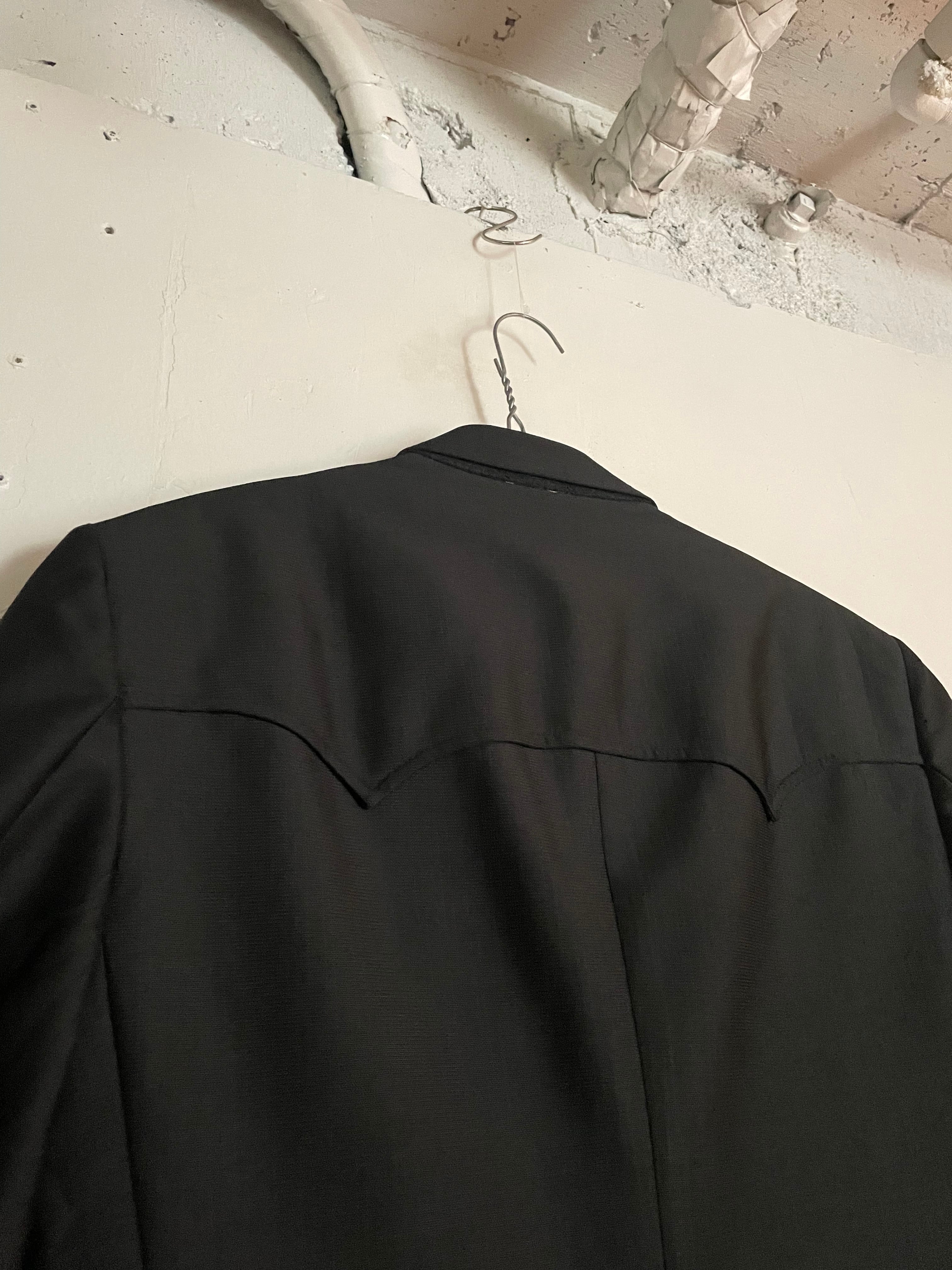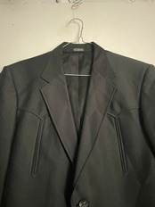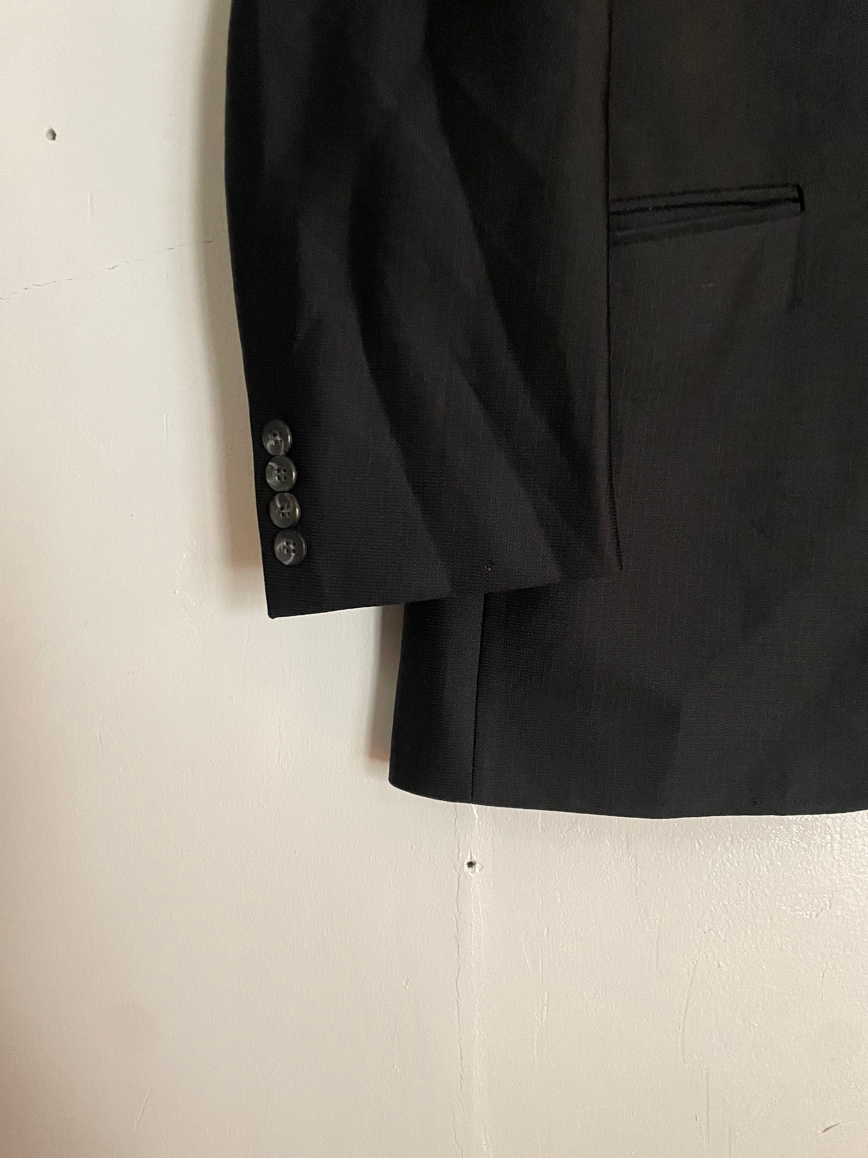 上品な光沢を抑えたマットな質感が特徴のブラックジャケット。シルエットはややゆったりとしたストレートラインで、肩のラインがしっかりしているためフォーマルな印象を演出してくれます。胸元の切り替えデザインがアクセントになっており、シンプルながらも洗練された雰囲気。2ボタン仕様で、オン・オフ問わず幅広く活躍します。ジーンズやスラックスにも合わせやすい一着です。
