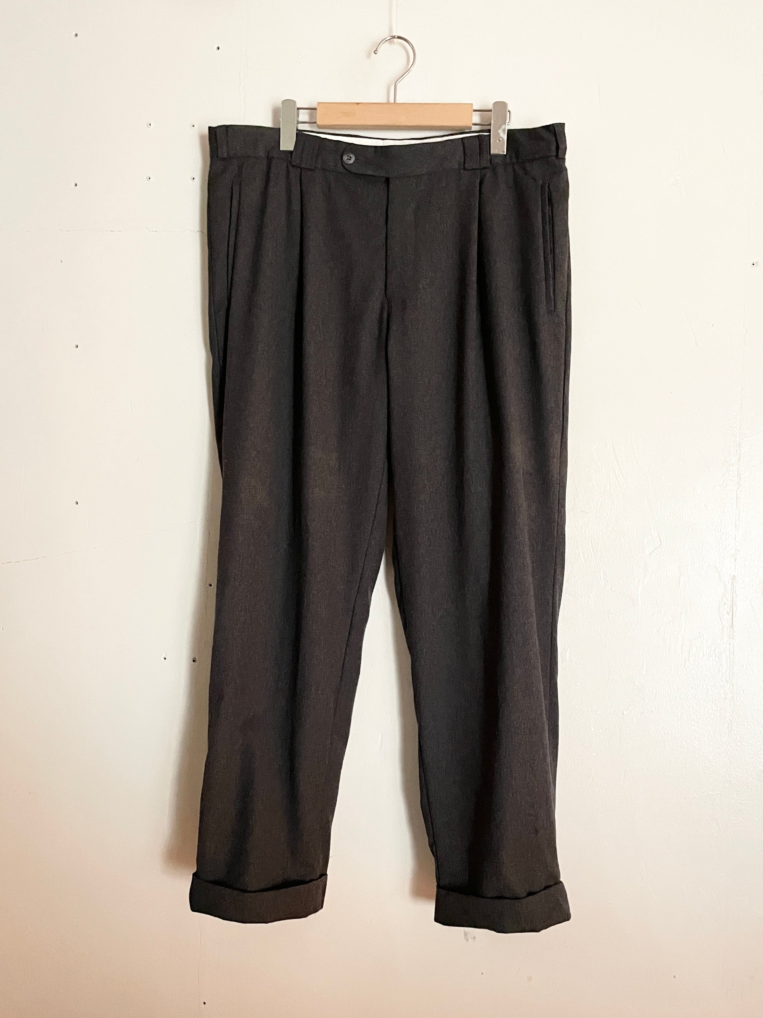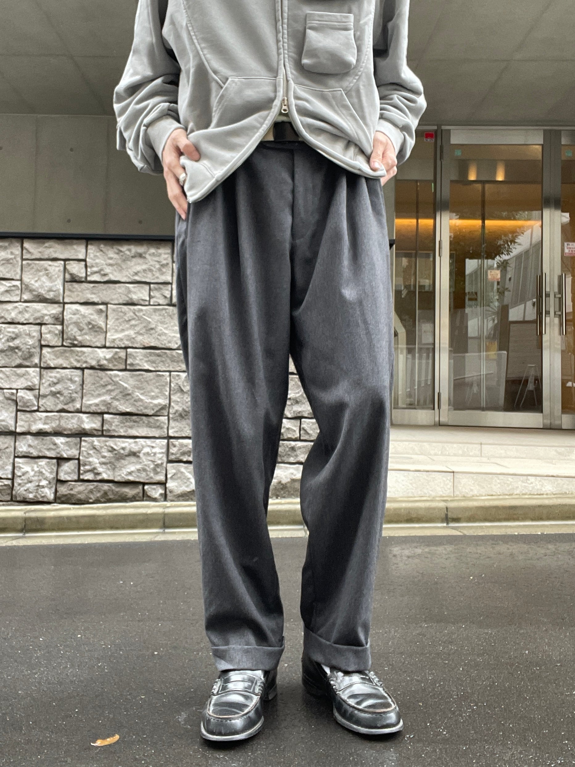 渋さのあるダークグレーカラーのスラックス。2タック入った綺麗なワイドシルエットが魅力的です。質の良いウール素材なので、寒くなってきた今の時期にはぴったりのスラックスかと思います。上品さもありつつ、カジュアルなファッションにも落とし込める万能な一本です。カナダ製でOPTIジップなのもポイントが高いです。