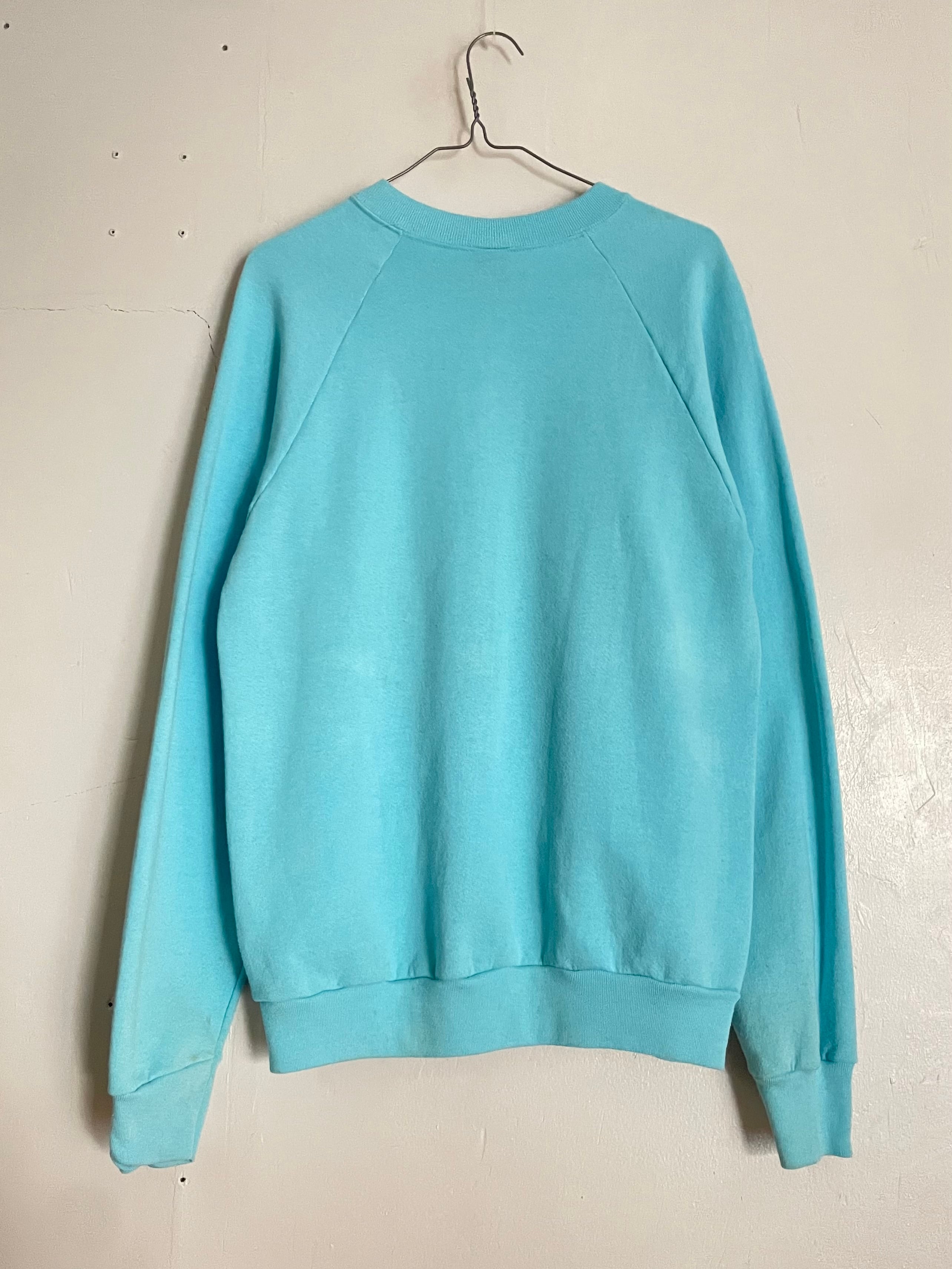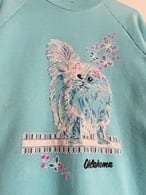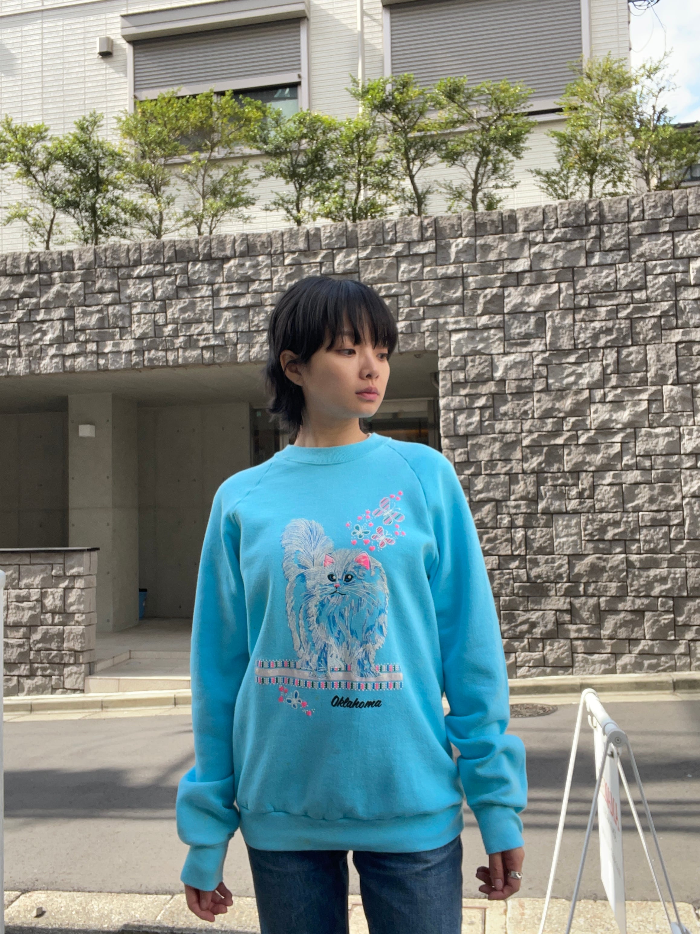 淡い水色が目を惹く、レトロなデザインのスウェット。フロントにはふわふわの長毛猫と蝶々のプリントが施されており、柔らかくガーリーな雰囲気。「Oklahoma」の刺繍ロゴ入りで、ヴィンテージらしい遊び心のある一枚です。ゆったりめのシルエットで、デニムやスカートとの相性も抜群です。
