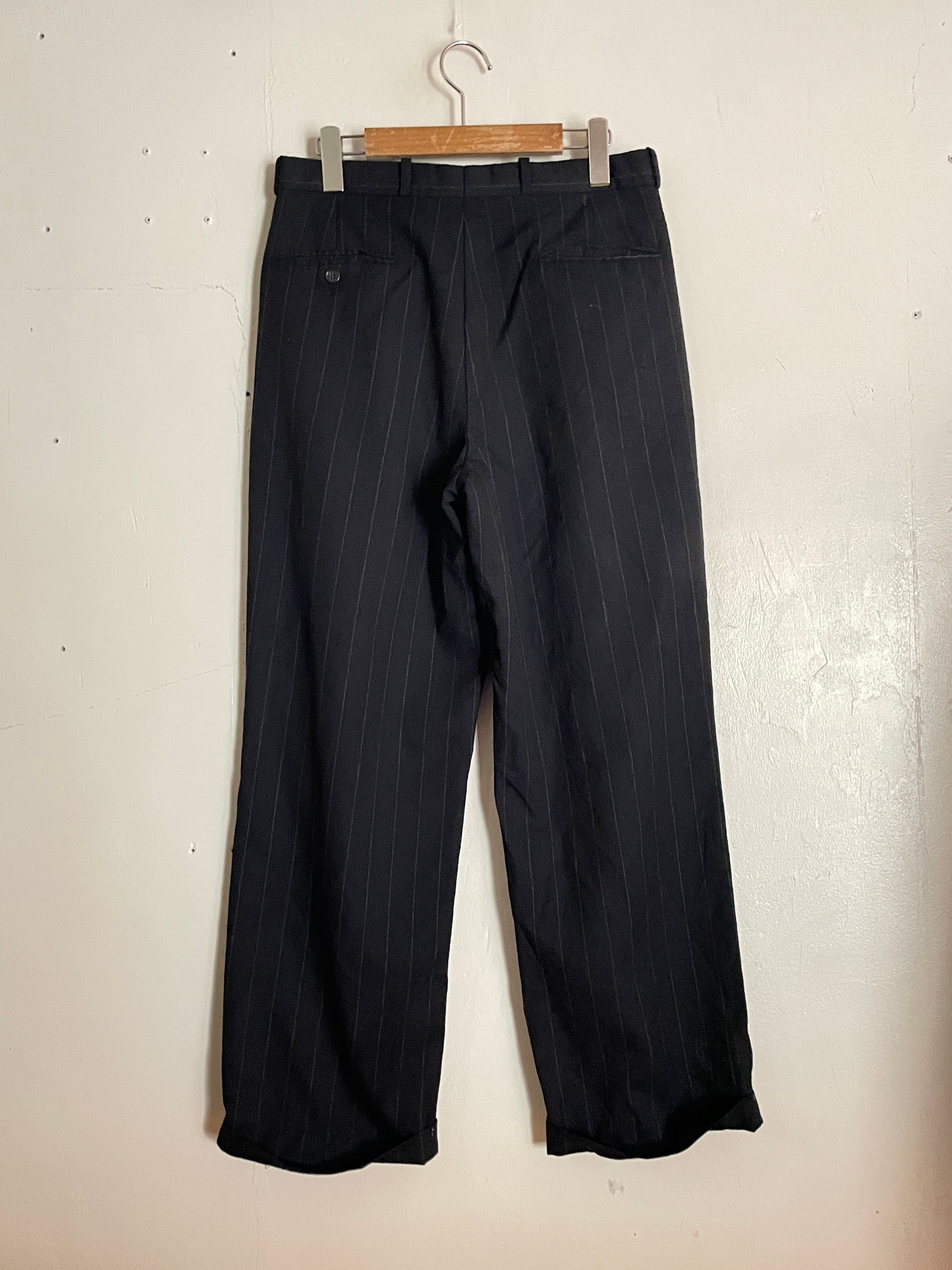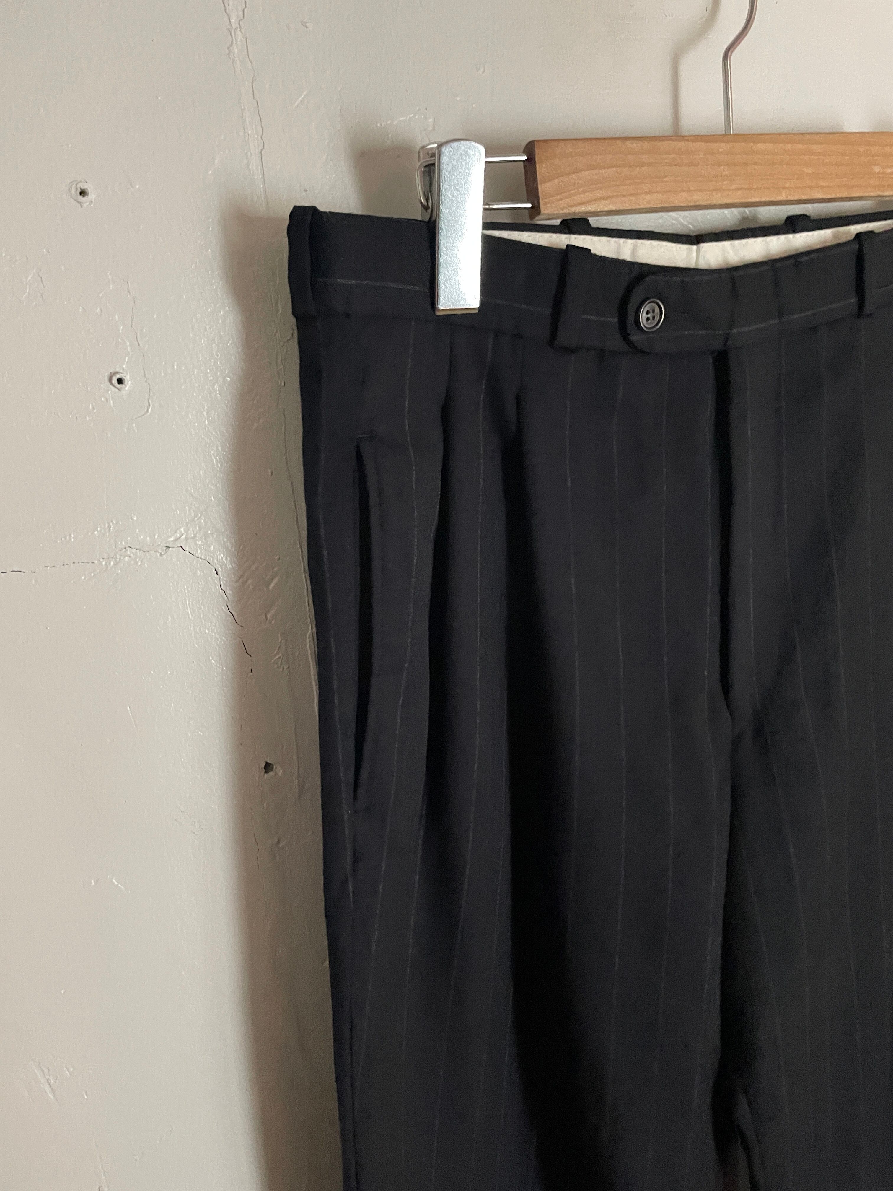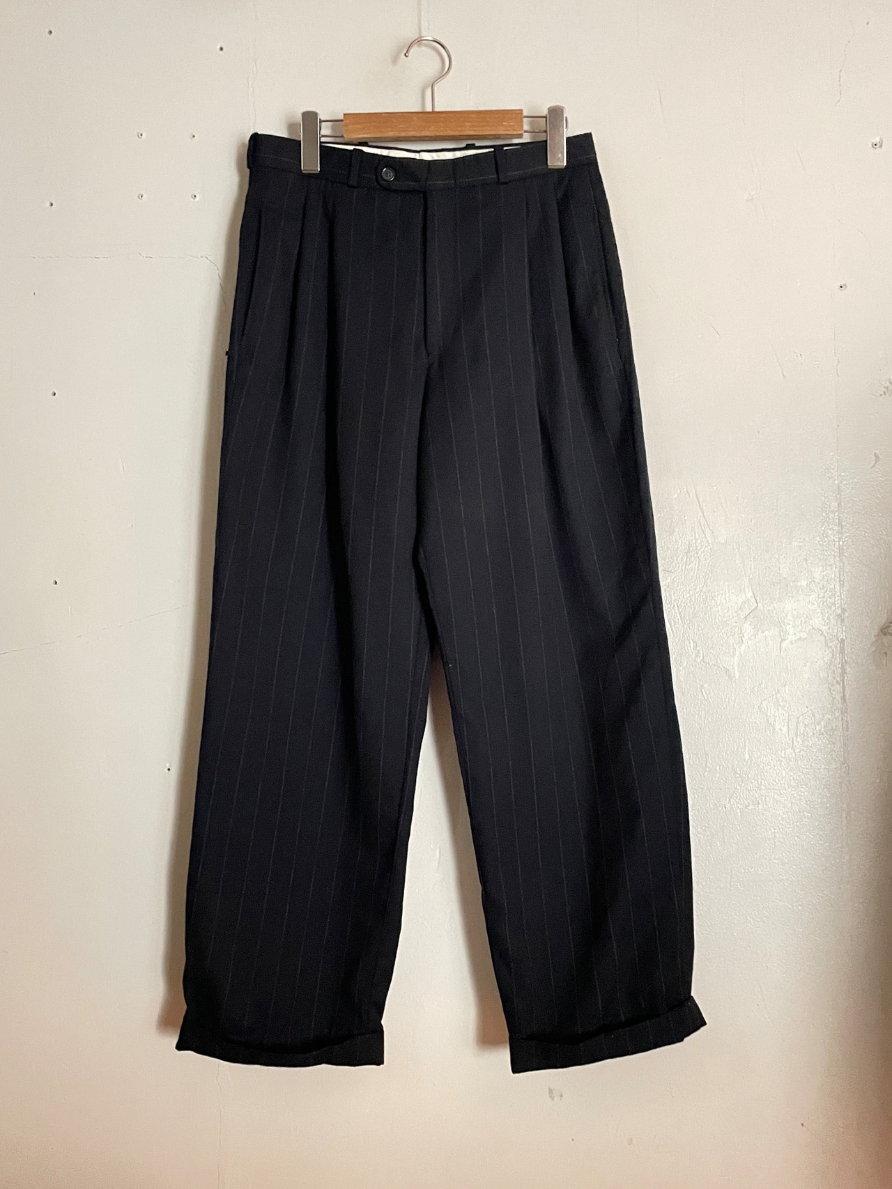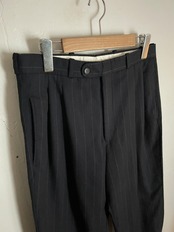 ブラックに、うっすらとストライプデザインが施された、スラックス。2タック入りで、太さのあるワイドシルエット。一番使いやすいタイプのスラックスかと思います。綺麗めなど、アメカジなど、様々なジャンルのファッションに取り入れやすい一本かと思います。