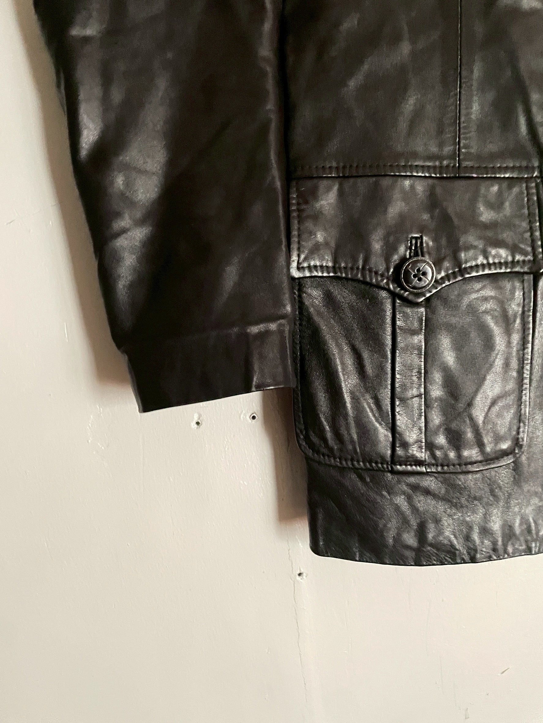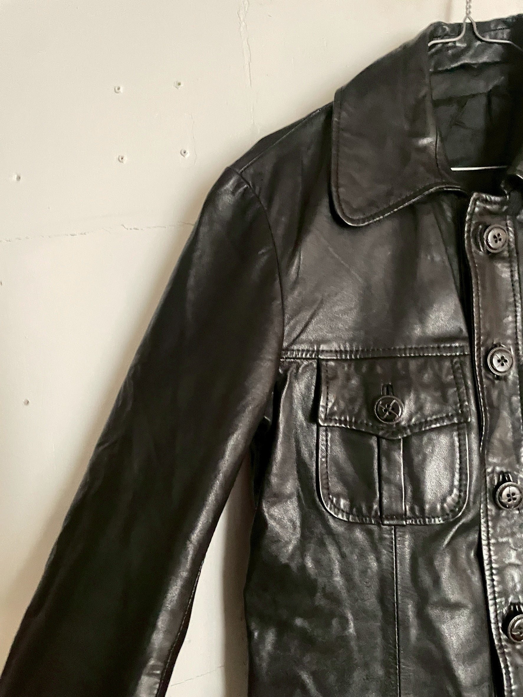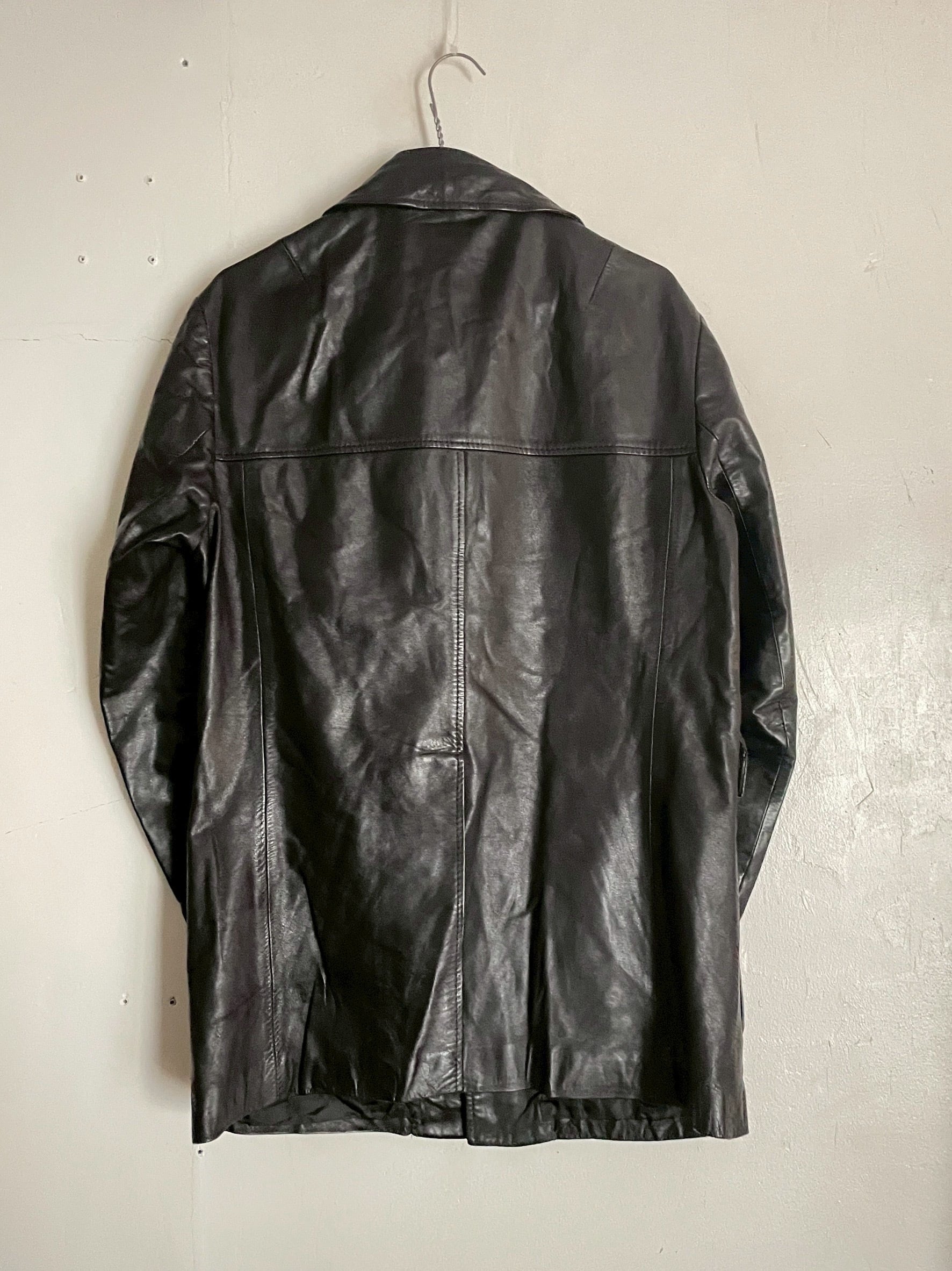 上質なレザーを使用した、クラシックな雰囲気が漂うブラックレザージャケット。光沢を抑えた深みのあるブラックカラーで、着るほどに味わいが増していく一着です。大きめの襟、長めの丈感、フラップポケットが特徴的で、ミリタリーやワークテイストにも合わせやすいデザインかと思います。デニムやブーツと合わせれば、無骨でスタイリッシュな印象に仕上がります。