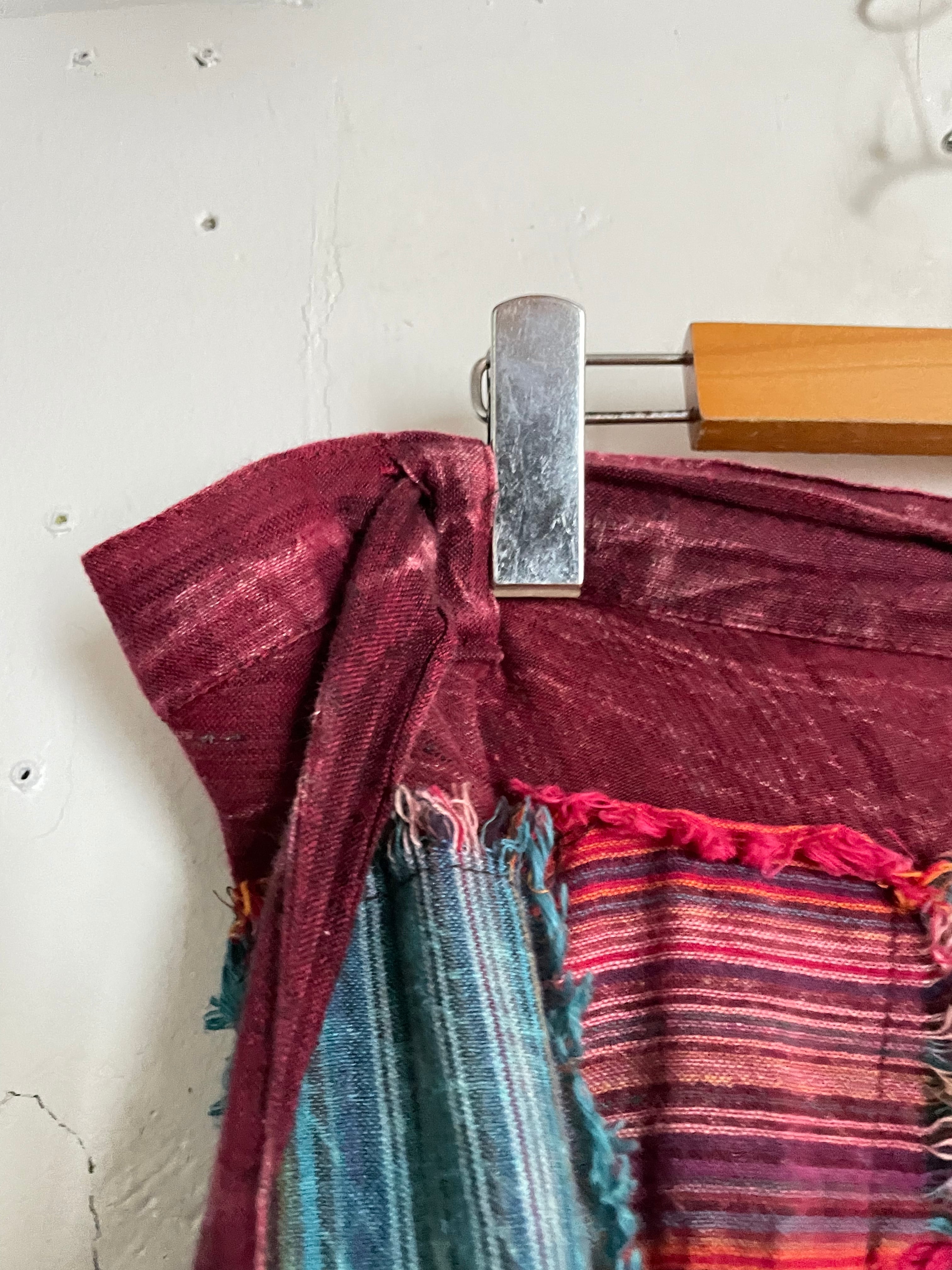 深みのあるワインレッドの生地に、カラフルなストライプ生地のパッチを施したラップスカート。ブルー・レッド・オレンジなどのパッチが全体にちりばめられ、一点一点異なる風合いを楽しめます。ウエストは巻きスカートタイプで、サイズ調整が可能です。柔らかく軽いコットン素材で、季節を問わず着回ししやすい一枚です。ボヘミアン、エスニック、ナチュラル系のコーデにぴったりのアイテムです。