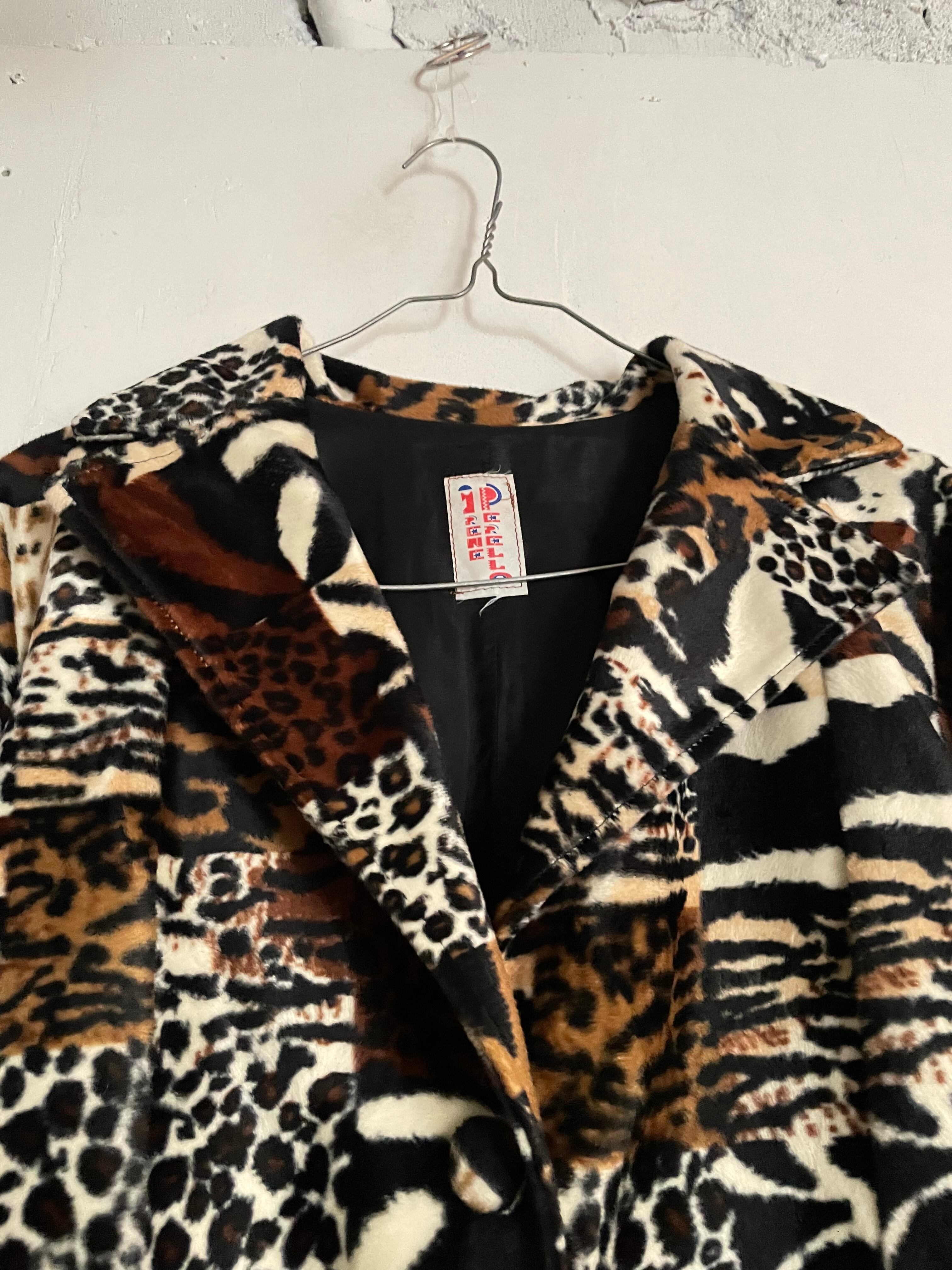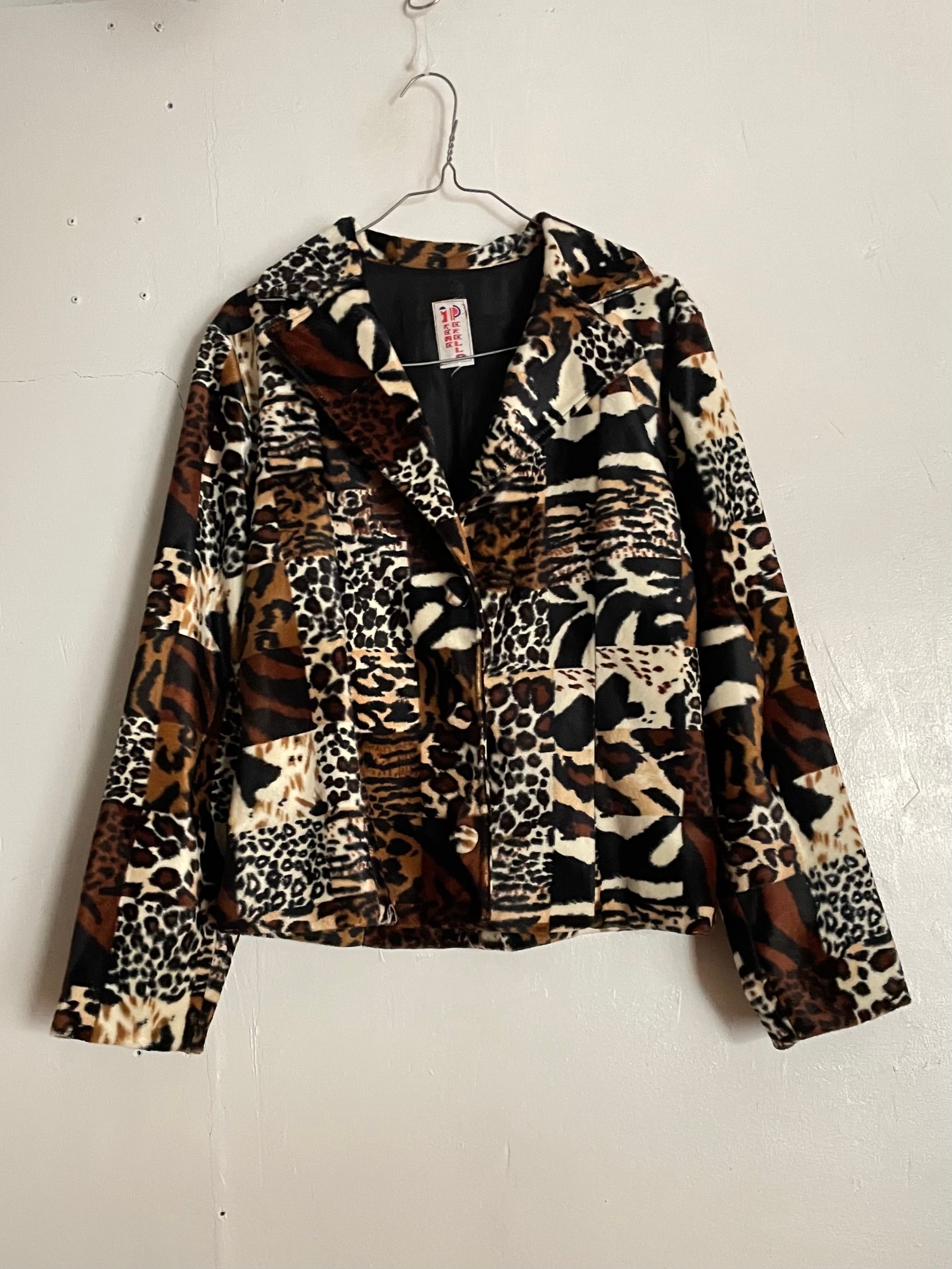 ゼブラ、タイガー、ヒョウなど複数のアニマル柄をミックスした、インパクト抜群のショートジャケット。程よい丈感でバランスが取りやすく、羽織るだけでコーデの主役になるアイテムです。襟付きのデザインが全体を引き締め、カジュアルにもモードにも着こなしやすい一着です。