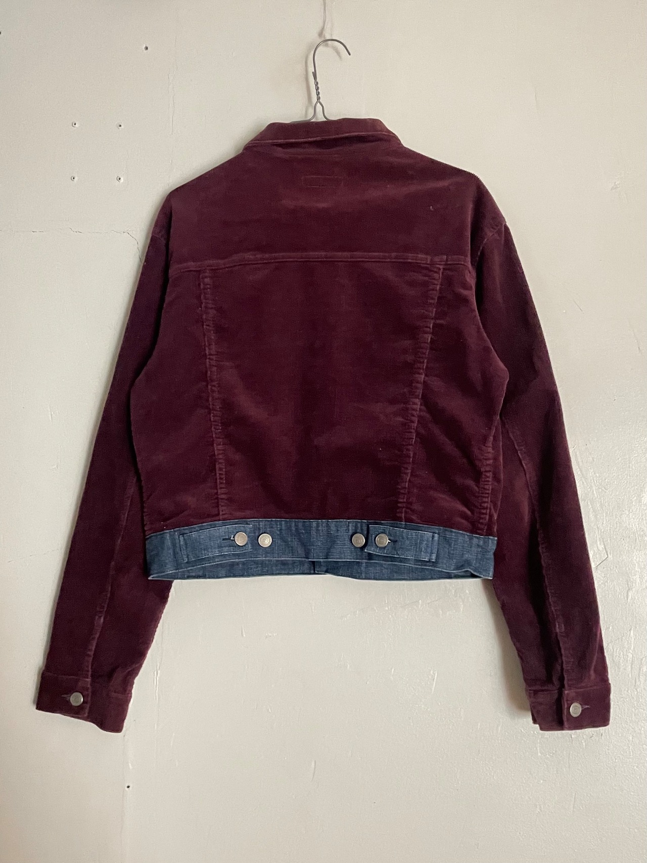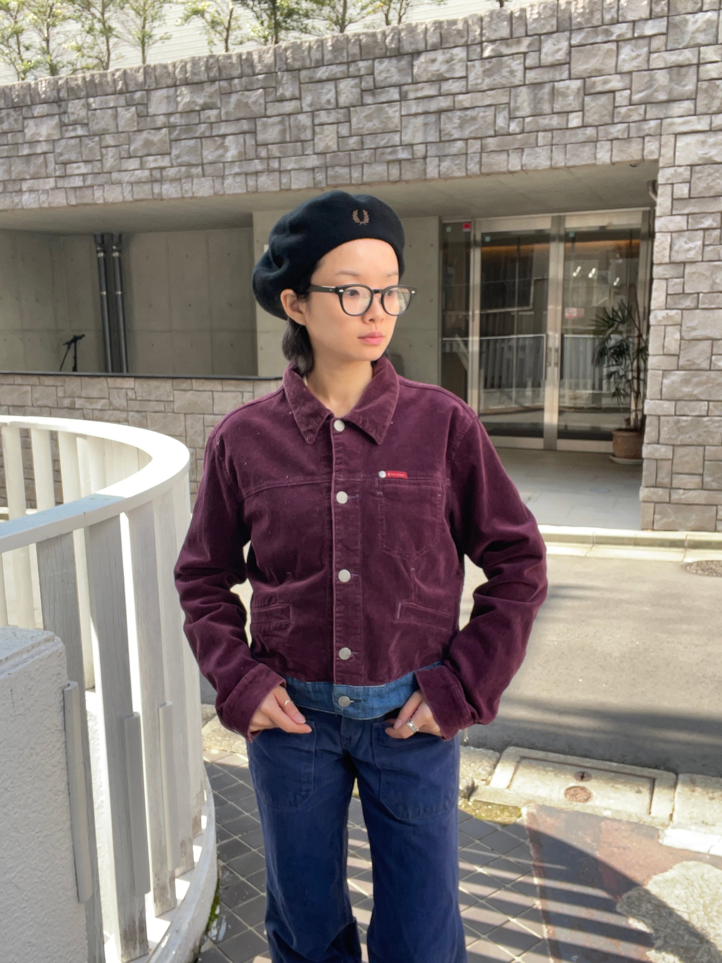 クラシックな雰囲気とストリート感を兼ね備えた、Lee Cooper のジャケット。深みのあるバーガンディーカラーのコーデュロイ素材に、裾のデニム切り替えデザインがアクセントになったアイテムです。コンパクトな丈感で、ハイウエストボトムやワンピースとの相性も良いです。