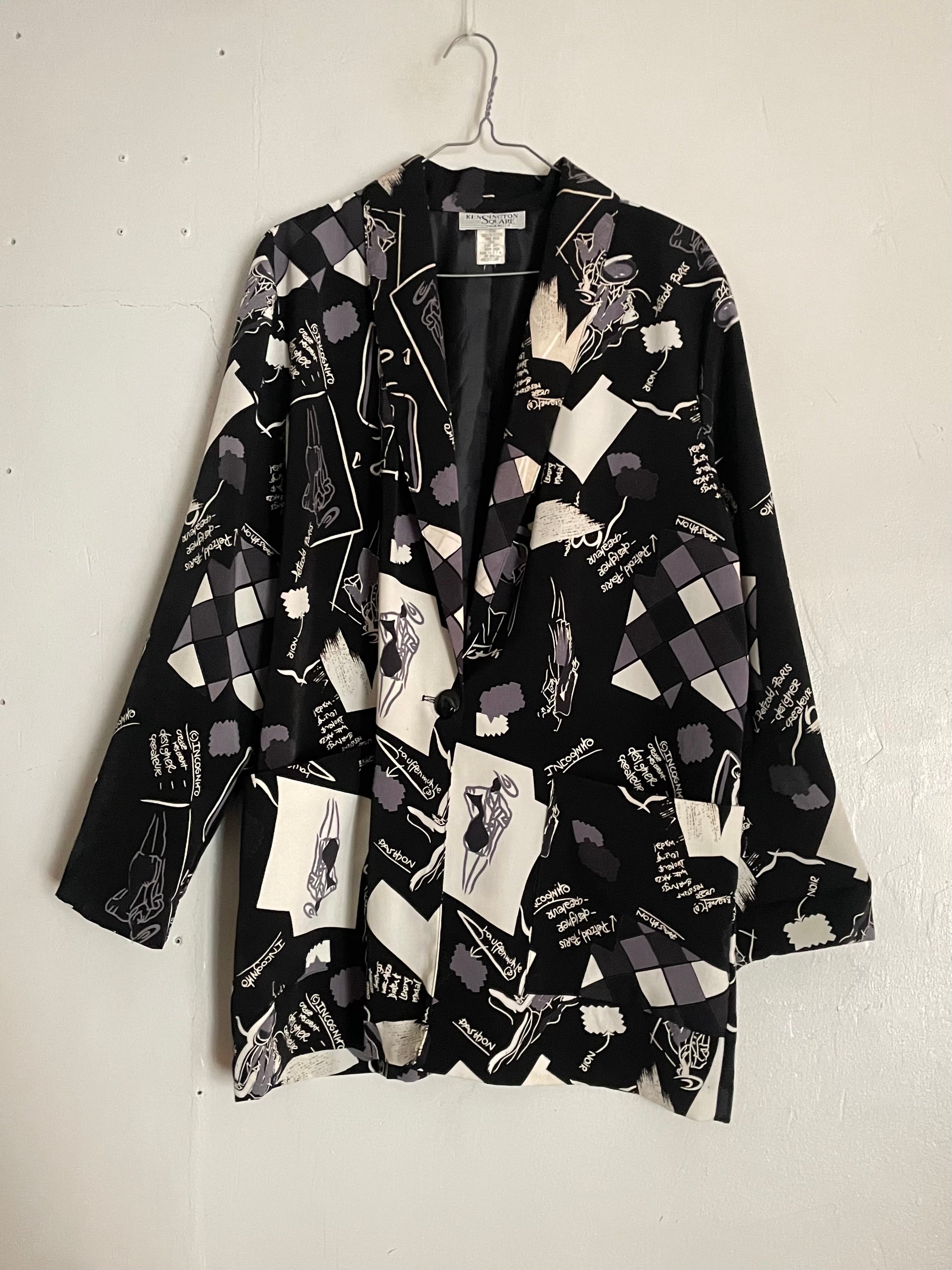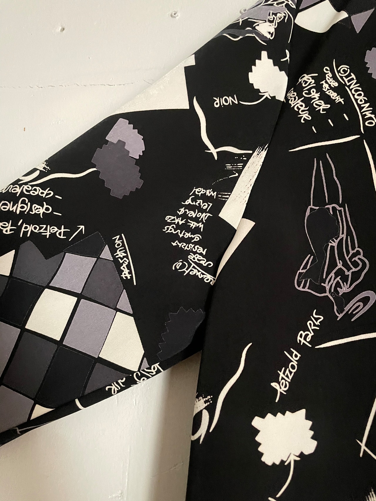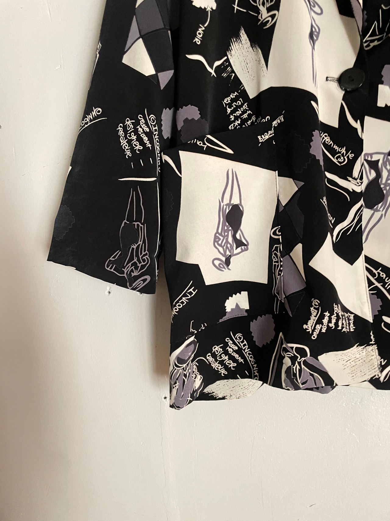 90年代ムード漂う、抽象的なプリントが施されたテーラードジャケット。ブラックをベースに、グレーやホワイトの幾何学模様・手書き風イラスト・英字プリントをミックスした独特なデザインです。肩に程よいボリュームがあり、ゆったりとしたシルエットでオーバーサイズスタイルにぴったりです。さらっとした軽い着心地で、ユニセックスで着用いただけるアイテムです。