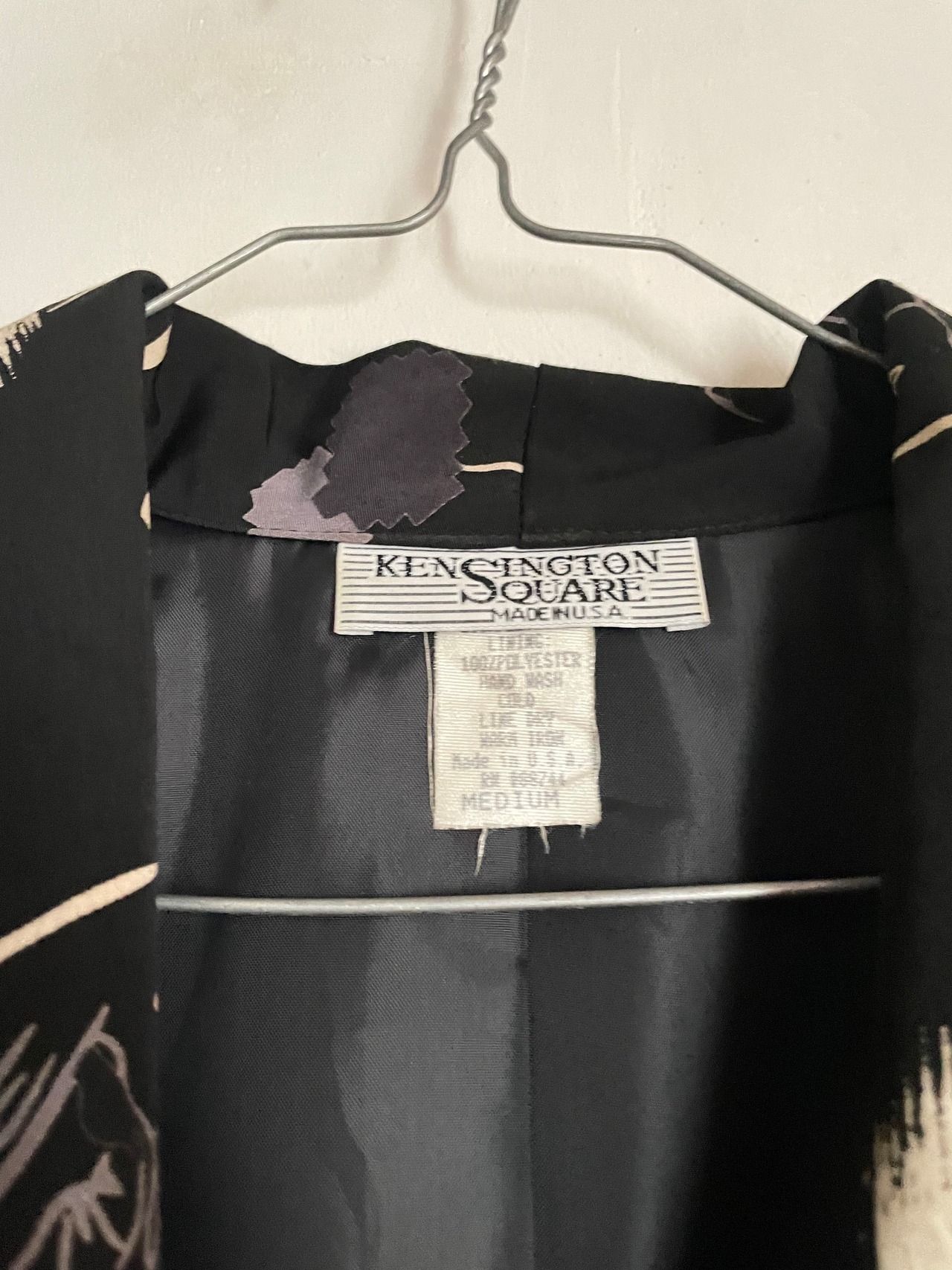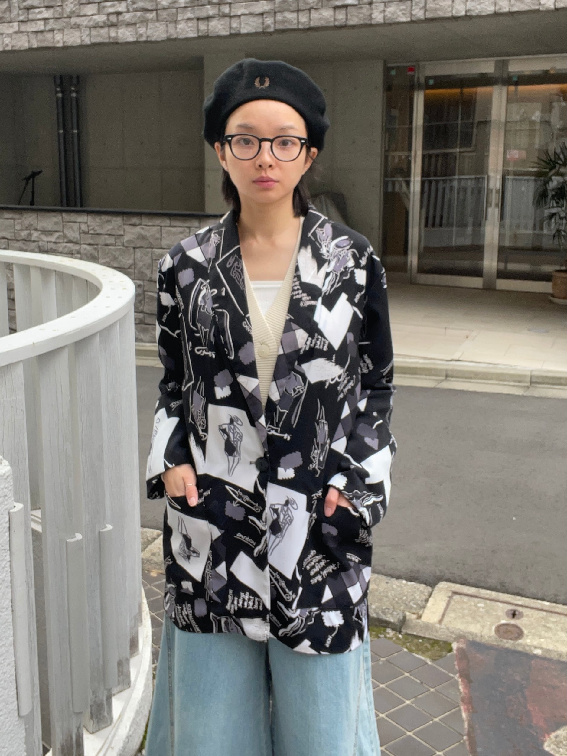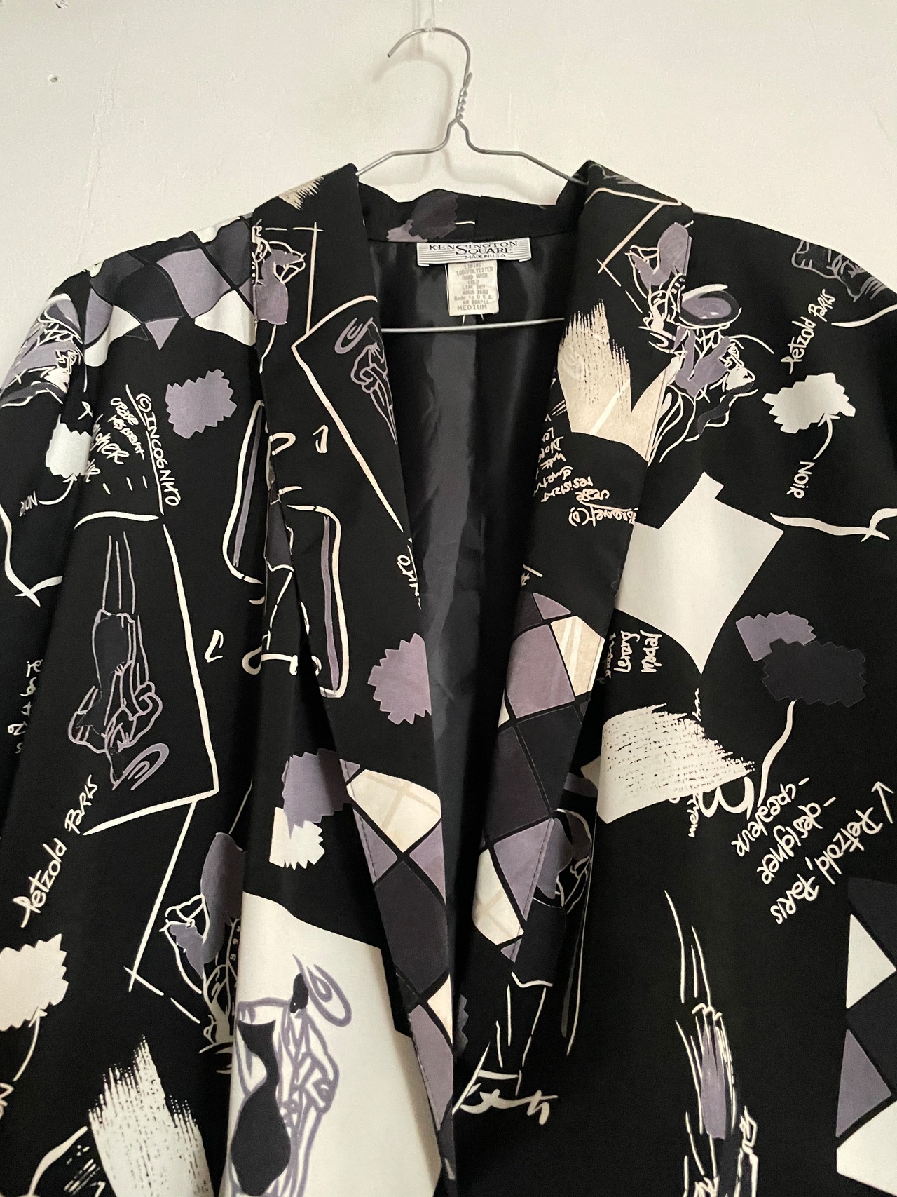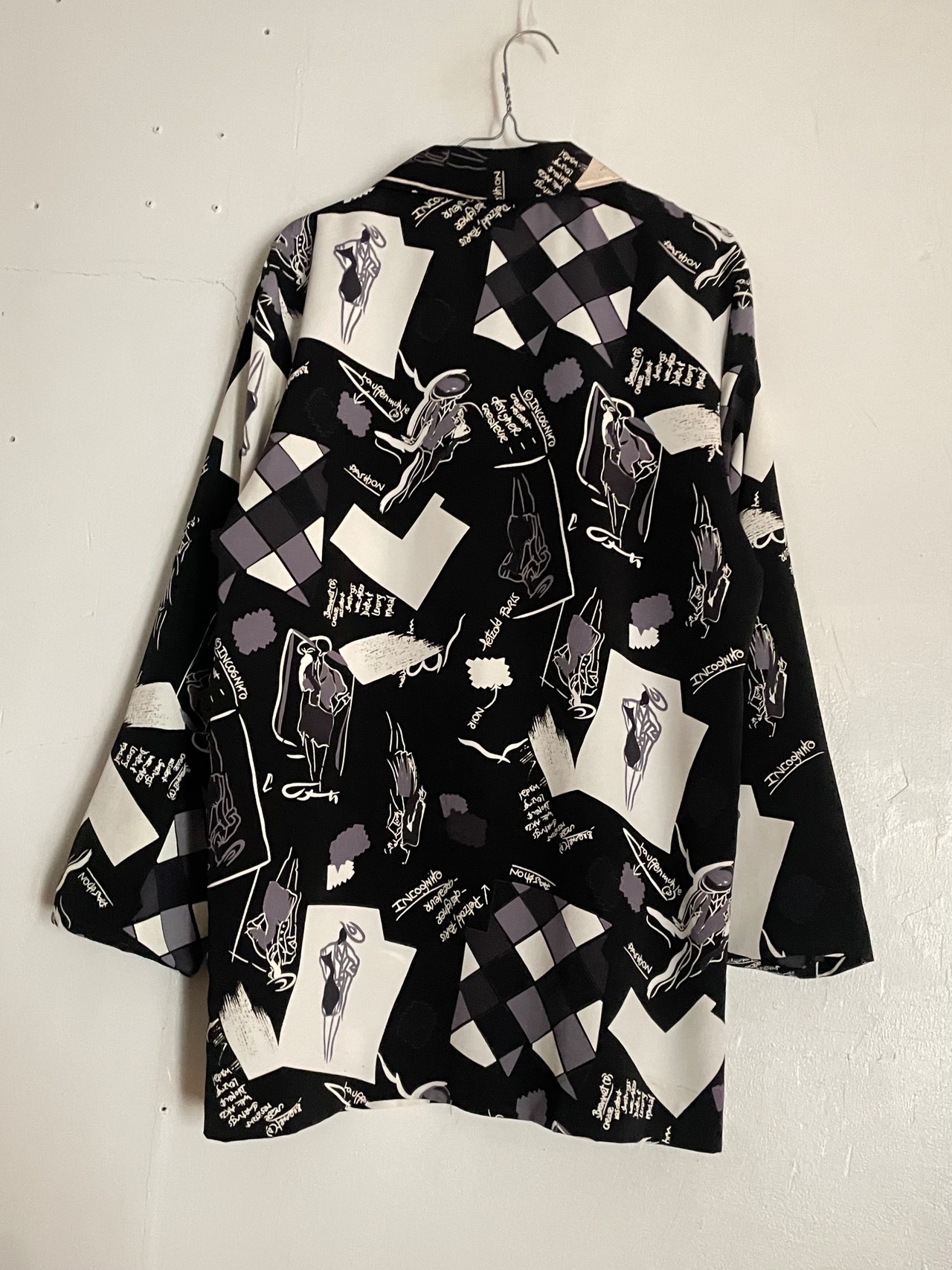 90年代ムード漂う、抽象的なプリントが施されたテーラードジャケット。ブラックをベースに、グレーやホワイトの幾何学模様・手書き風イラスト・英字プリントをミックスした独特なデザインです。肩に程よいボリュームがあり、ゆったりとしたシルエットでオーバーサイズスタイルにぴったりです。さらっとした軽い着心地で、ユニセックスで着用いただけるアイテムです。