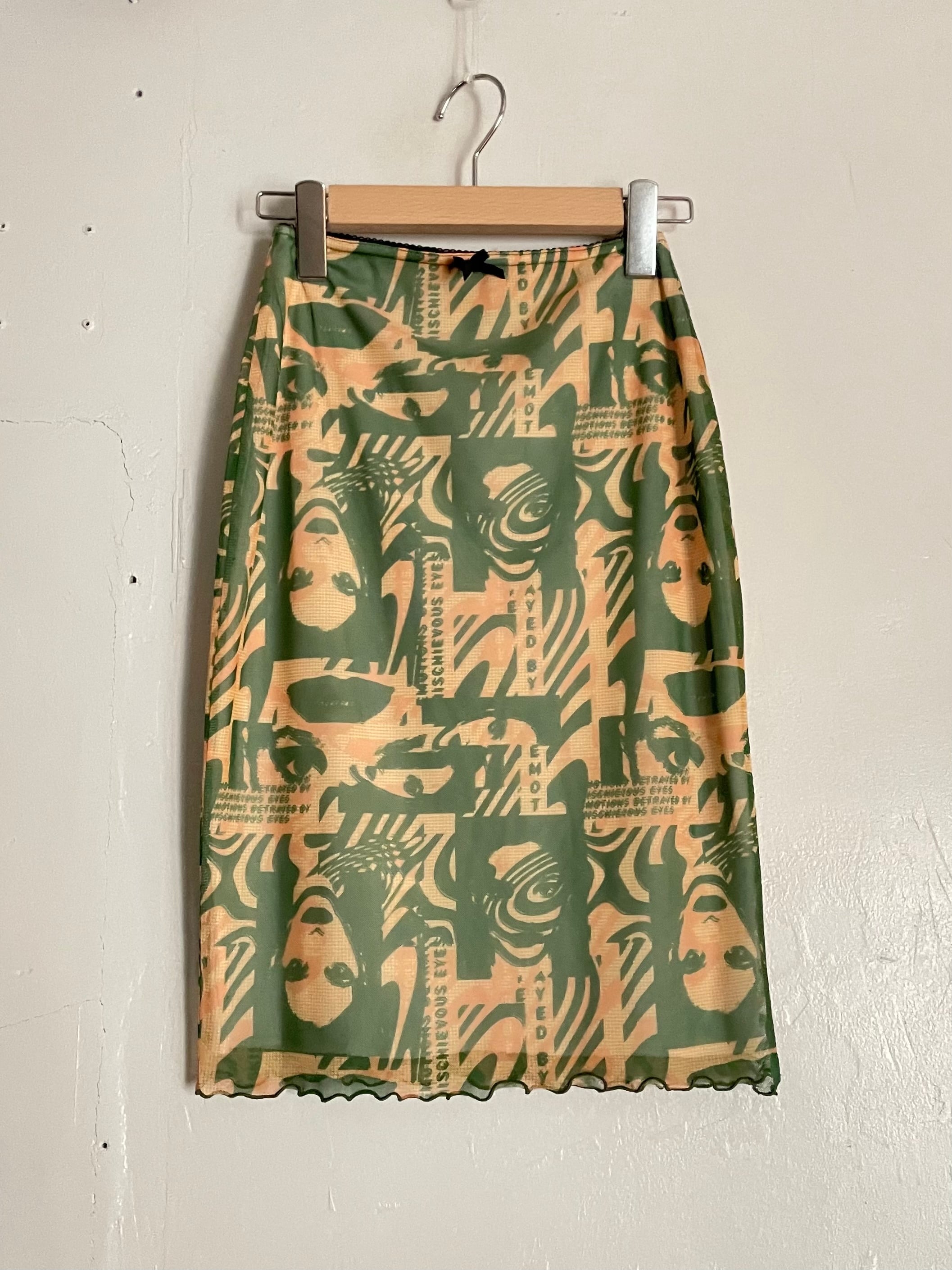 個性的なアートプリントが目を引く、シースルーメッシュ素材のスリムスカート。カーキグリーンとベージュをベースに、「EYE」「MISCHIEVOUS」などの文字や顔のモチーフが大胆に配置されたデザインが特徴です。伸縮性のある素材で、身体のラインに優しくフィットします。裾はメロウ仕上げで、女性らしいニュアンスをプラスしています。