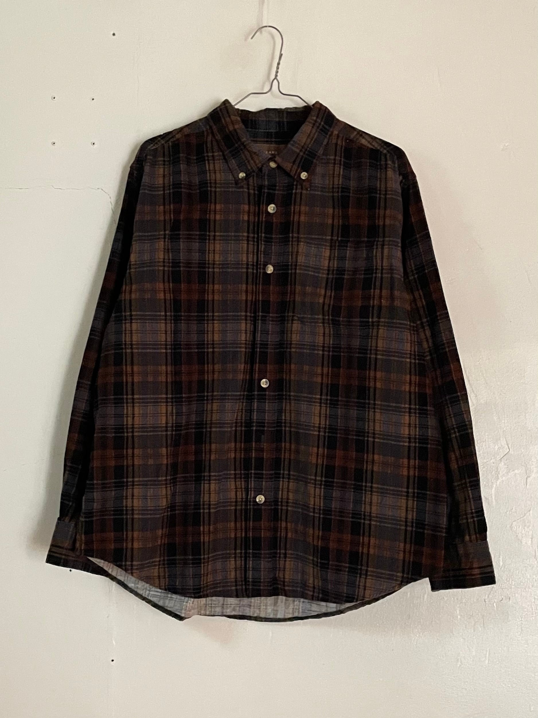 深みのあるブラウンとネイビーを基調としたチェック柄の長袖シャツ。柔らかなコットン素材で、季節を問わず着用しやすい一枚です。ボタンダウン仕様で、カジュアルにもきれいめにも合わせやすいデザイン。デニムやスラックスとの相性も抜群です。