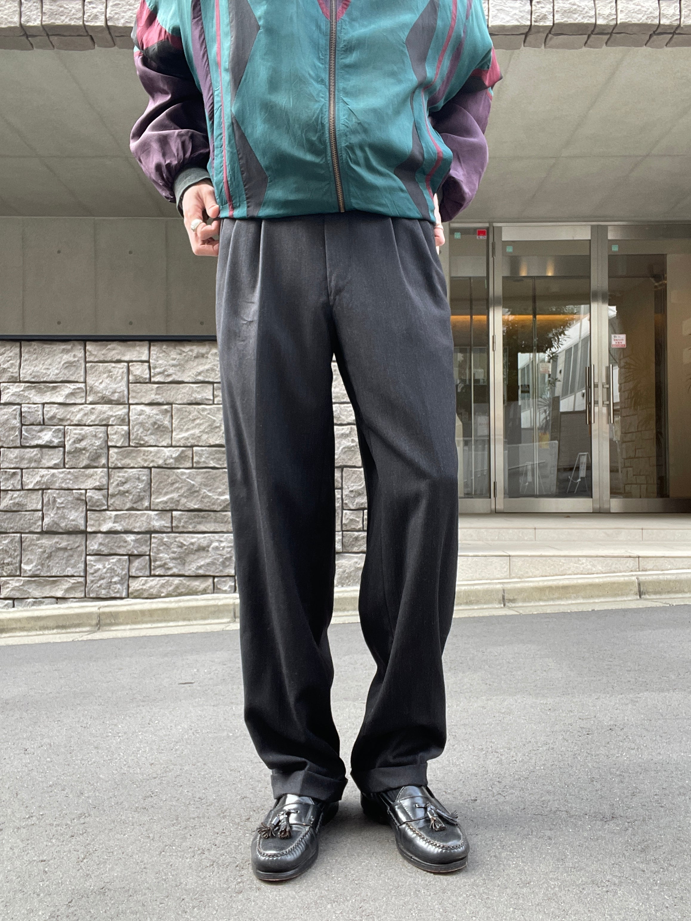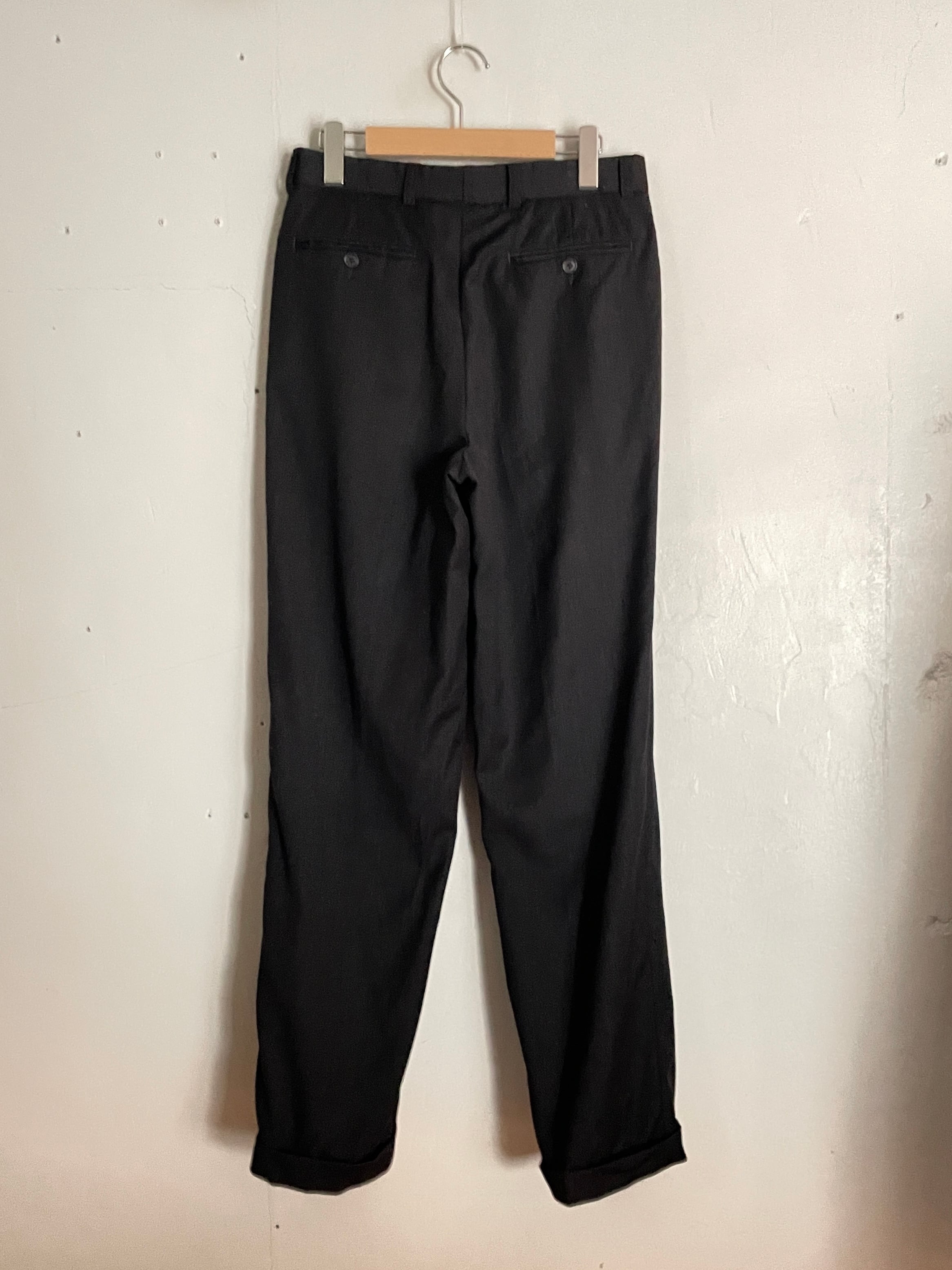 限りなくブラックに近いダークグレーカラーのスラックス。2タック入った綺麗なワイドシルエット。裏地はレーヨンで、表地は質の良いウール素材。履き心地抜群です。レングス長めでしっかりと靴に溜まってくれそうです。様々なファッションに取り入れやすく、間違いなく一本は持っておきたい万能アイテムです。
