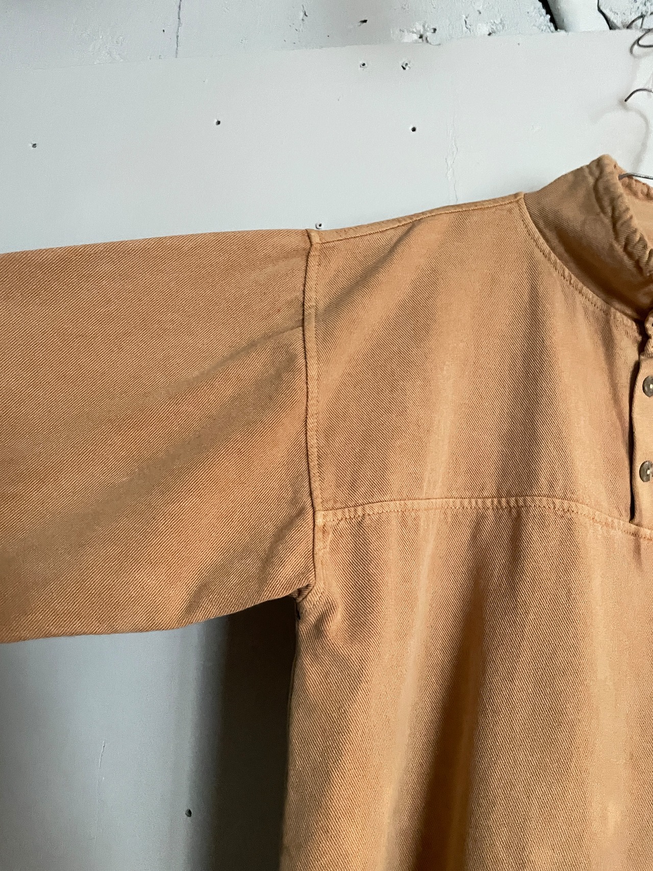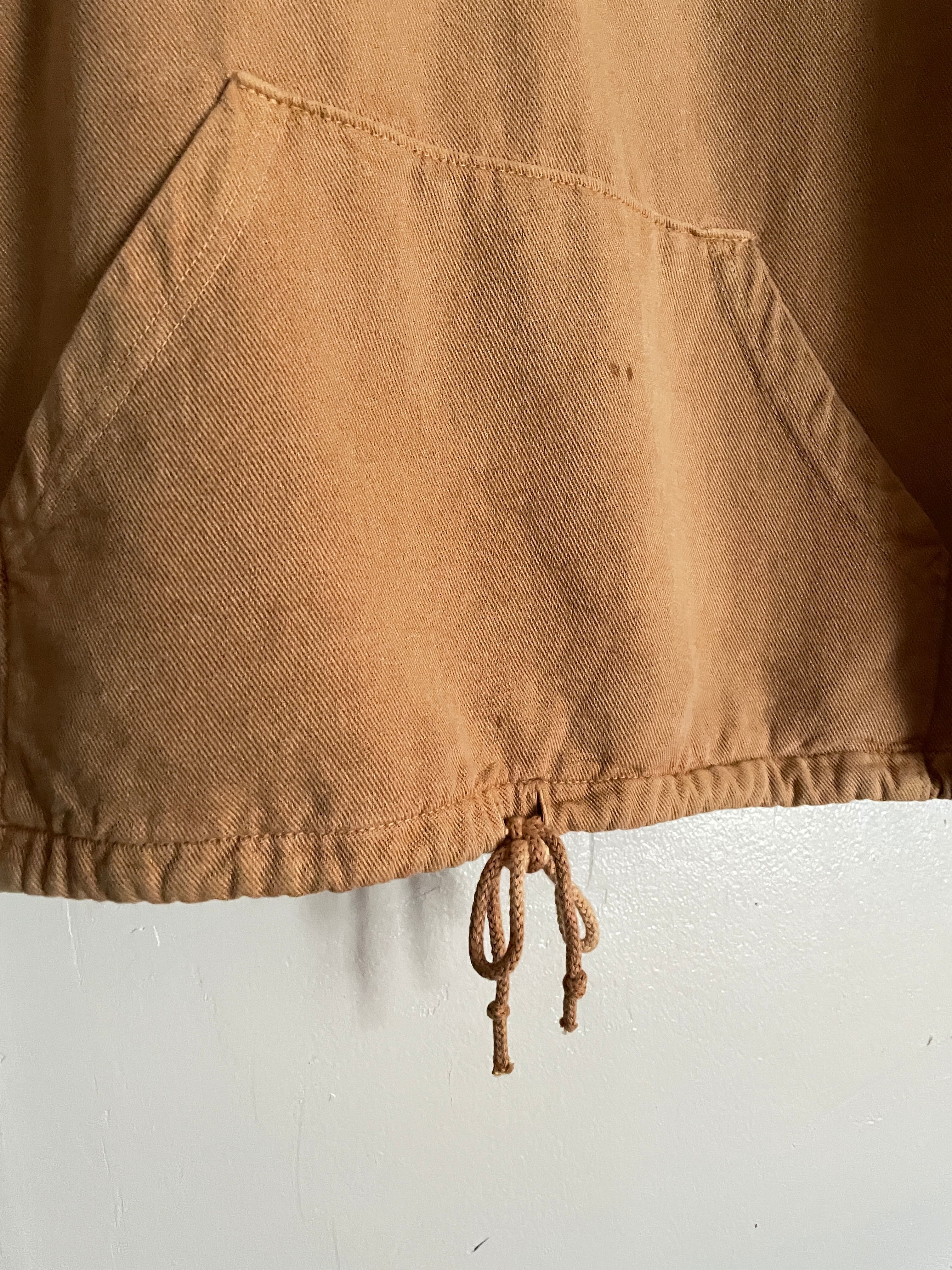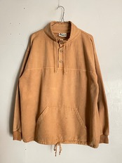 やや褪せたブラウンカラーで、大きめなカンガルーポケット付きの、プルオーバースウェット。ネックは高めでボタン付きの面白いディテール。裾、ネックにはドローコード付きで、縛って着てもお洒落かと思います。ゆったりとしたサイズ感で、ラフに着られて、スタイリングが一枚で決まりそうな一着です。カナダ製なのもポイントが高いです。