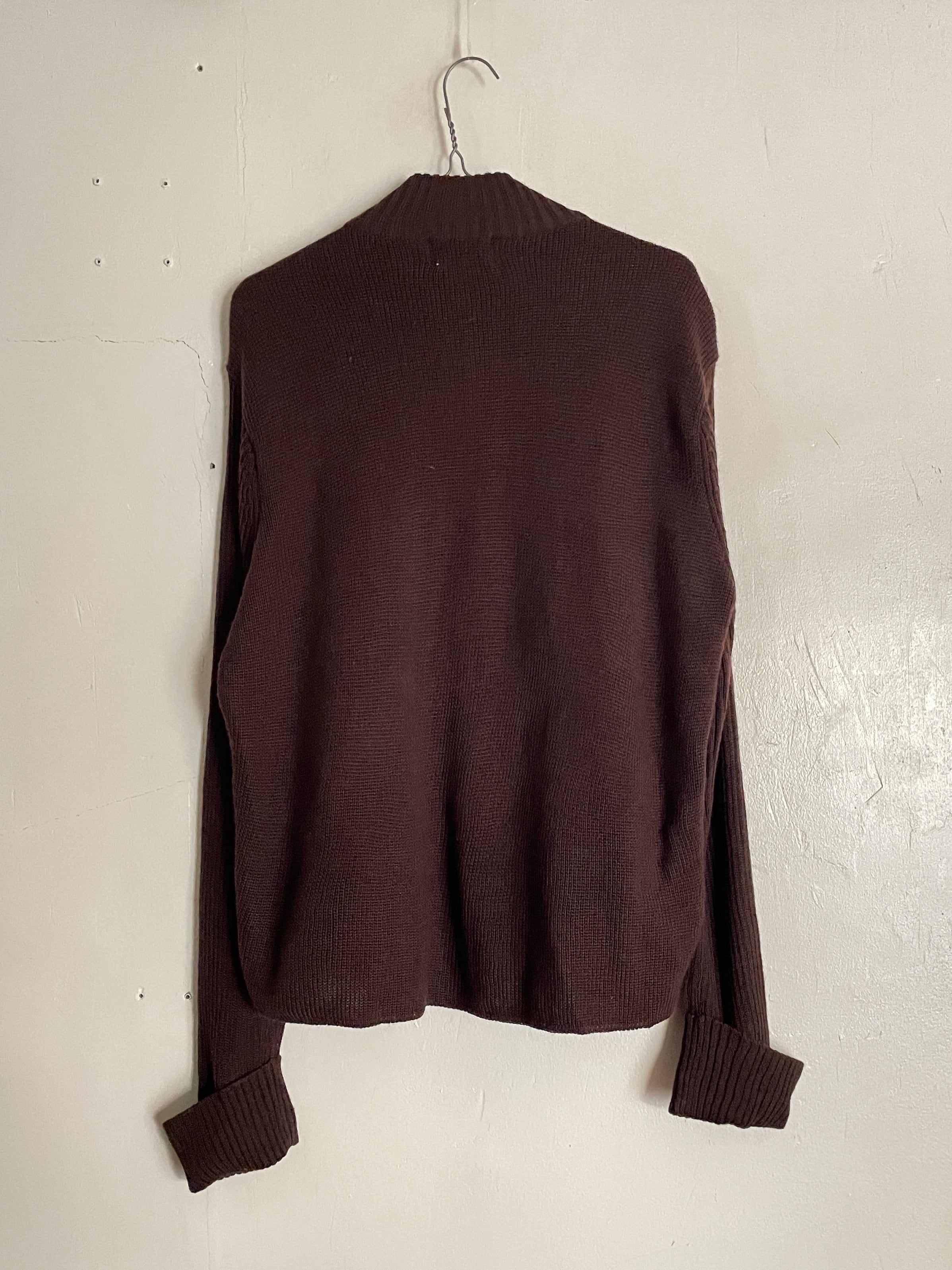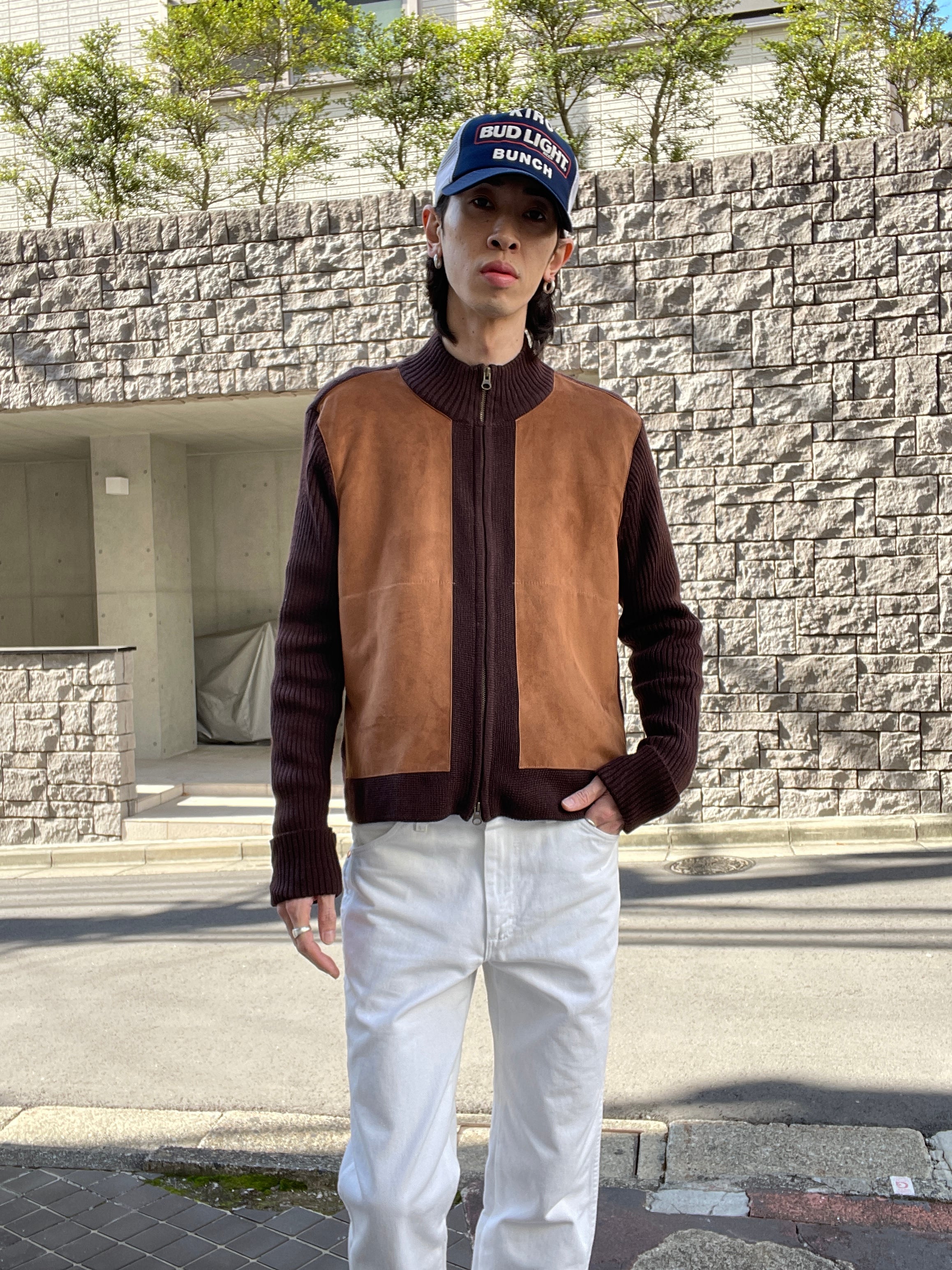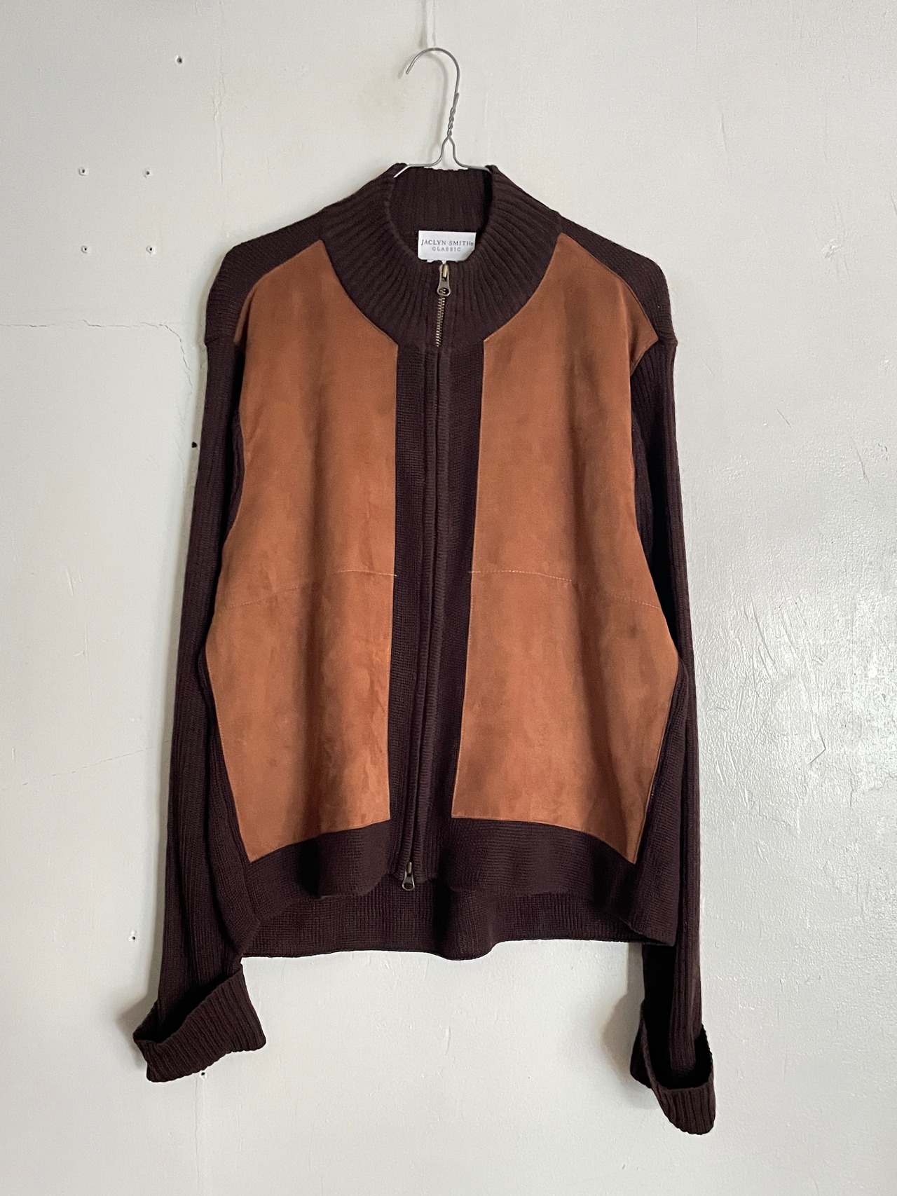 渋さと色気のあるブラウンボディで、フロント部分に大きくフェイクスエードの切り替えが施されたドライバーズニット。このディテールでタグ付きデットストックなのも魅力的。袖が長く、袖口が折り込みデザインになっているのもお洒落です。ダブルジップなのも嬉しいです。細かな部分まで手の行き届いた、こだわりが感じられる一着です。ゆったりとしたサイズ感で、一枚ではもちろん、インナーとしても活躍してくれるアイテムです。